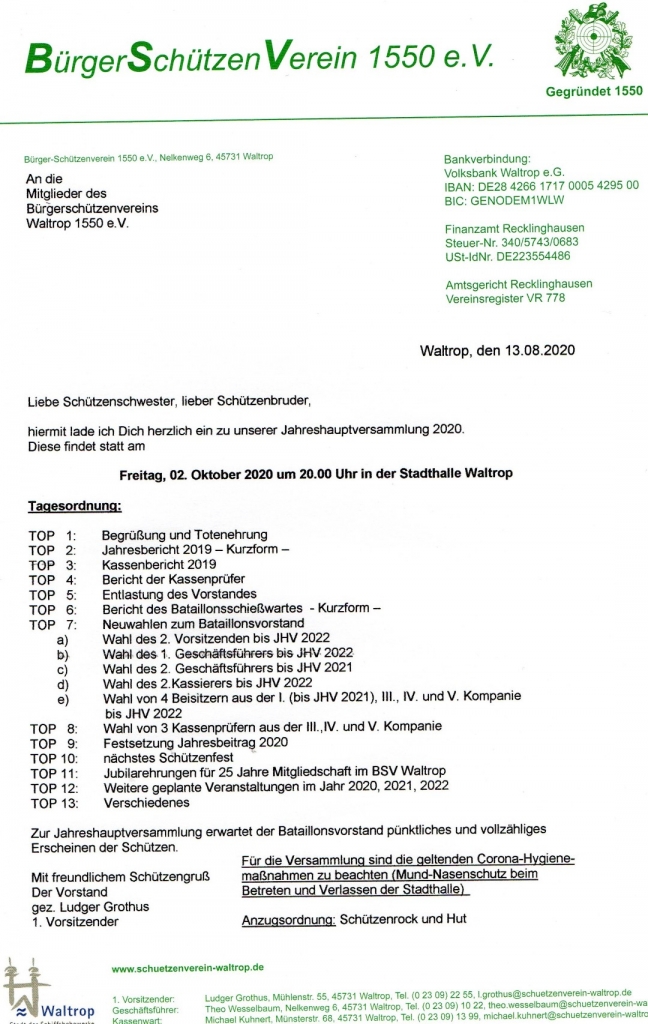 Alle Mitglieder sind daher am Freitag, den 02. Oktober 2020 um 20.00 Uhr in die Stadthalle Waltrop zur Jahreshauptversammlung eingeladen.