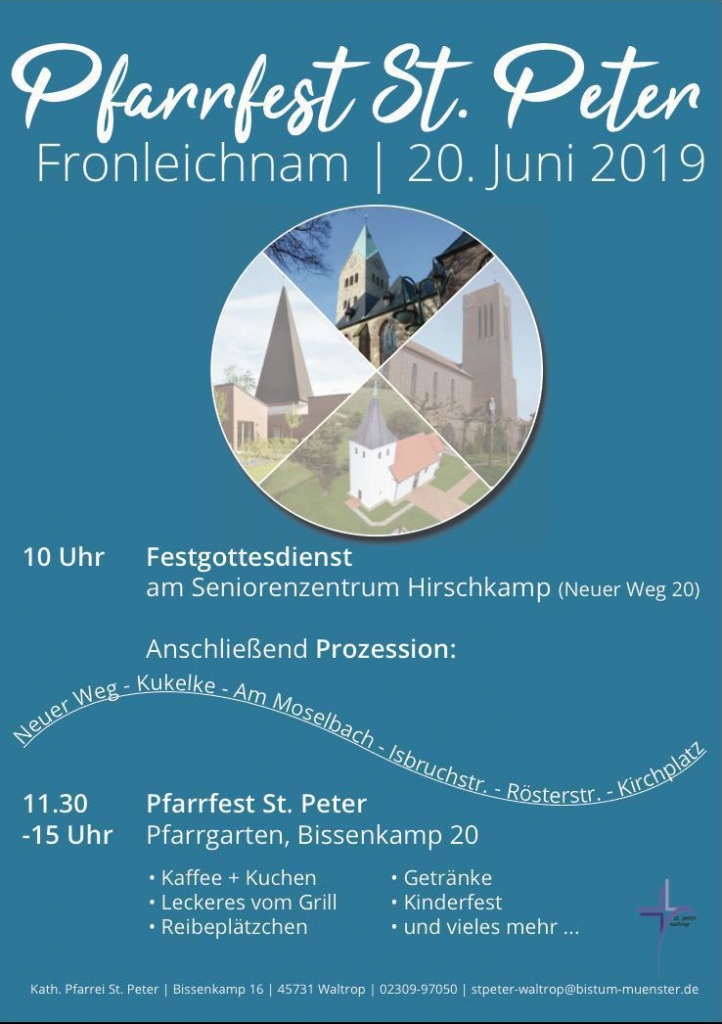 Am kommenden Donnerstag, den 20.06. werden wir wieder an der Prozession zu Fronleichnam teilnehmen. Anschließend findet das Pfarrfest im Pfarrgarten St. Peter statt. Die offizielle Einladung der Kirchengemeinde dazu erreichte uns gestern kurzfristig.