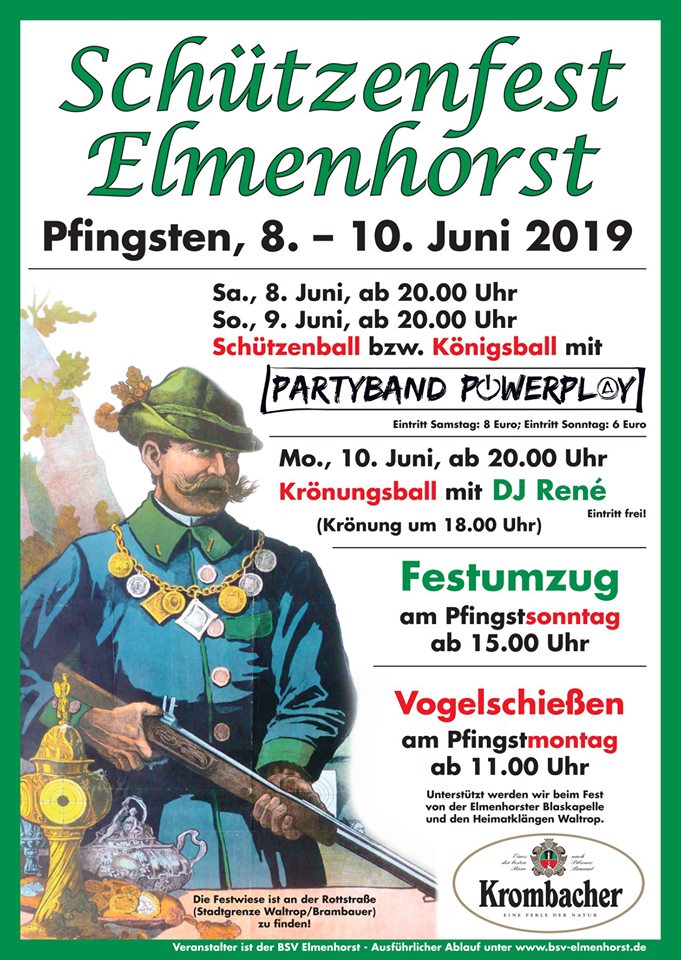 Über Pfingsten feiert der BSV Elmenhorst sein Schützenfest und lädt dazu herzlich ein. Der BSV Waltrop wird am Sonntag, den 09.06.2019 um 14.30 Uhr am großen Festumzug teilnehmen, ein Invalidenwagen wird ebenfalls bereitstehen.