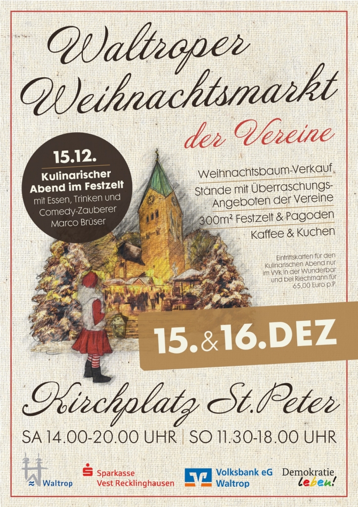 Am Wochenende vom 15. - 16. Dezember 2018 findet ein Weihnachtsmarkt rund um St. Peter statt, neben vielen anderen Vereinen wird sich auch der BSV Waltrop dort beteiligen.