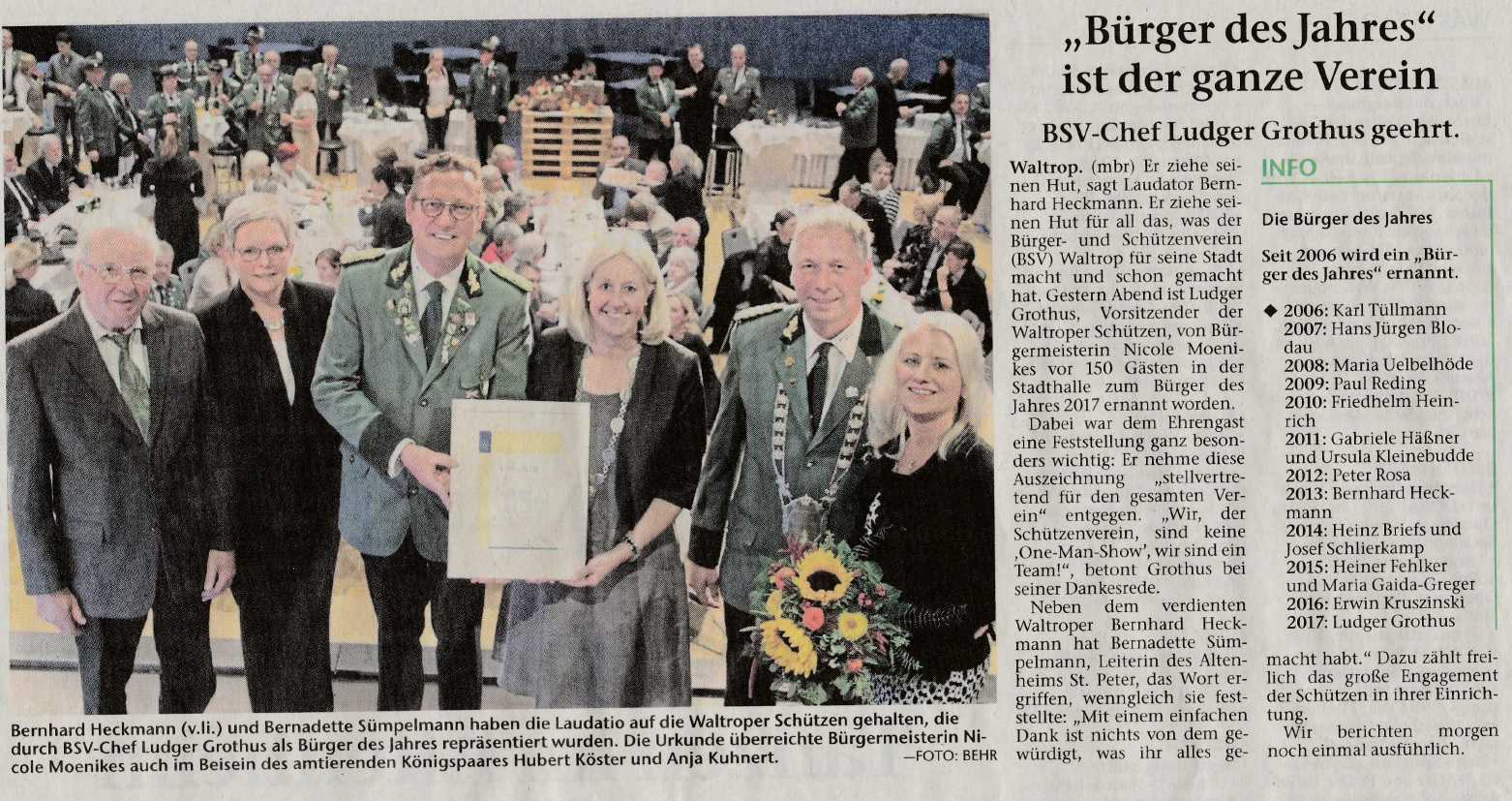 Der BSV Waltrop wurde zum "Bürger des Jahres 2017" ernannt. In feierlichem Rahmen nahm unser Vorsitzender Ludger Grothus in der Stadthalle die Ehrung stellvertretend für den gesamten Verein entgegen.