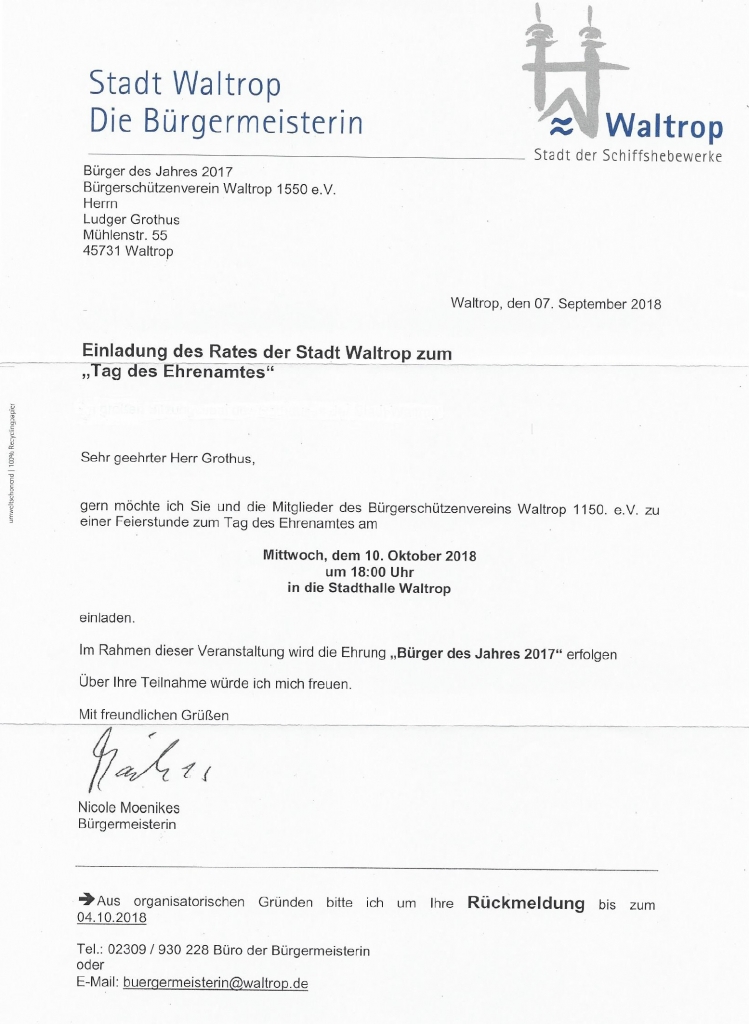 Zum "Tag des Ehrenamtes" wird am Mittwoch, den 10. Oktober der BSV Waltrop geehrt. Unser Vorsitzender Ludger Grothus wird im Rahmen dieser Veranstaltung die besondere Ehrung "Bürger des Jahres 2017" stellvertretend für den BSV Waltrop entgegennehmen.