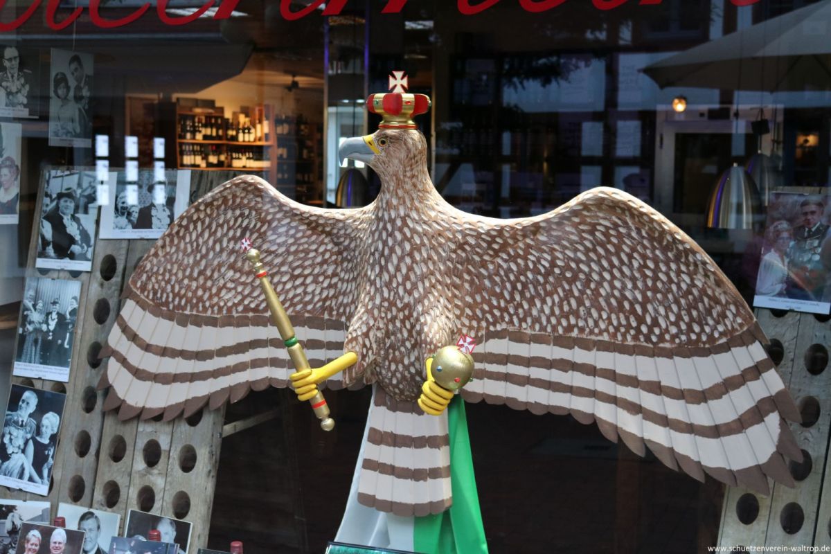 Unser Schützenvogel ist an seiner Zwischenstation im Schaufenster des Hauses Riechmann angekommen. Dort kann er nun bis zum Schützenfest angeschaut werden.