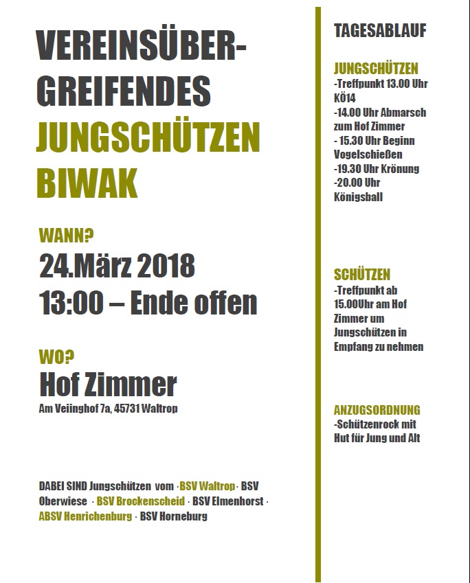 Die Jungschützen der verschiedenen Vereine werden nach einem gemeinsamen Treffen an der Kö14 und kleinem Marsch ab 15:30 Uhr auf den Vogel anlegen, bereits davor sind auch alle anderen Schützen eingeladen, ab 15 Uhr auf dem Hof Zimmer anzutreten um die Jungschützen in Empfang zu nehmen.