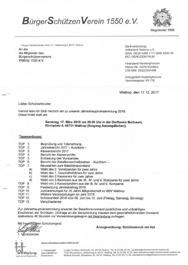 Am Samstag, den 17.03.2018 findet die Jahreshauptversammlung 2018 statt. Beginn ist um 20:00 Uhr in der Dorftenne Burbaum, Kirchplatz 4, 45731 Waltrop.