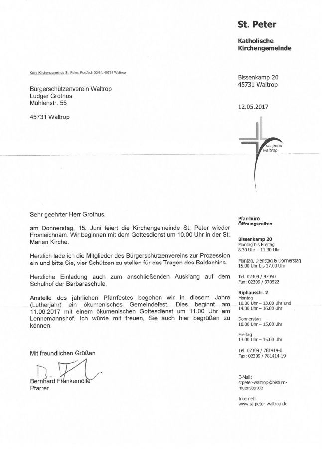 Die Schützen des BSV Waltrop nehmen traditionell an der Prozession teil, auch sind wir wieder für das Tragen des Baldachin zuständig.