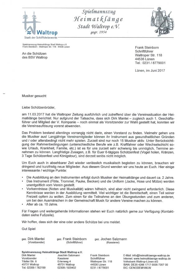 Ohne Musikkapelle marschiert es sich nicht sonderlich gut - das mussten wir beim letzten Ausmarsch in Oberwiese erst wieder feststellen. Normalerweise begleiten uns bei Ausmärschen und Veranstaltungen die Waltroper Heimatklänge. Die Spielleute dort werden allerdings immer weniger und so stand der Verein letztens sogar fast vor der Auflösung.