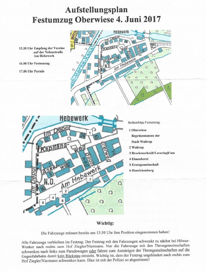 Trotz eines geänderten Ablaufes bleibt der große Festumzug am Sonntag bestehen. Wir treten dazu am Sonntag, den 04.06. um 15:30 Uhr wie üblich auf der Nebenstraße Am Hebewerk an, der Umzug soll um 16:00 Uhr starten.