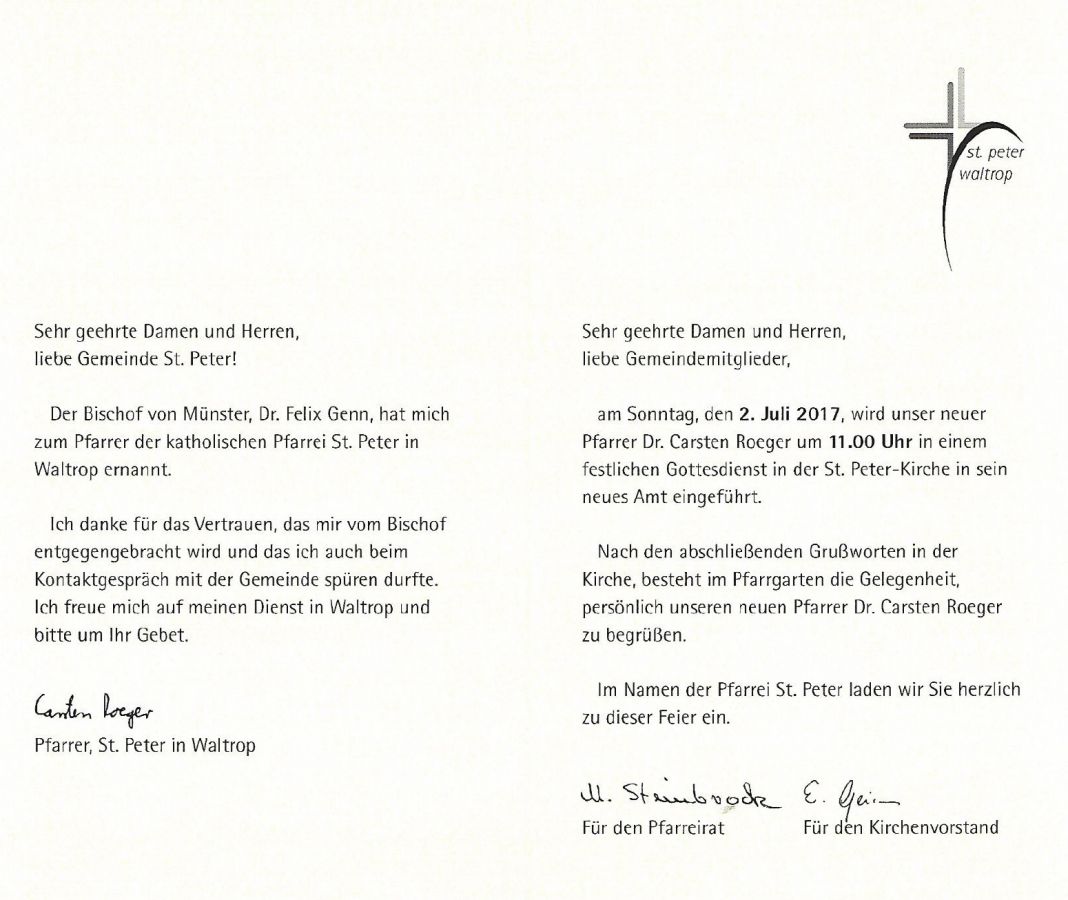 Zur Einführung des neuen Pfarrers Dr. Carsten Roeger wird es am Sonntag, den 02.07. einen festlichen Gottesdienst in der Kirche St. Peter geben. Der Gottesdienst beginnt um 11:00 Uhr, im Anschluss besteht im benachbarten Pfarrgarten die Gelegenheit, den Pfarrer zu begrüßen.