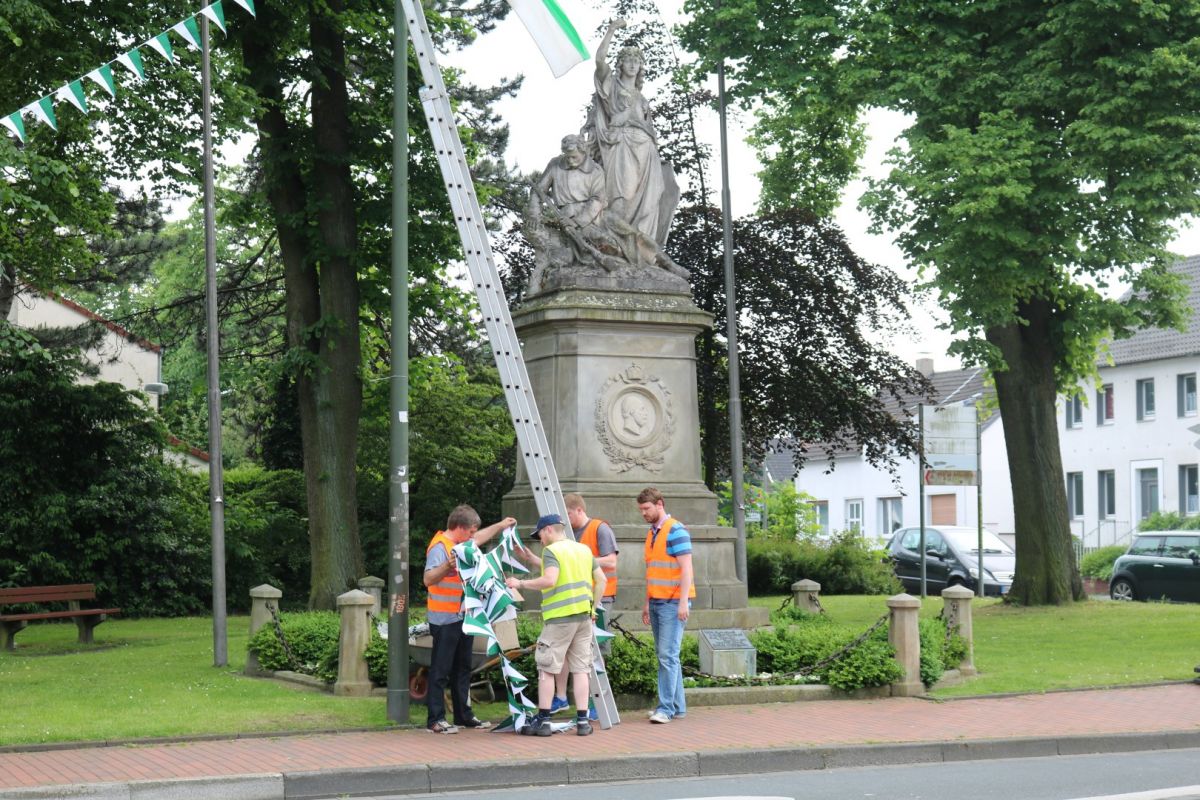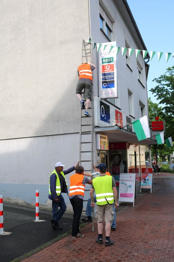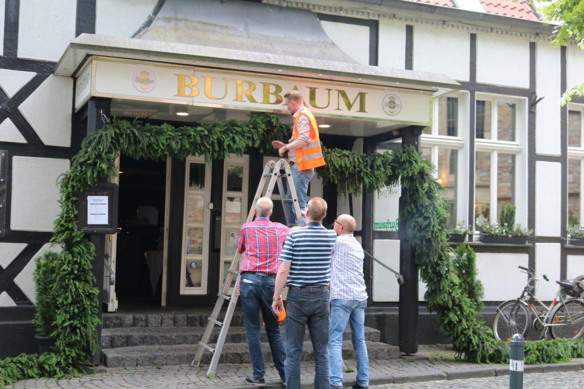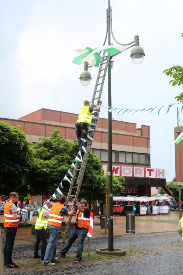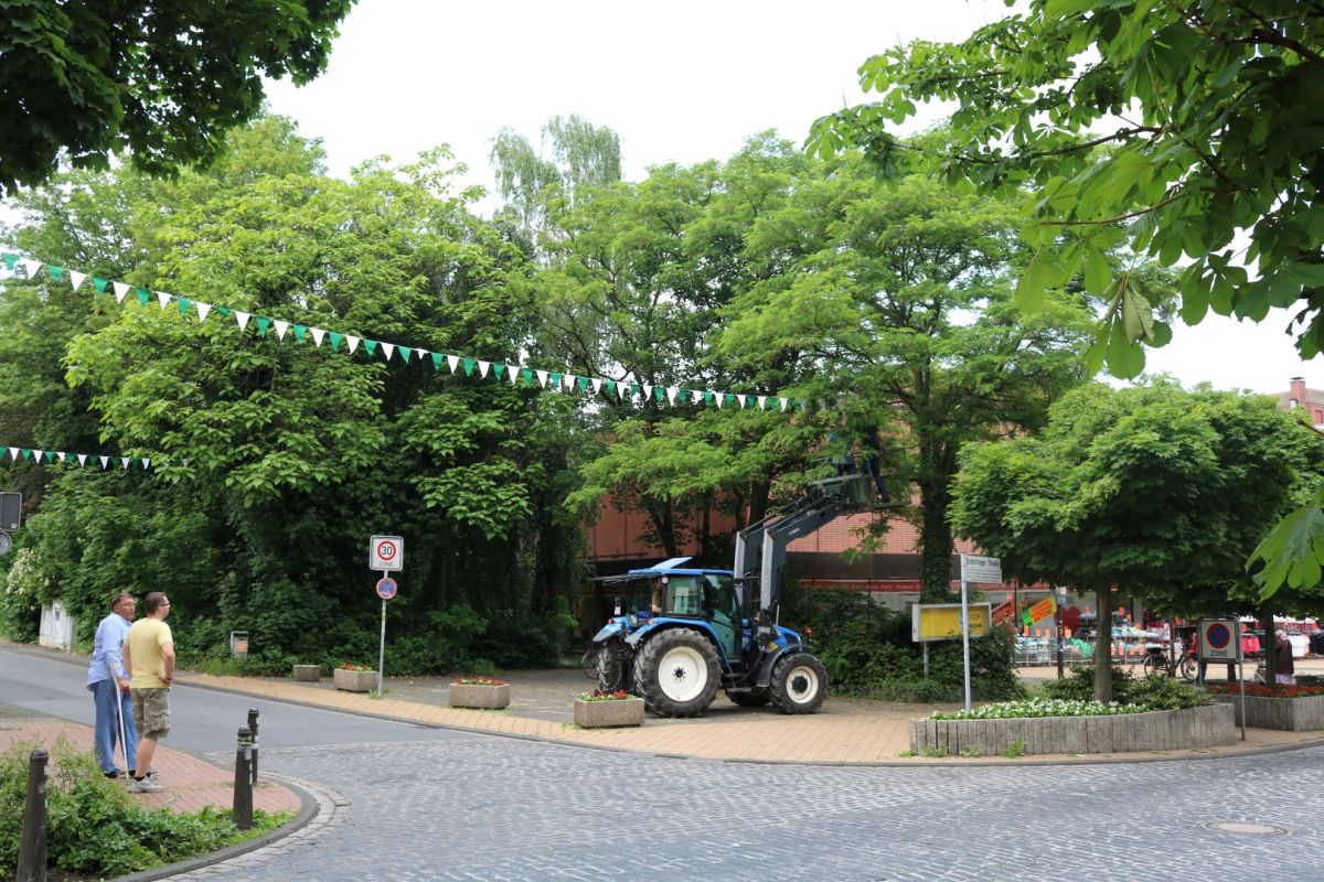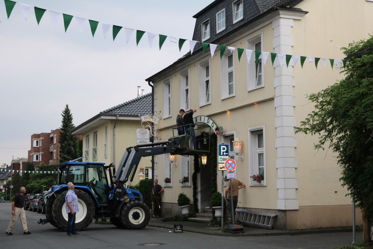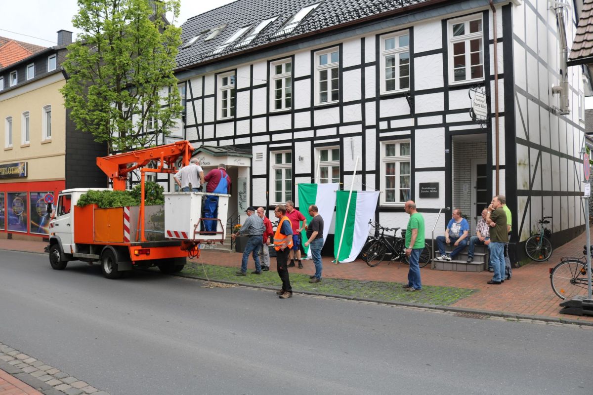 Ausgestattet mit Leitern, Trecker und Hubsteiger machten sich viele fleißige Helfer in kleinen Kolonnen auf den Weg, um beispielsweise die komplette Hochstraße mit Wimpelketten und Birkengrün zu schmücken.