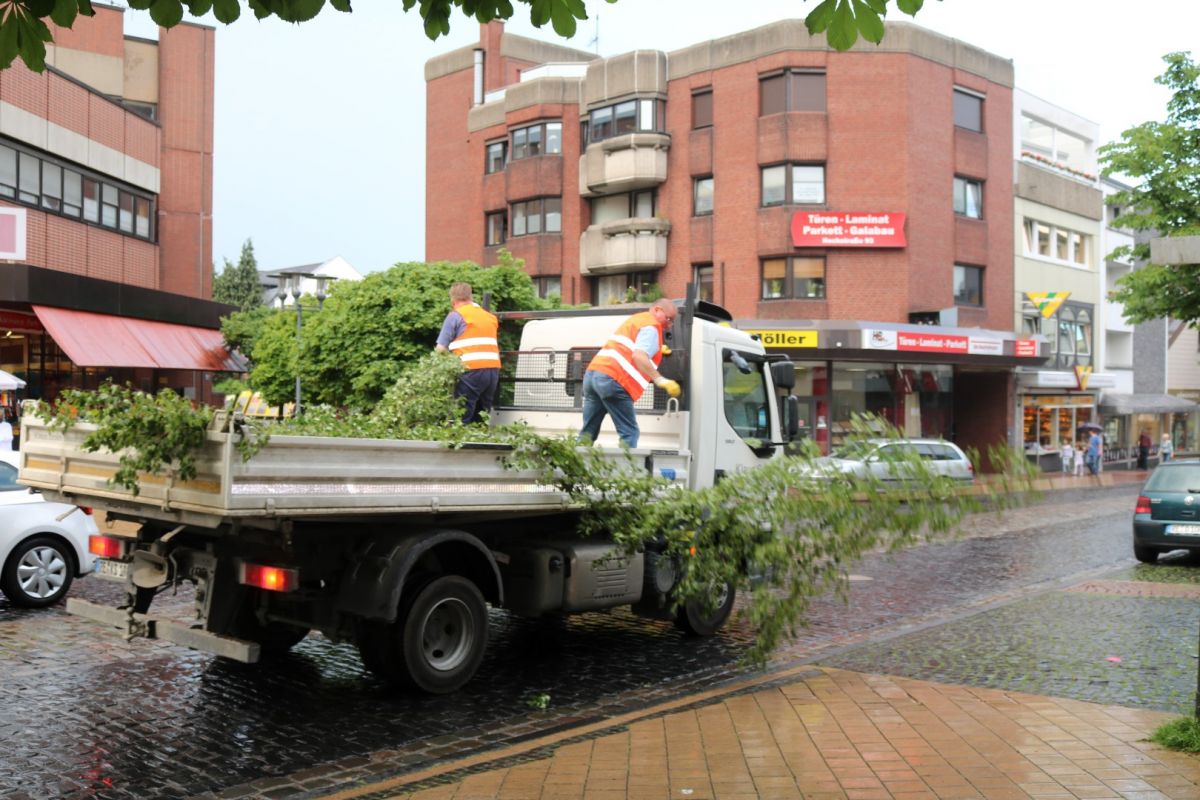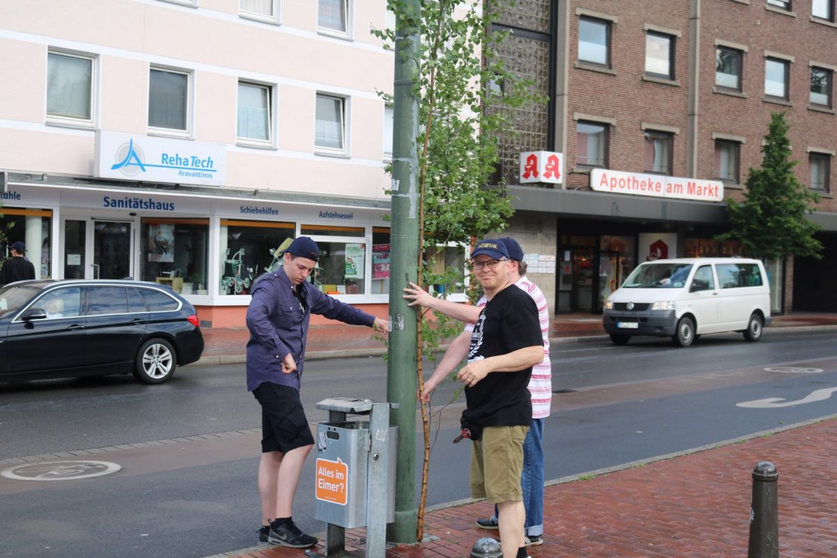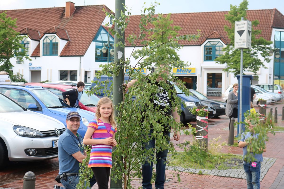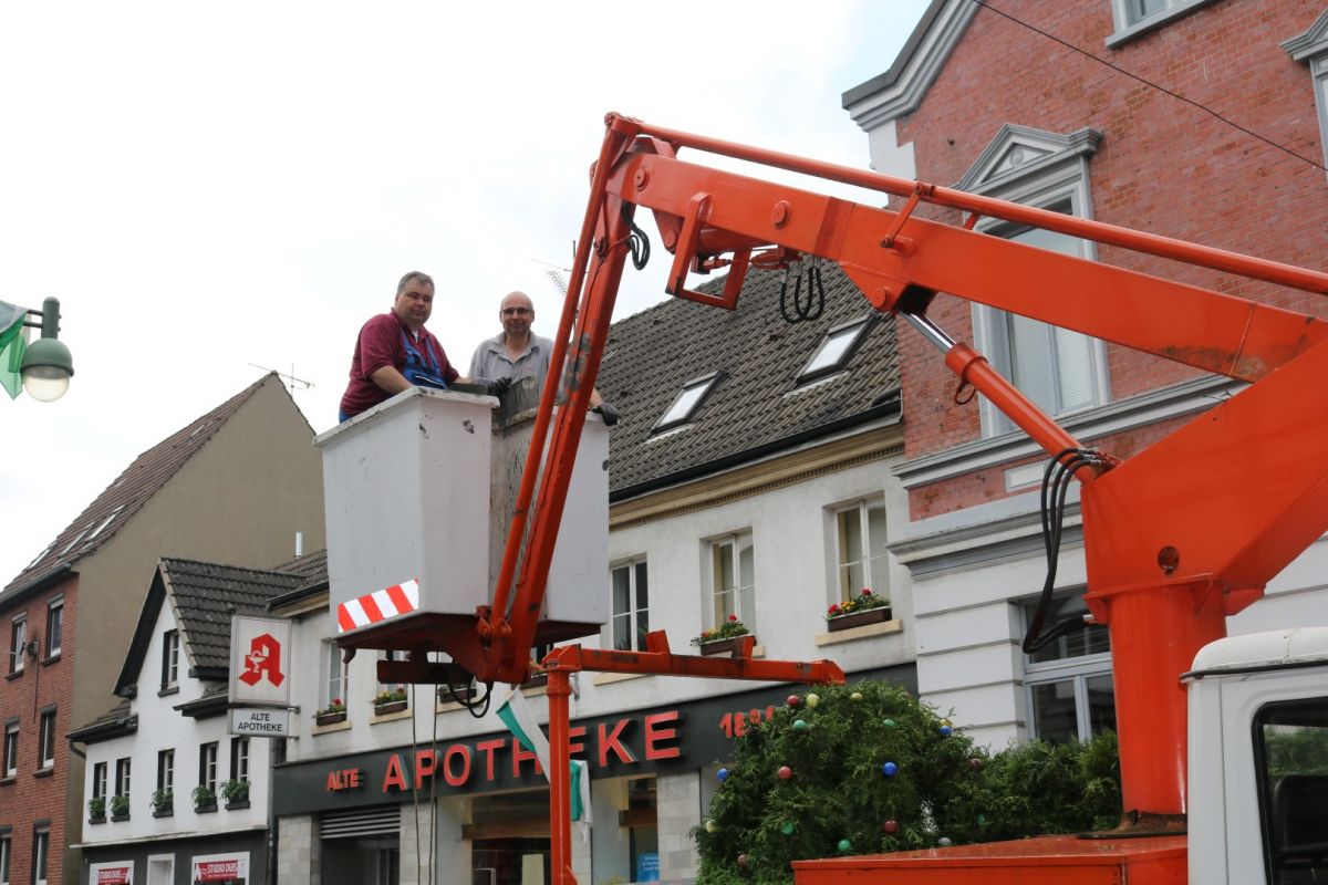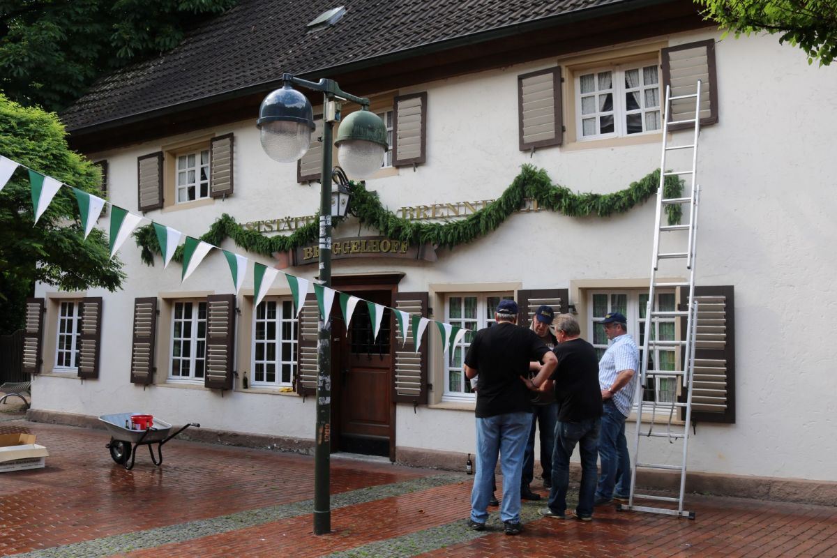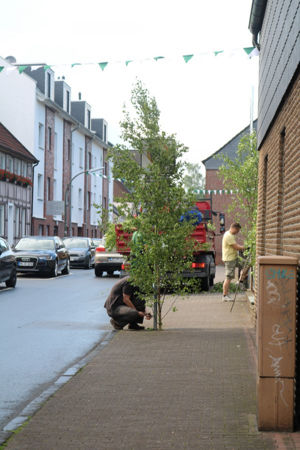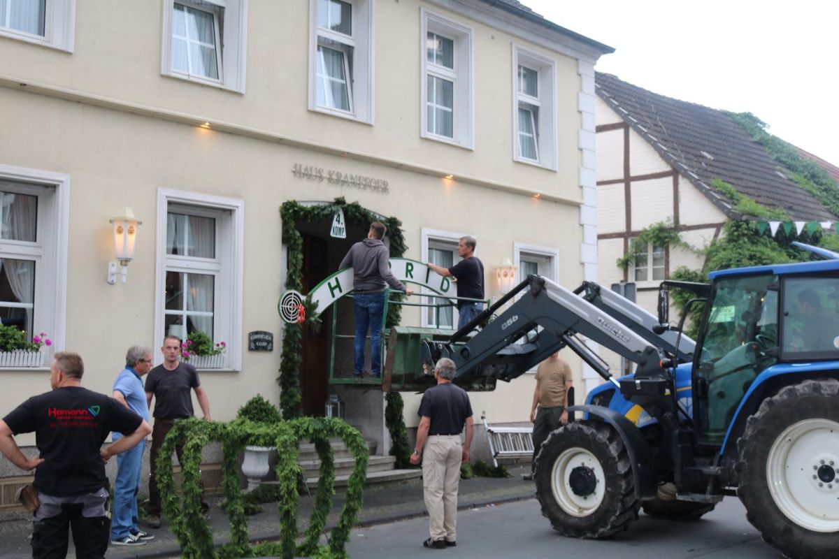 Ausgestattet mit Leitern, Trecker und Hubsteiger machten sich viele fleißige Helfer in kleinen Kolonnen auf den Weg, um beispielsweise die komplette Hochstraße mit Wimpelketten und Birkengrün zu schmücken.