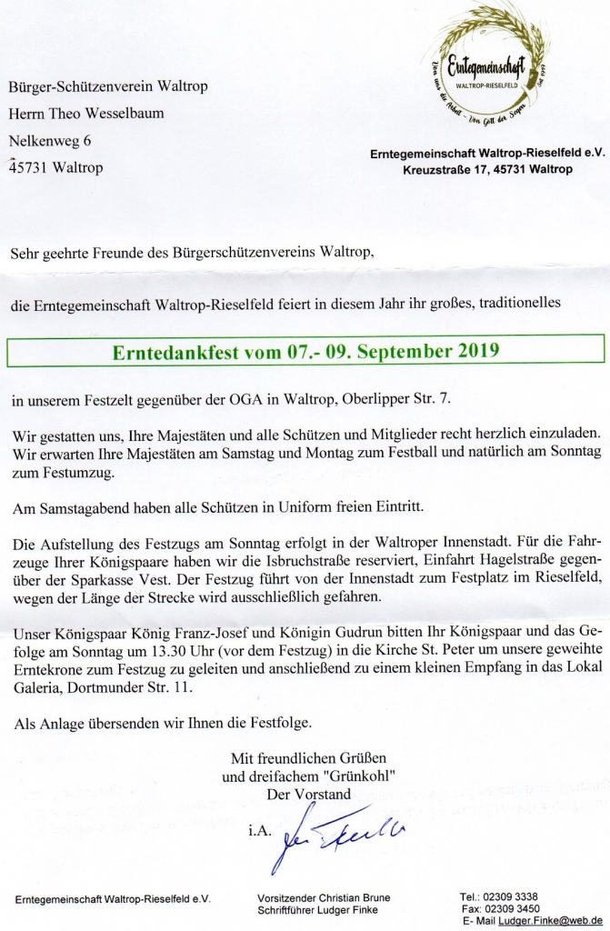 Die Erntegemeinschaft Waltrop-Rieselfeld lädt wieder herzlich zu ihrem Erntedankfest vom 07.09. - 09.09. ein.