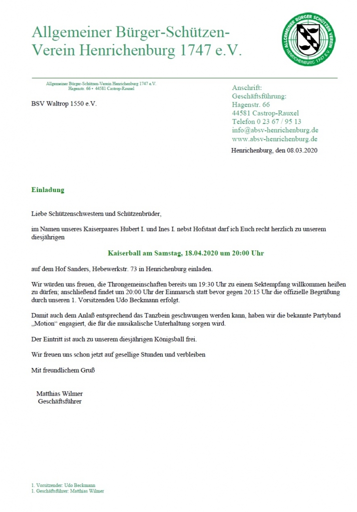Auch der ABSV Henrichenburg zieht Konsequenzen aus der derzeitigen Corona-Entwicklung und sagt den geplanten Kaiserball für den 18.04.2020 ab! Ein Nachholtermin wird rechtzeitig bekannt gegeben.
