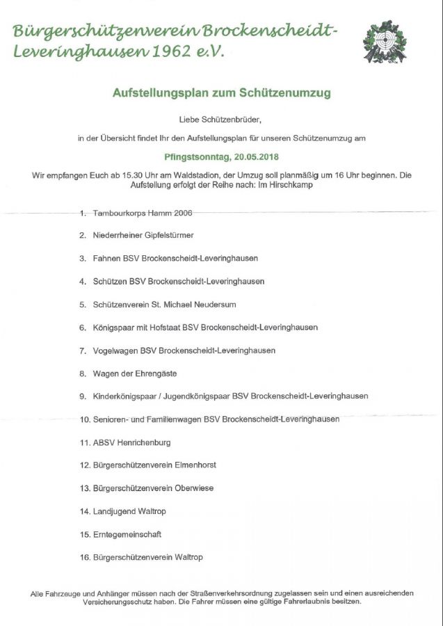 Zum großen Festumzug am Sonntag, den 20.05.2018 treffen wir uns um 15:30 Uhr an der Ecke Im Hirschkamp / Waldstadion. Der Marsch wird uns dabei durch Brockenscheidt, mit Parade an der Kettelerstraße und im Anschluss zum Festzelt auf dem Hof Remmelmann, Büscherstr. 35 führen.