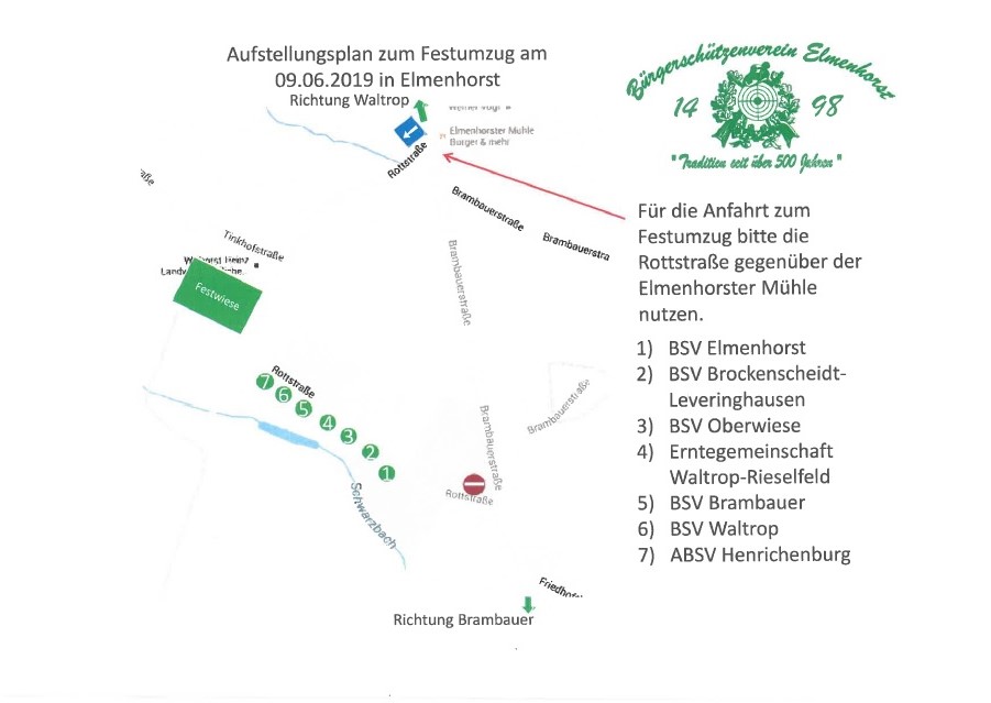 Der BSV Elmenhorst lädt über Pfingsten zum Schützenfest ein, natürlich wird auch der BSV Waltrop am großen Festzug am Sonntag, den 09.06.2019 teilnehmen. Ab 14.30 Uhr beginnt der Empfang der Gastvereine, der Umzug soll um 15.00 Uhr starten.