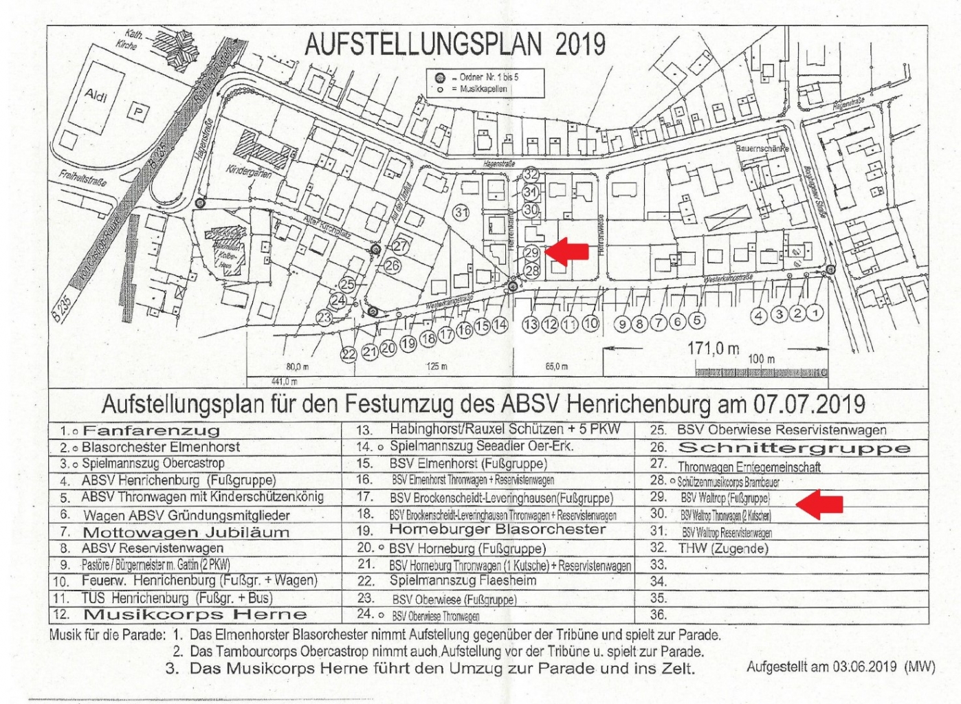 Wir treffen uns dazu um 15.30 Uhr in der Straße "Herrenkamp", der Umzug startet um 16.00 Uhr. Im Festzug werden wir wieder an letzter Stelle mitlaufen (Punkt 29, Aufstellungsplan)