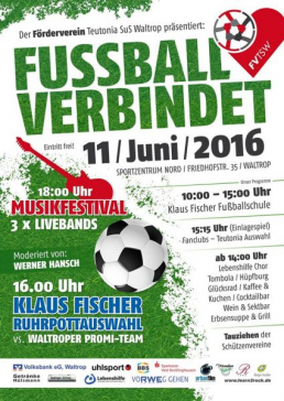 Beginn der Veranstaltung ist bereits morgens ab 10 Uhr mit der "Klaus Fischer Fußballschule", während das Rahmenprogramm mit Kuchen, Grill, Getränken, Tombola und vielem mehr ab 14 Uhr starten soll. Gegen 15:15 Uhr wird ein kleines Fußballspiel zwischen verschiedenen Fanclubs und einer Teutonia Auswahl stattfinden, während um 16 Uhr ein Highlight des nachmittages folgen wird. Unter der Moderation von Werner Hansch wird die Klaus Fischer Ruhrpottauswahl gegen ein Waltroper Promi-Team antreten.
