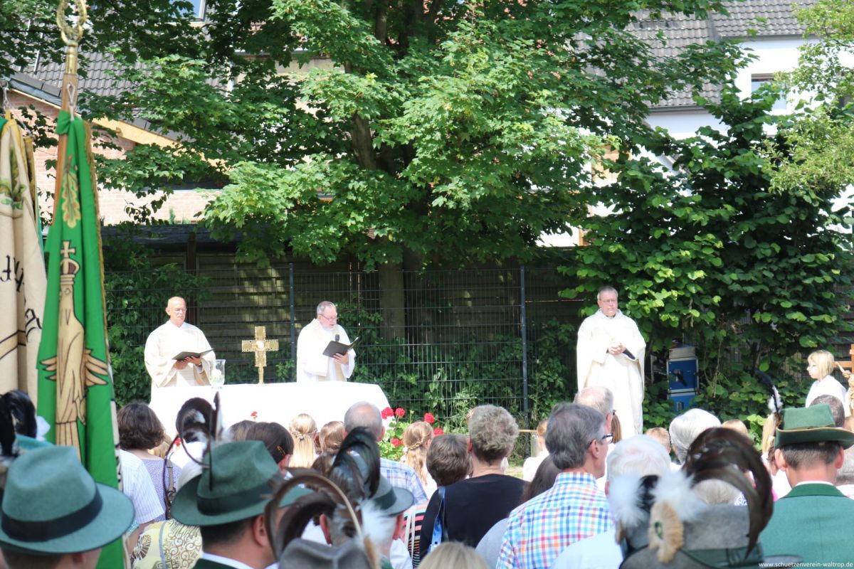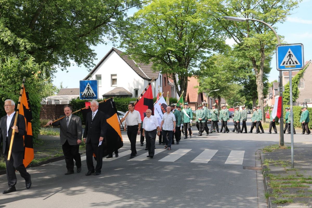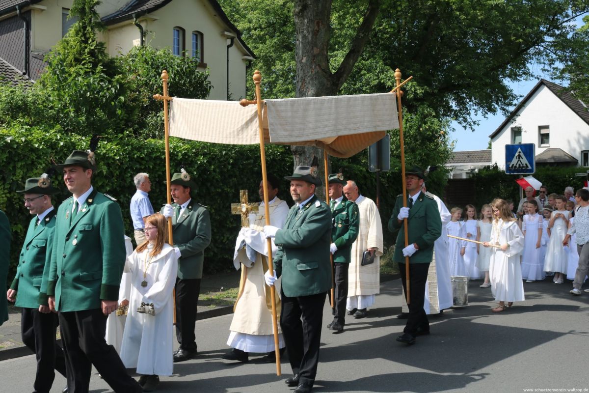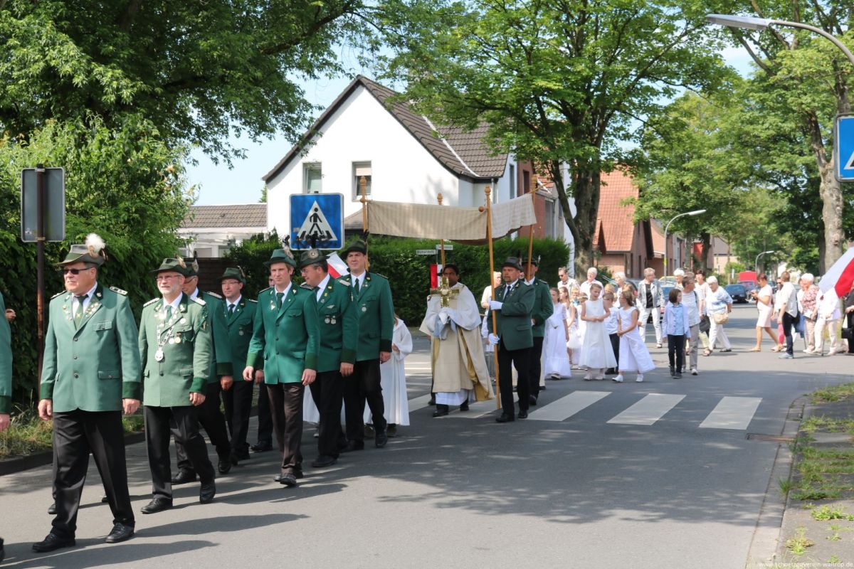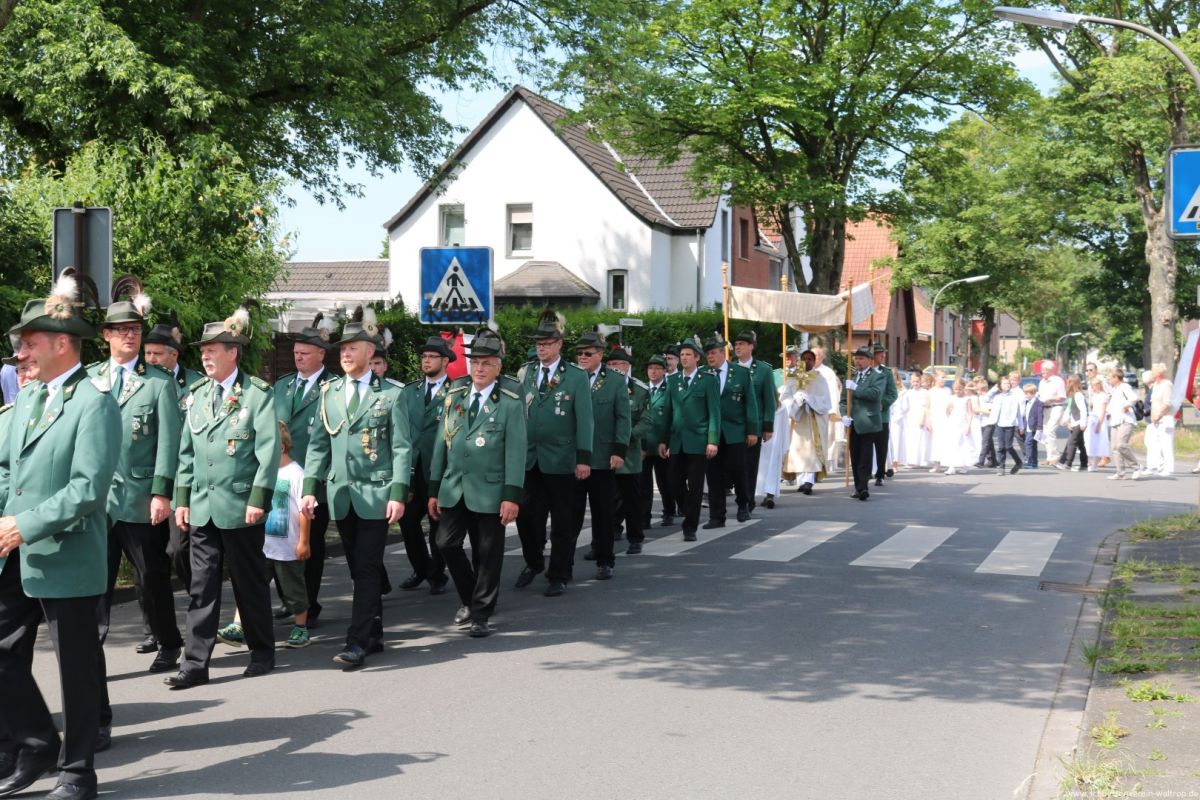 Nach Ende der Messe begann der traditionelle Zug durch die Straßen. Das Tragen des Baldachin übernahmen in diesem Jahr die Schützen aus Brockenscheidt-Ketteler und Elmenhorst. Da das Ziel der Hof der Barbaraschule sein sollte war der Weg entsprechend kurz, die meisten Beteiligten darüber allerdings auch durchaus froh. Die Sonne schien in vollen Zügen und sorgte bereits am morgen für entsprechend hohe Temperaturen.