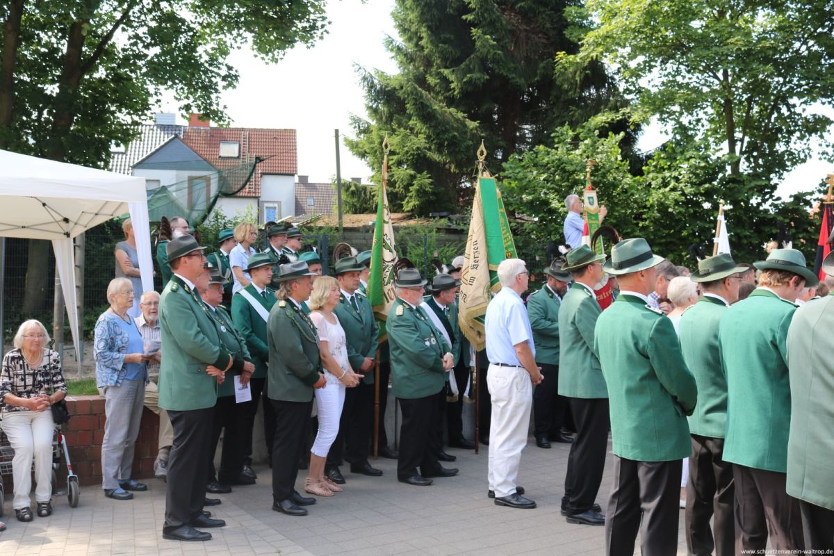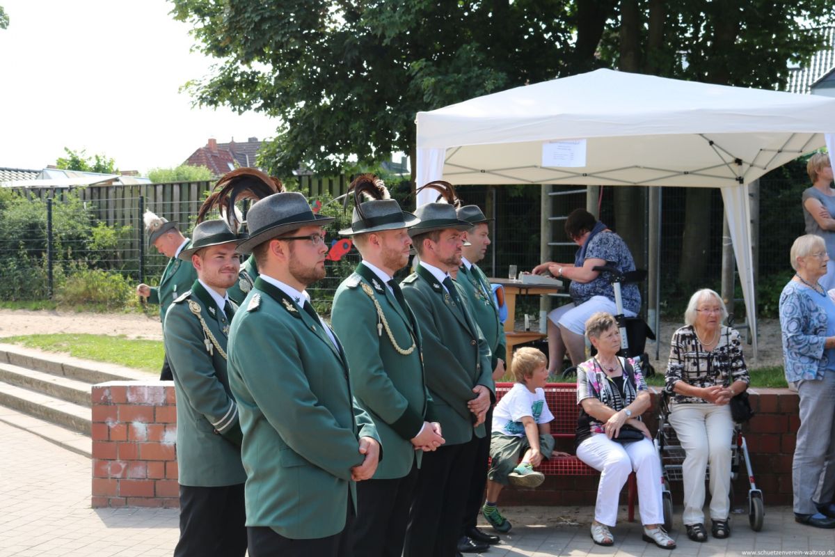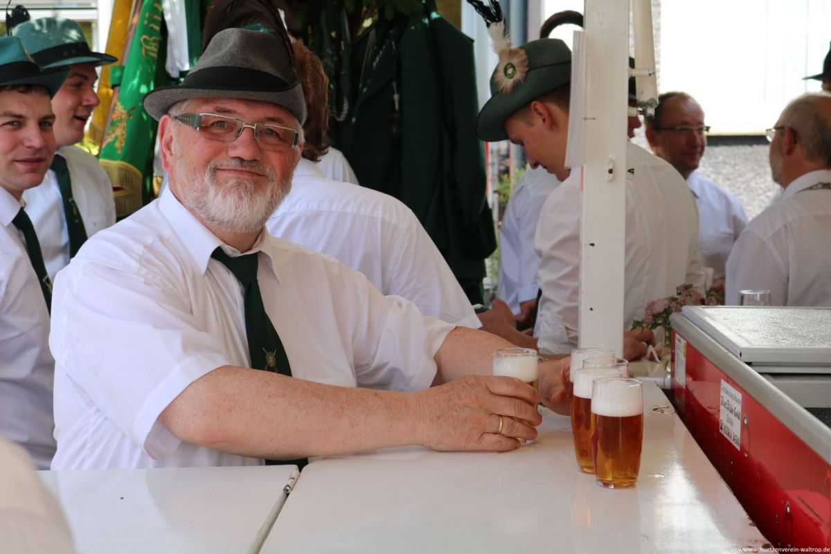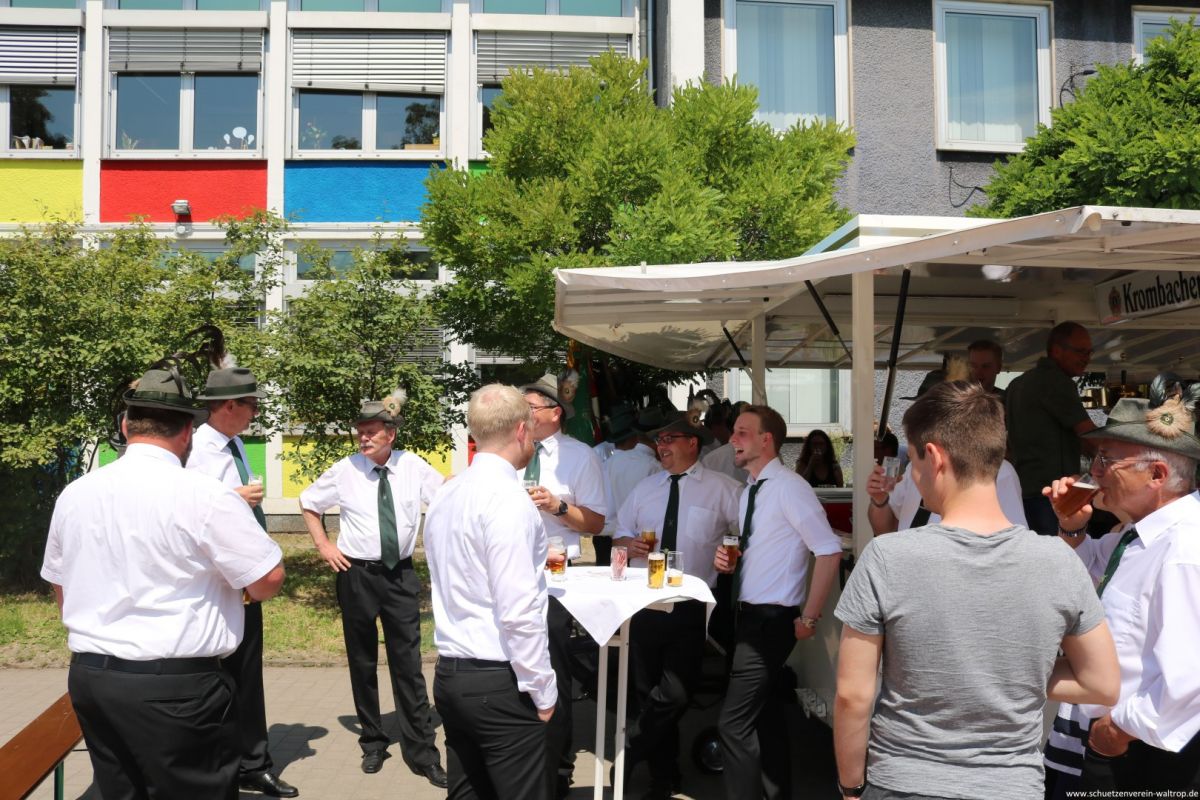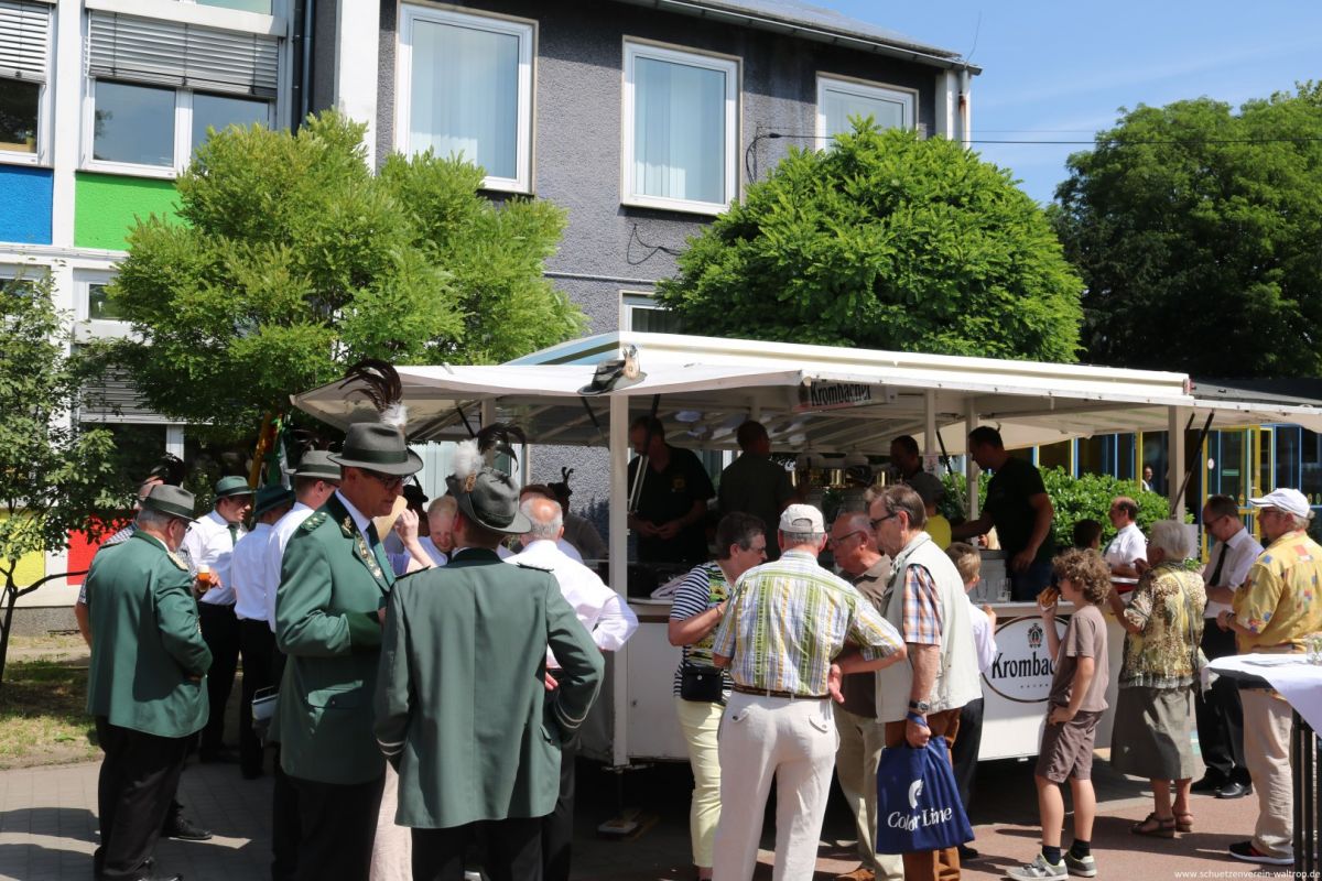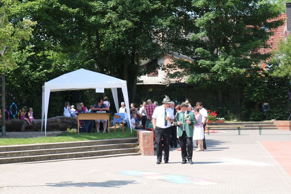 Nach Ende der Messe begann der traditionelle Zug durch die Straßen. Das Tragen des Baldachin übernahmen in diesem Jahr die Schützen aus Brockenscheidt-Ketteler und Elmenhorst. Da das Ziel der Hof der Barbaraschule sein sollte war der Weg entsprechend kurz, die meisten Beteiligten darüber allerdings auch durchaus froh. Die Sonne schien in vollen Zügen und sorgte bereits am morgen für entsprechend hohe Temperaturen.