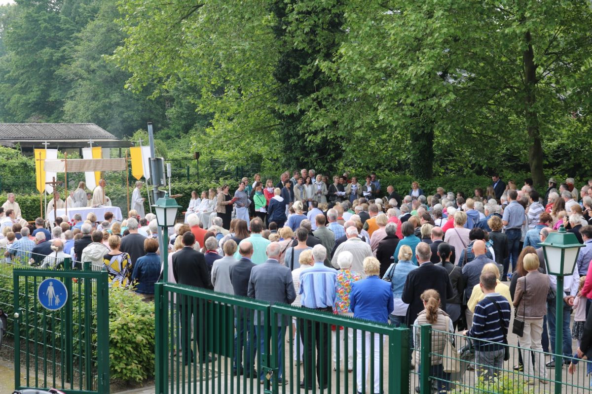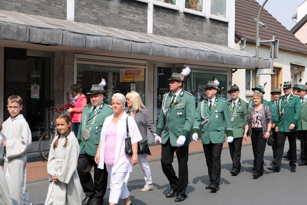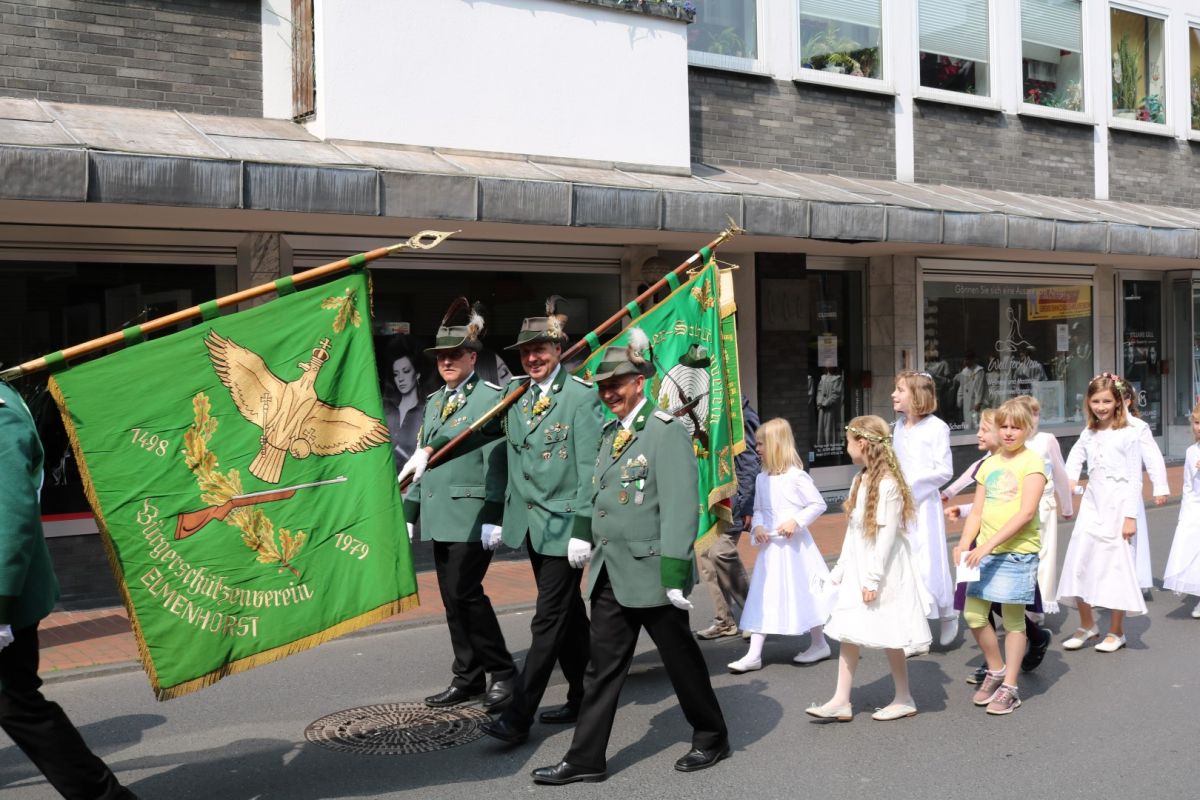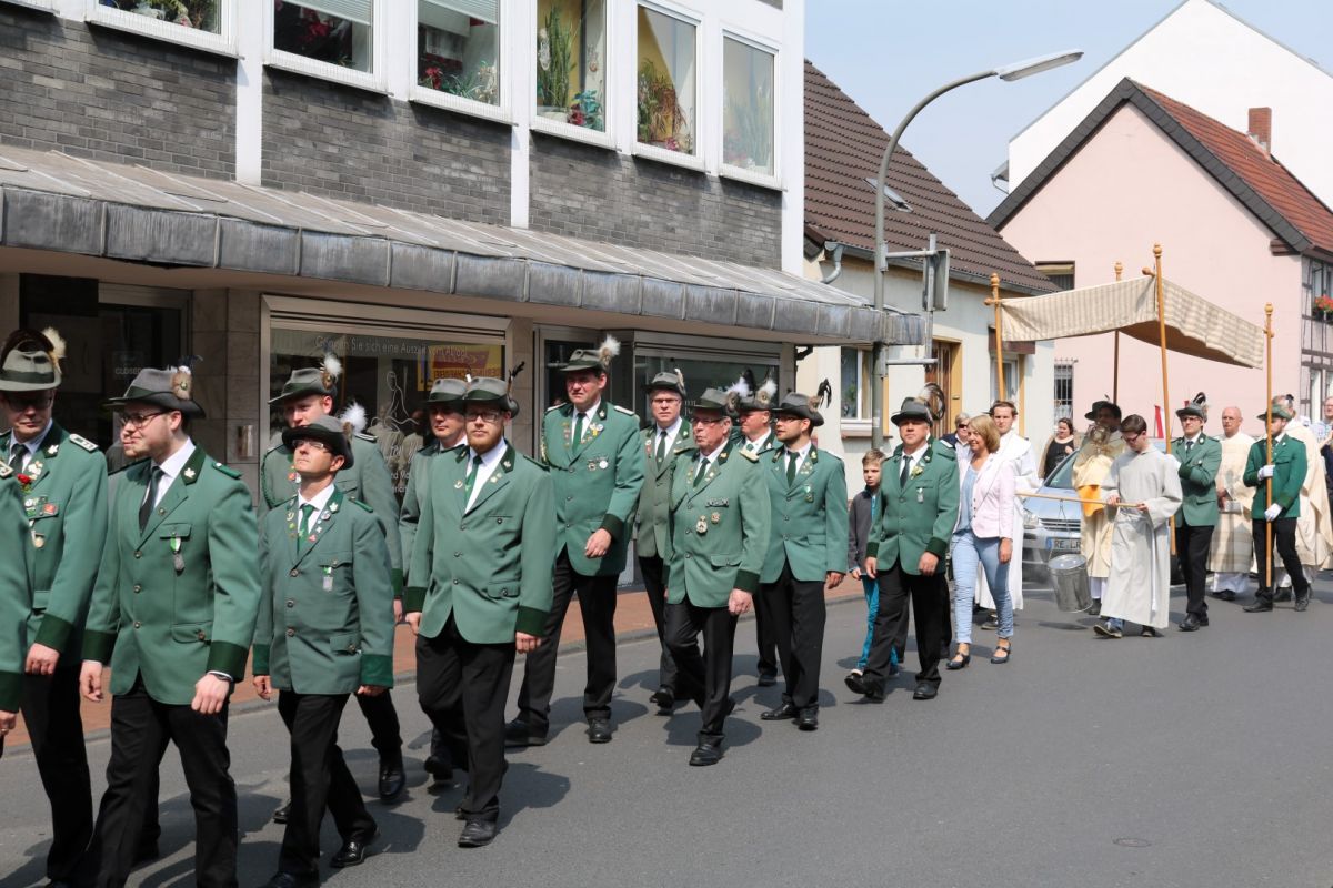 Auf dem Gelände der Kleingärtner gab es zunächst einen kleinen Gottesdienst, bevor die Prozession sich in Bewegung setzte. Traditionell tragen die Waltroper Schützen den Baldachin, dieses Jahr trugen neben 2 Schützen des BSV Waltrop auch je ein Schütze des BSV Elmenhorst und des BSV Brockenscheidt-Ketteler.