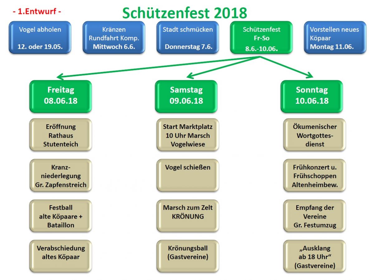 Hier nun zur Übersicht ein möglicher Ablaufplan für das Schützenfest 2018. Bei dieser Übersicht, die der Bataillonsvorstand ausgearbeitet hat, handelt es sich lediglich um einen ersten, groben Entwurf wie das Fest ablaufen könnte, keinesfalls jedoch um eine bereits festgelegte Reihenfolge. Es gibt noch viele weitere Ideen und Änderungsmöglichkeiten, die im Laufe der nächsten Zeit diskutiert und abgewogen werden.
