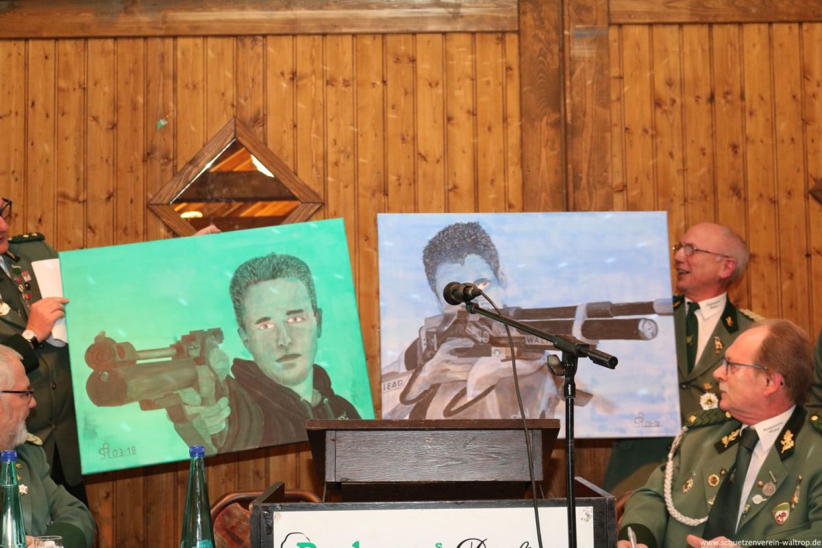 Franz hatte im Gegenzug allerdings auch noch etwas vorbereitet. Auf dem Schießstand gibt es seit der Renovierung eine große, leere Wand, die dringend eine Verschönerung nötig hat. Franz fand nun in dem ehemaligen Elmenhorster Schützenkönig Bernhard Schulze-Langenhorst einen Künstler, der zwei große Bilder malte und uns diese für die Wand des Schießstandes zur Verfügung stellte. Franz überreichte die Gemälde seinem Nachfolger Ludger Niessalla zur Anbringung auf dem Schießstand.
