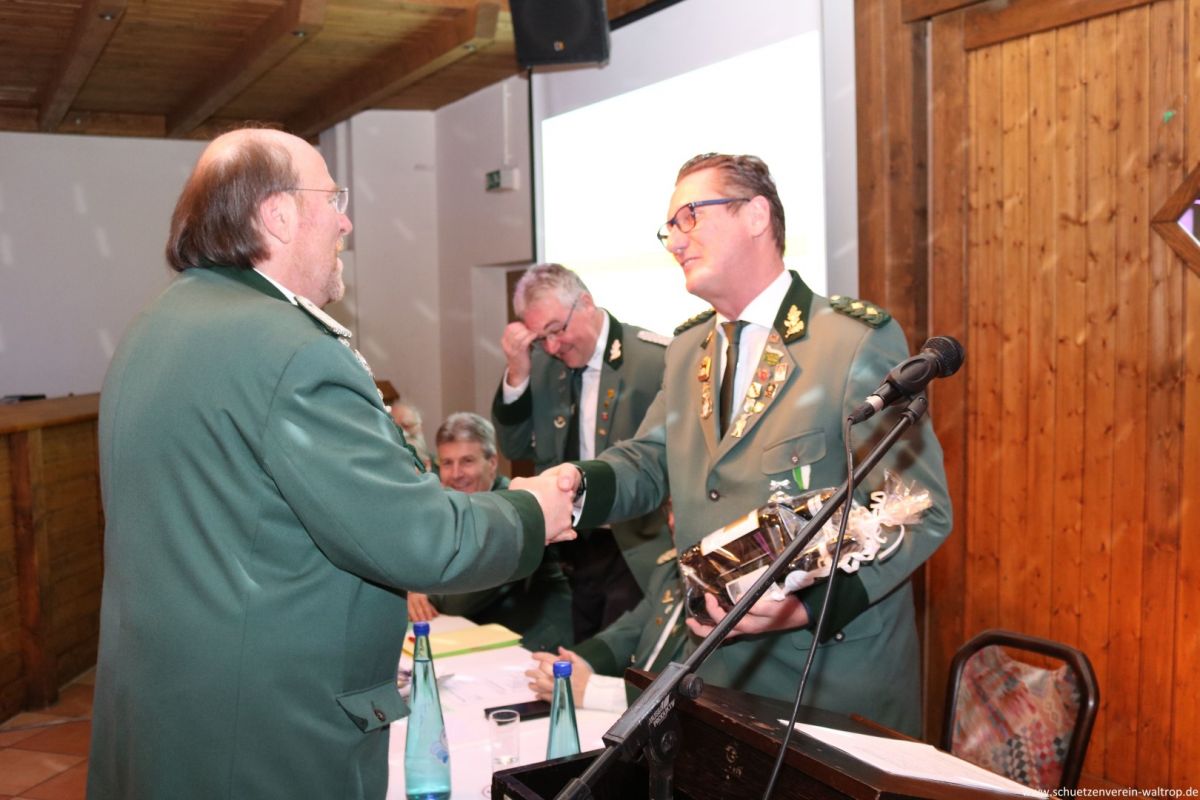 Zum Dank für seine Tätigkeiten erhielt Franz Konieczny aus den Händen von Ludger Grothus ein kleines Präsent, dazu gab es stehenden Applaus der Versammlung als Anerkennung der jahrelangen Arbeit im Bereich Schießsport.