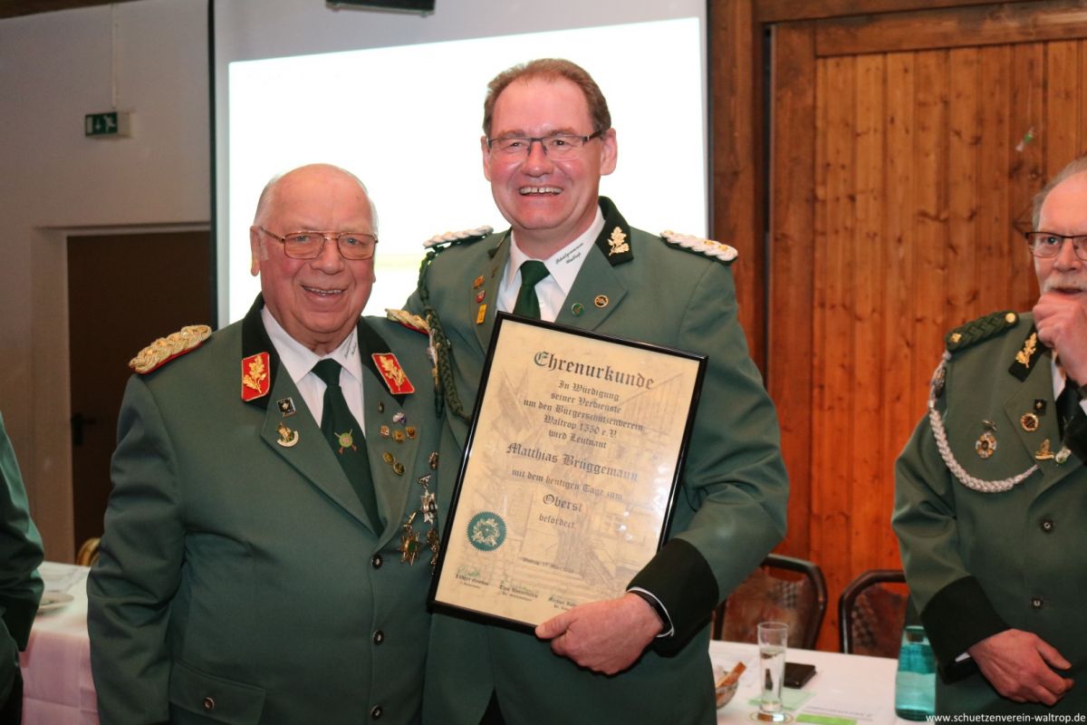 Seit dem Rücktritt von Willi Scheffers gab es keinen Nachfolger für diesen Posten, Bernd Reers übernahm kommissarisch das Amt und ließ das Bataillon beispielsweise bei Ausmärschen antreten. Bei der gestrigen Versammlung konnte nun endlich ein neuer Oberst präsentiert werden: Matthias Brüggemann!