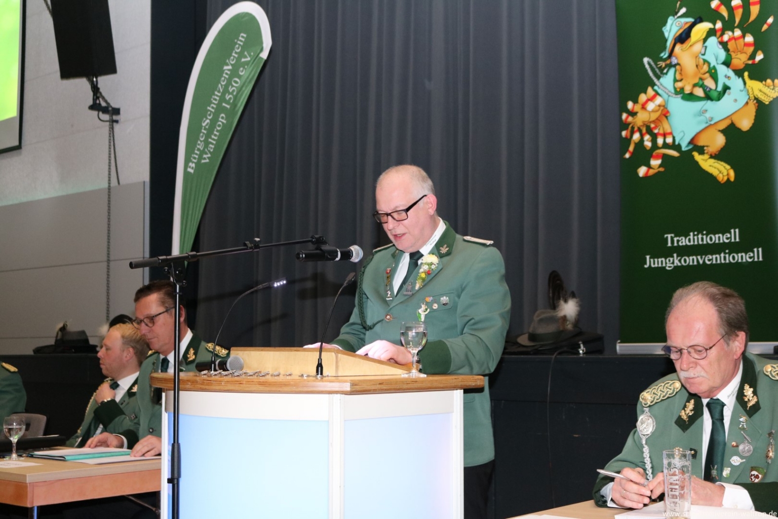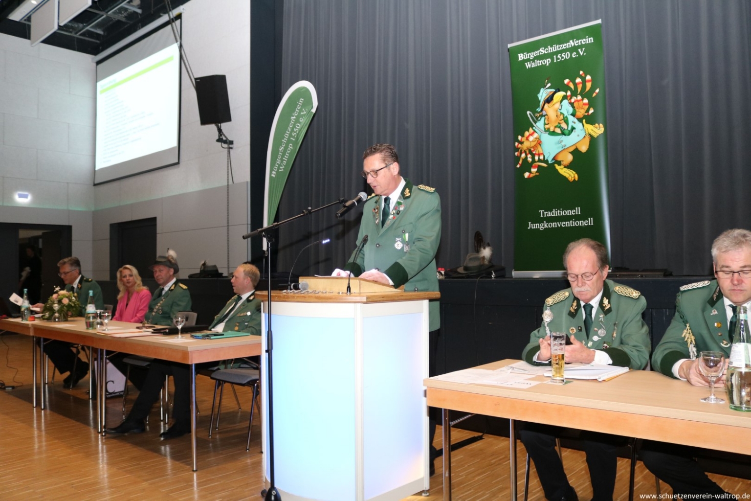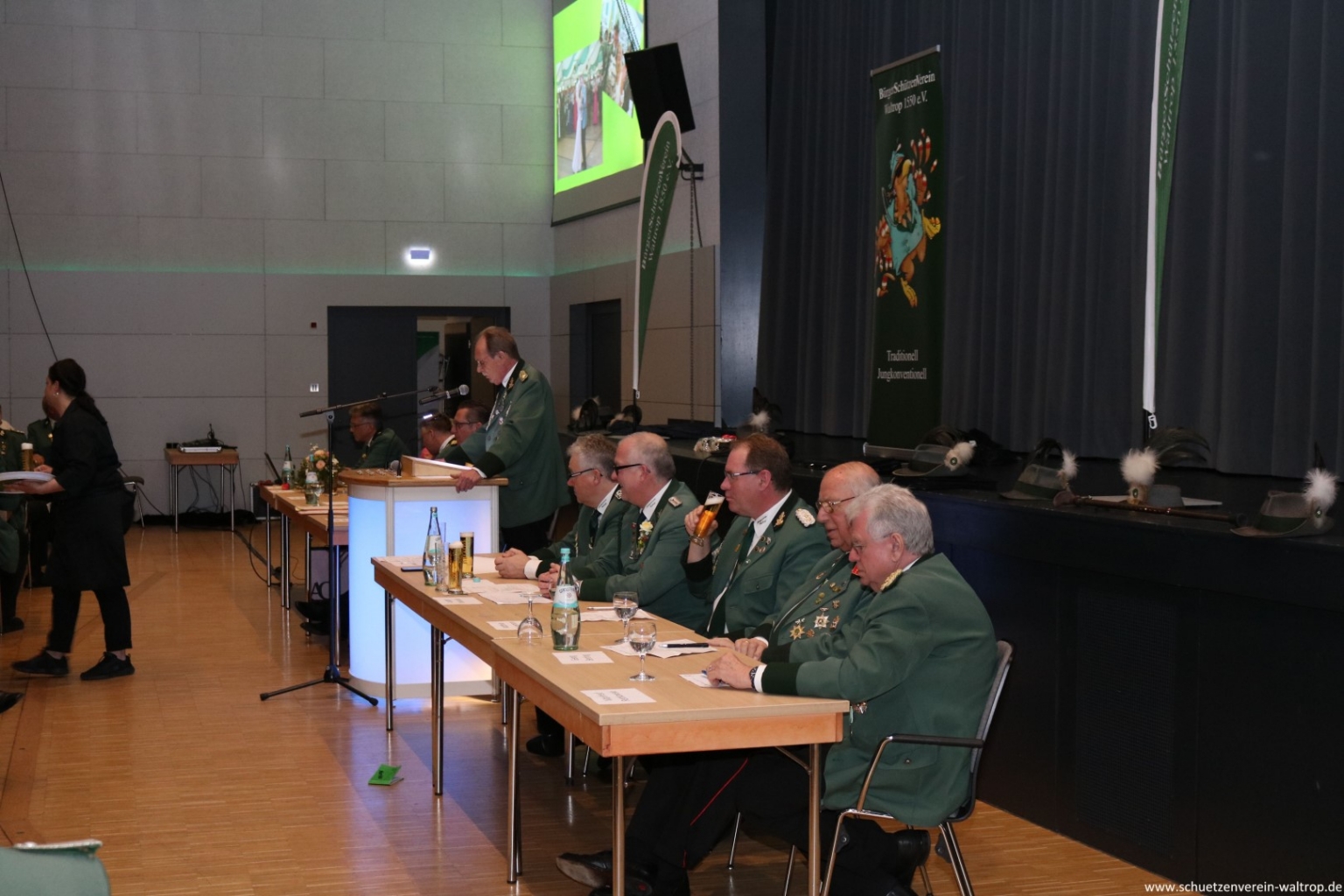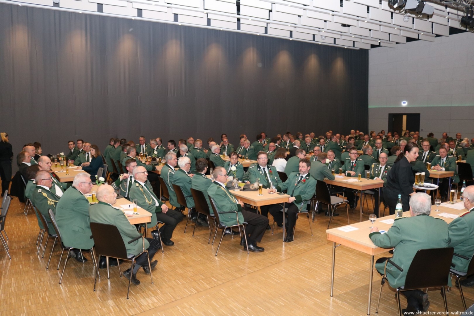 Erstmals seit längerer Umbaupause konnte die diesjährige Jahreshauptversammlung wieder in der Waltroper Stadthalle stattfinden. 152 Schützen folgten der Einladung und fanden sich pünktlich um 20.00 Uhr am Ort des Geschehens ein.