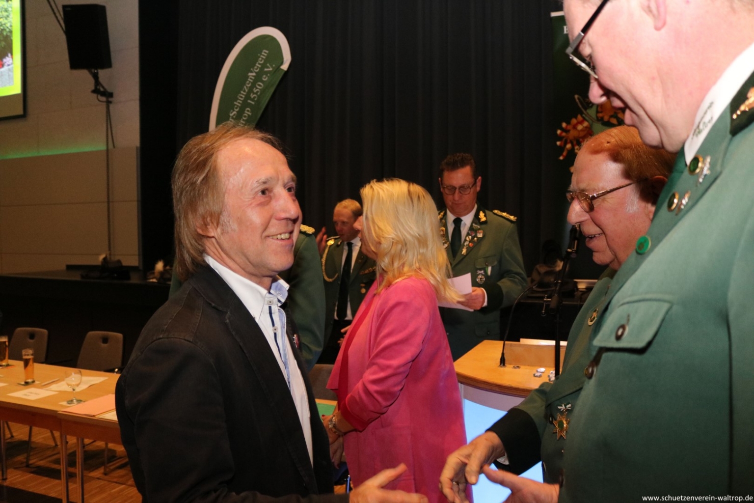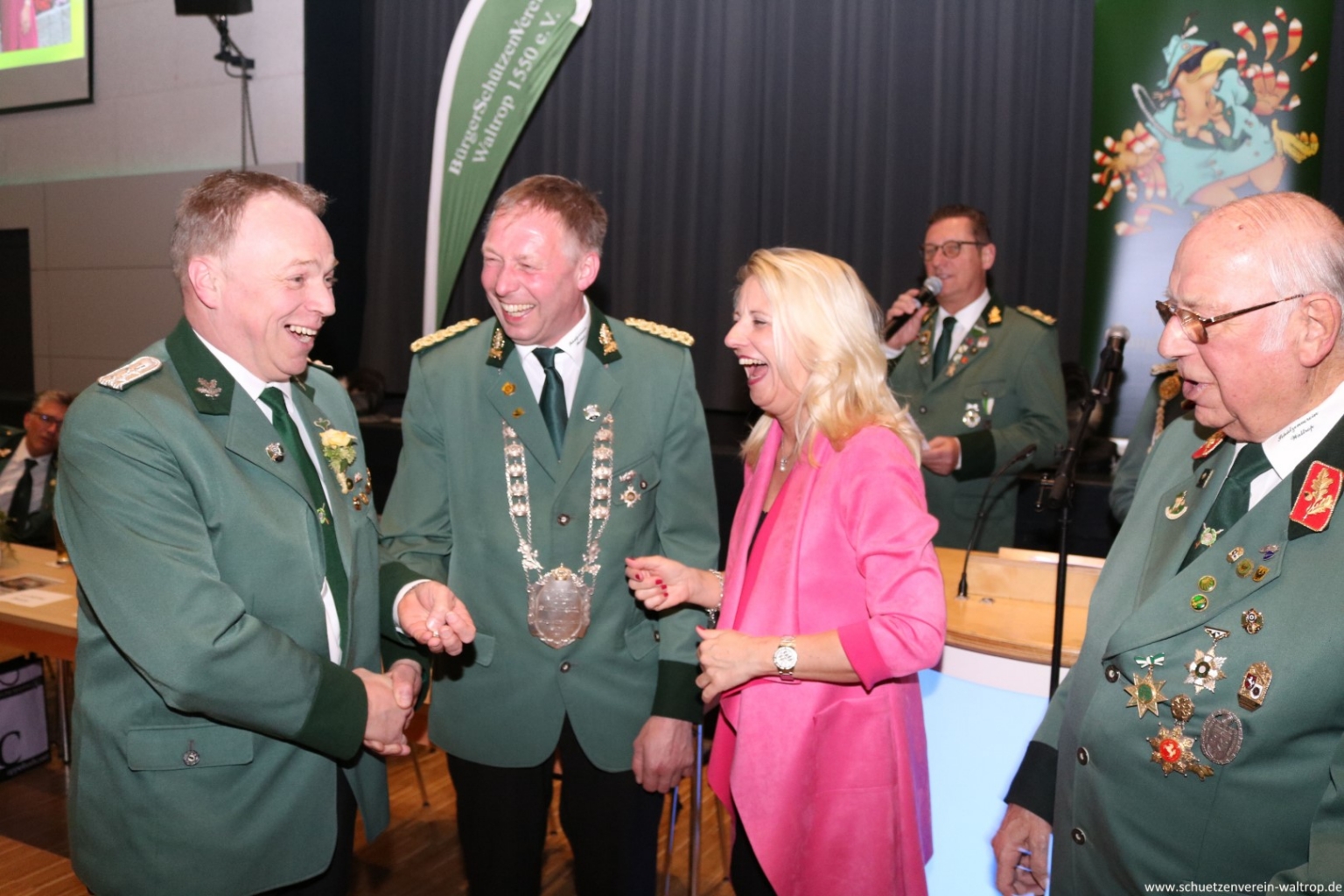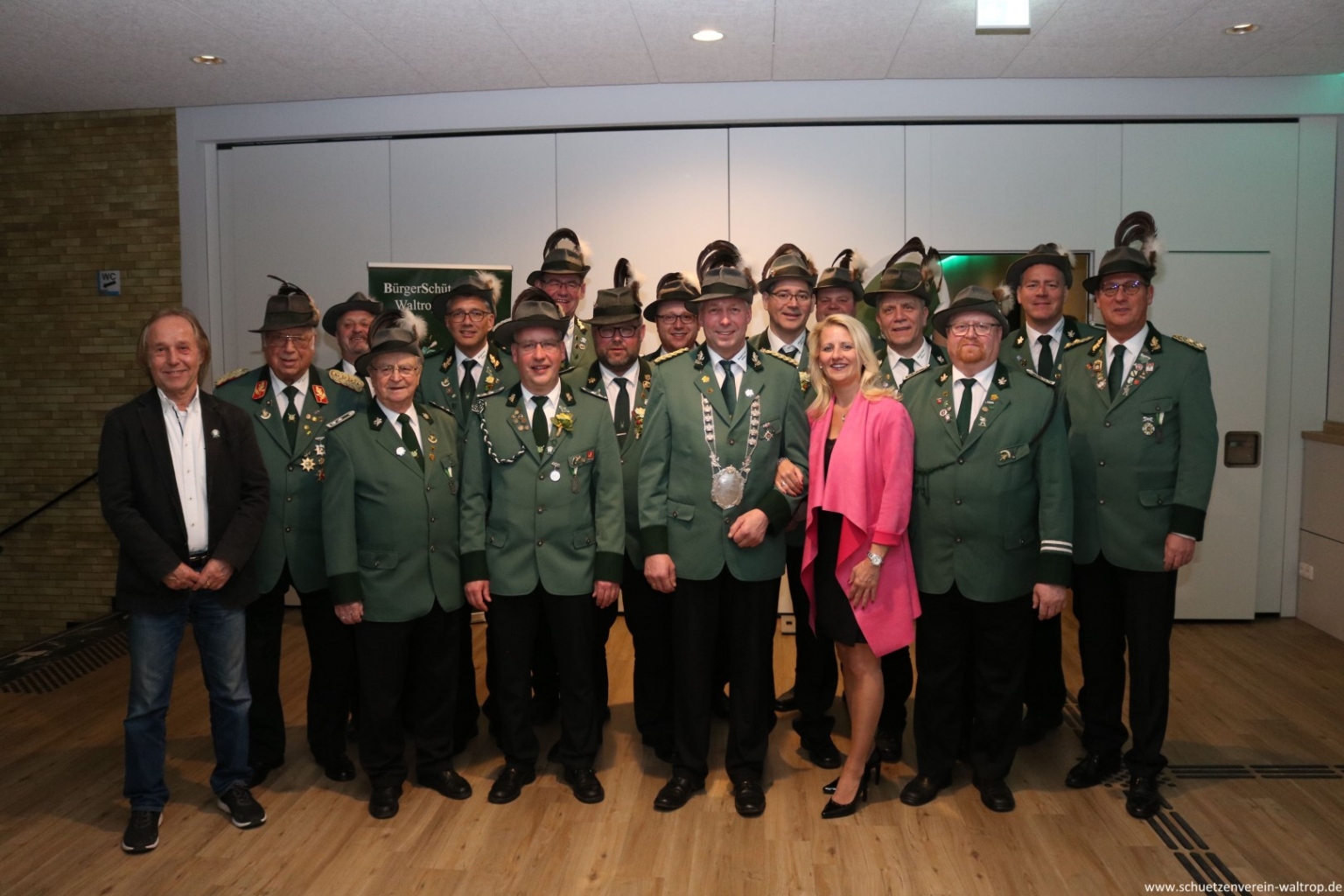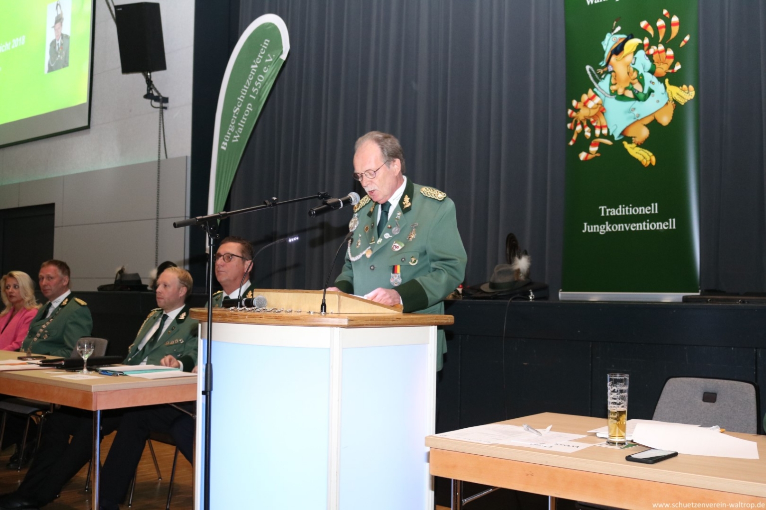 Nach dem traditionellen Einmarsch des amtierenden Königspaares König Hubert I. und Königin Anja I. angeführt von Oberst Matthias Brüggemann, konnte Vorsitzender Ludger Grothus die Versammlung mit der Begrüßung und dem Gedenken an die Verstorbenen eröffnen.