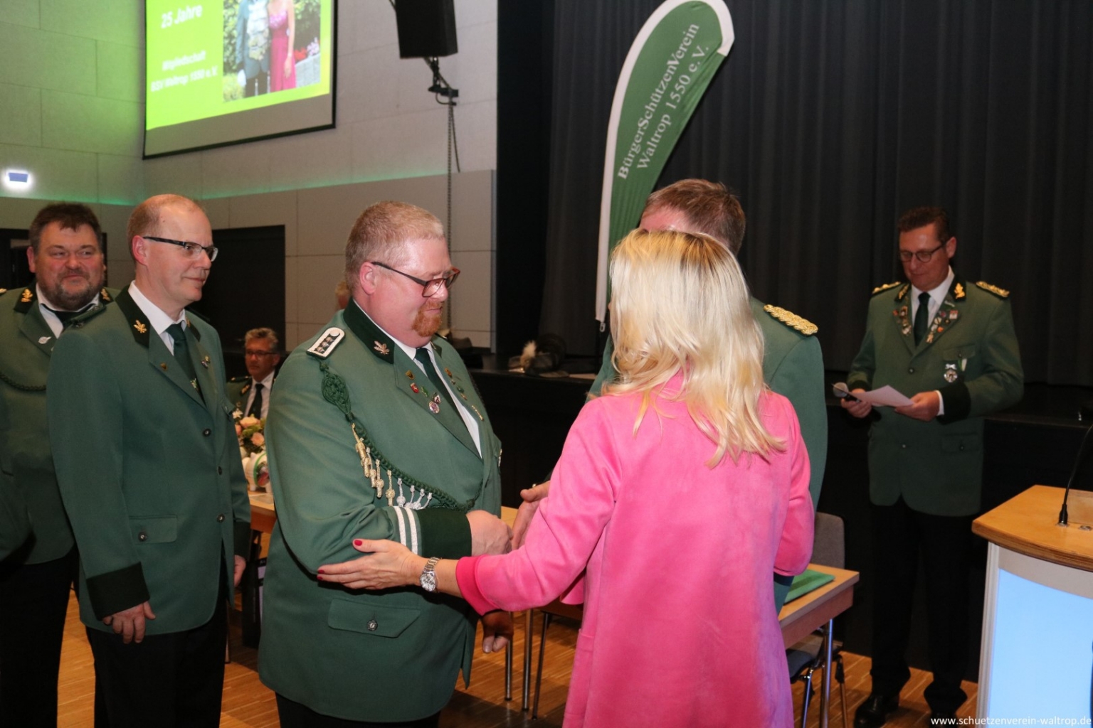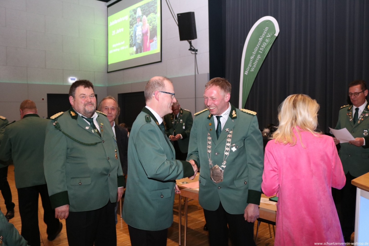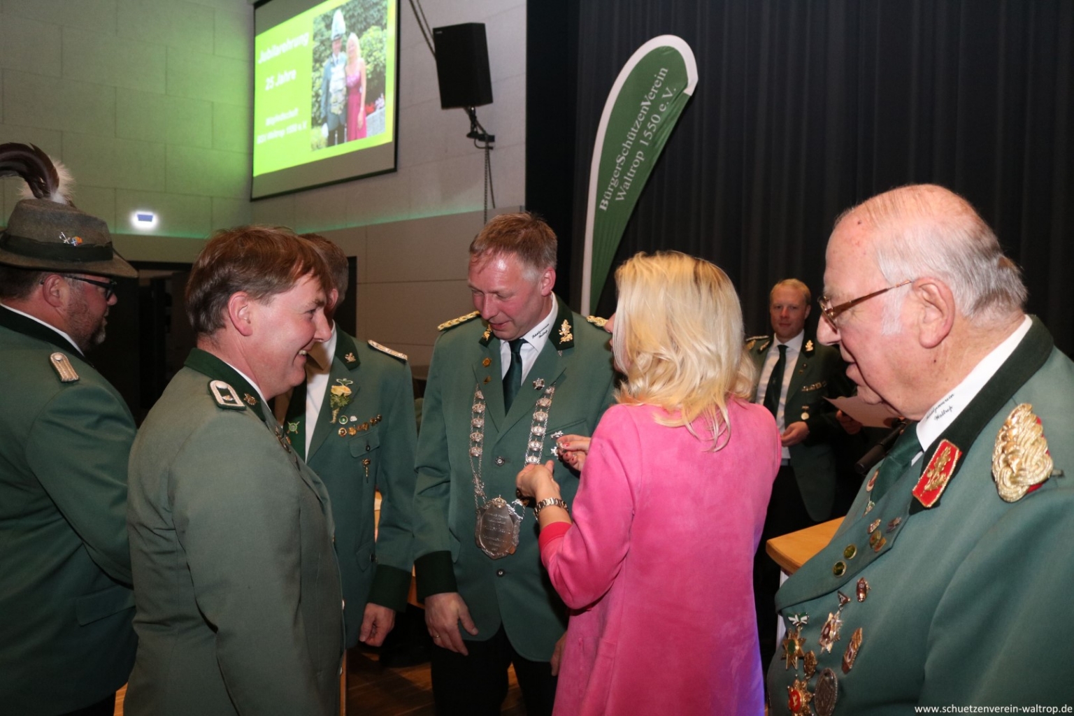 Nach kurzer Pause, in der eine Gulaschsuppe gereicht wurde, konnten gleich 26 Schützen für 25-jährige Mitgliedschaft im BSV Waltrop geehrt werden. Alle geehrten Schützen wurden kompanieweise nach vorne gebeten und anschließend einzeln durch das Königspaar Hubert und Anja, General Georg Bertling und Oberst Matthias Brüggemann mit einer Anstecknadel beglückwünscht.