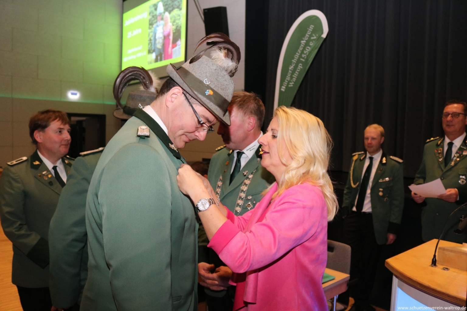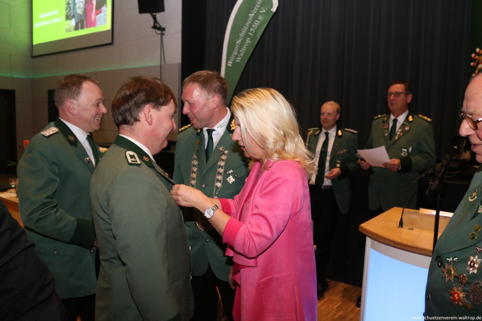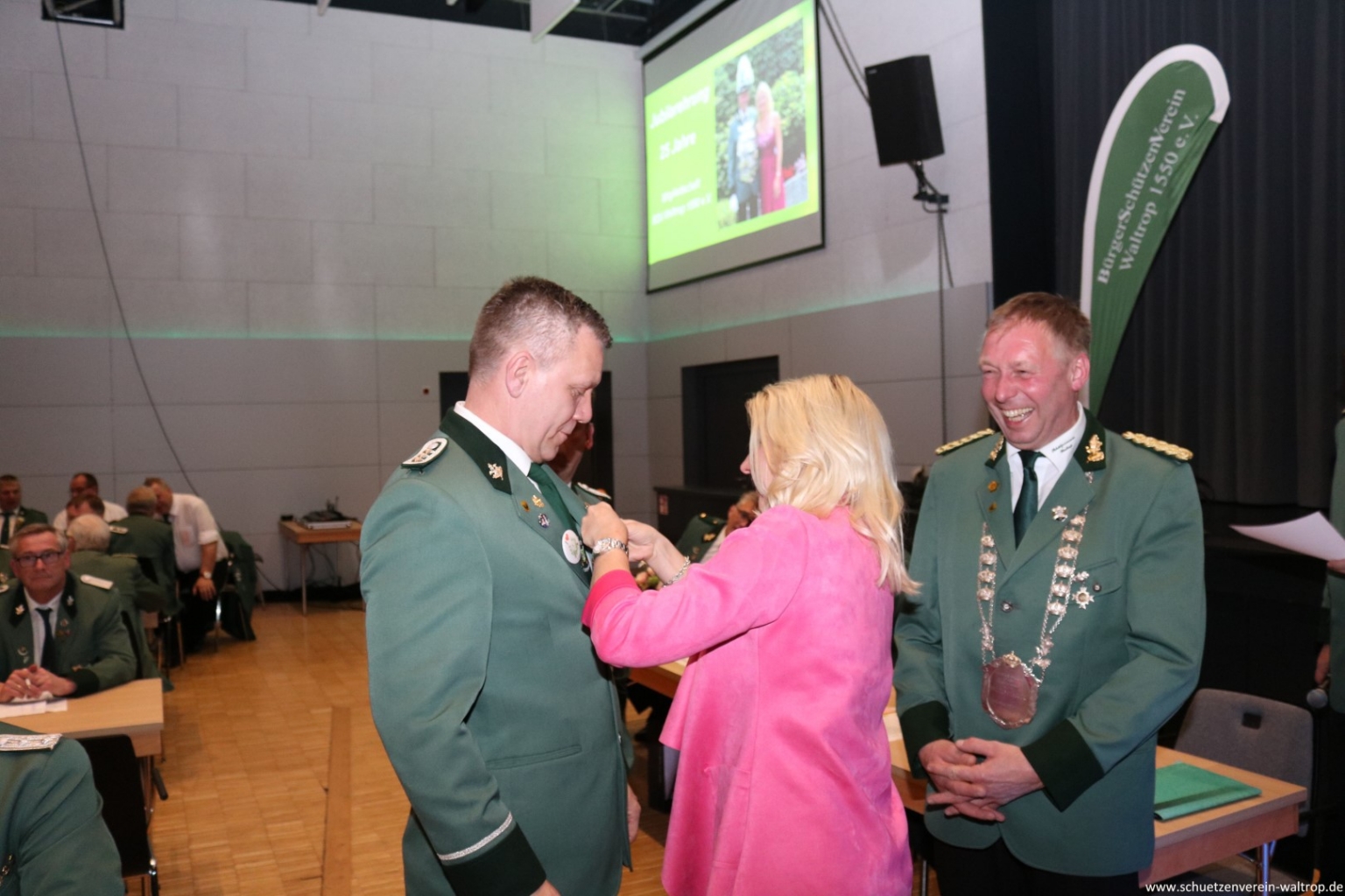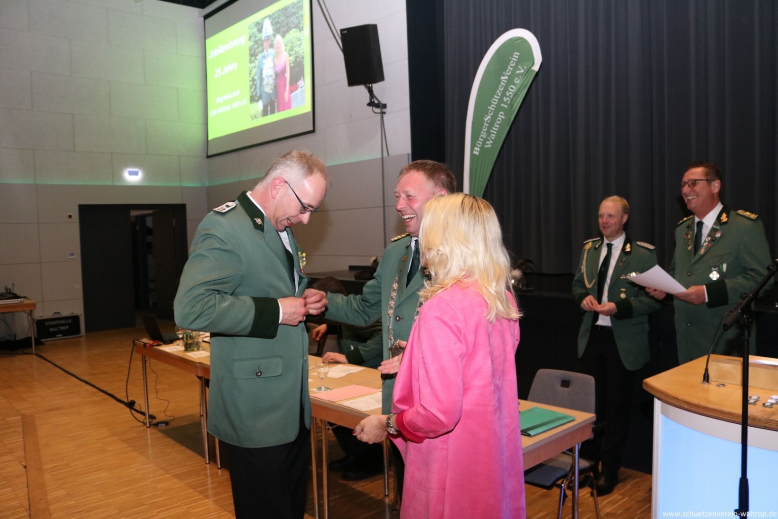 Nach kurzer Pause, in der eine Gulaschsuppe gereicht wurde, konnten gleich 26 Schützen für 25-jährige Mitgliedschaft im BSV Waltrop geehrt werden. Alle geehrten Schützen wurden kompanieweise nach vorne gebeten und anschließend einzeln durch das Königspaar Hubert und Anja, General Georg Bertling und Oberst Matthias Brüggemann mit einer Anstecknadel beglückwünscht.