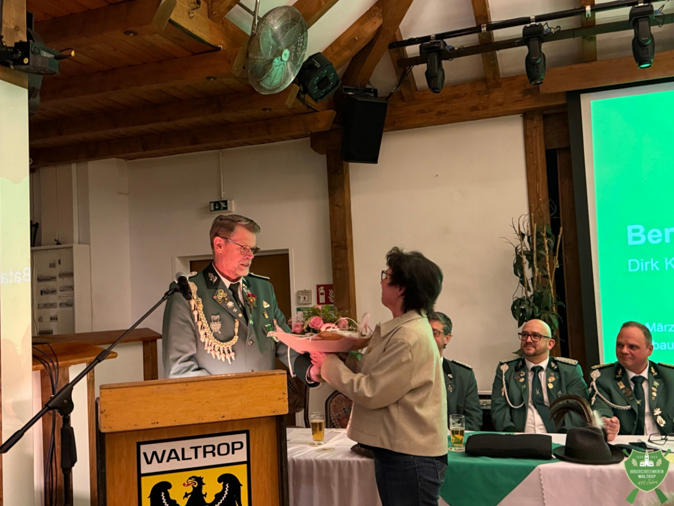 Dirk Knabke in seiner Funktion als Bataillonsschießwart und 1. Vorsitzender der Sportschützen berichtete von den wichtigsten Ergebnissen im Schießbereich. Viele Schützen und Kompanien konnten sich über Erfolge, Pokale und tolle Ergebnisse in verschiedensten Wettbewerben freuen. Hervorgehoben wurde hier Kerstin Gröble, die es bis zur deutschen Meisterschafft schaffte und einen guten Rang belegte. Als Gratulation gab es entsprechende Blumen für Kerstin.
