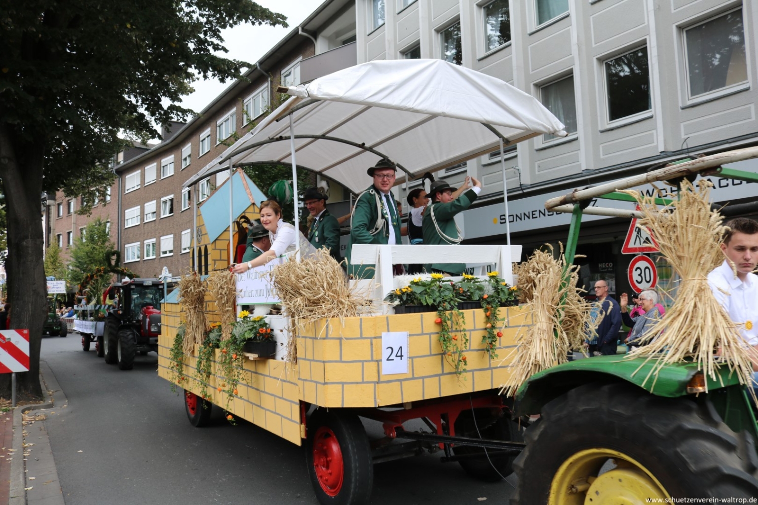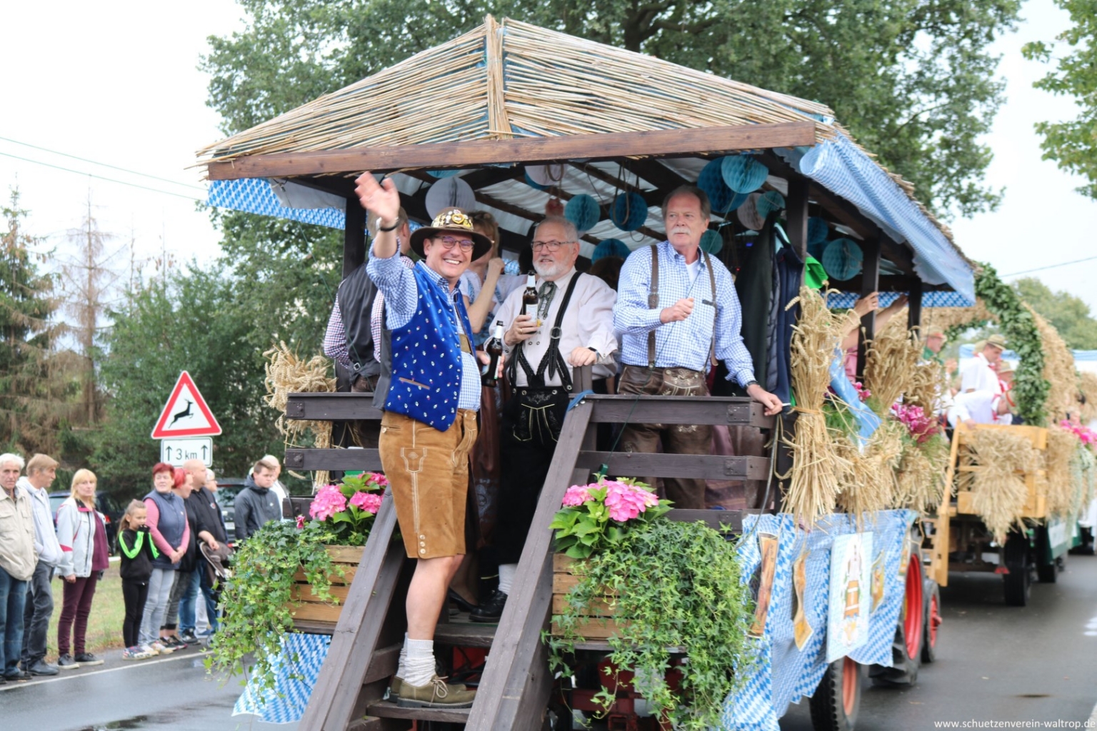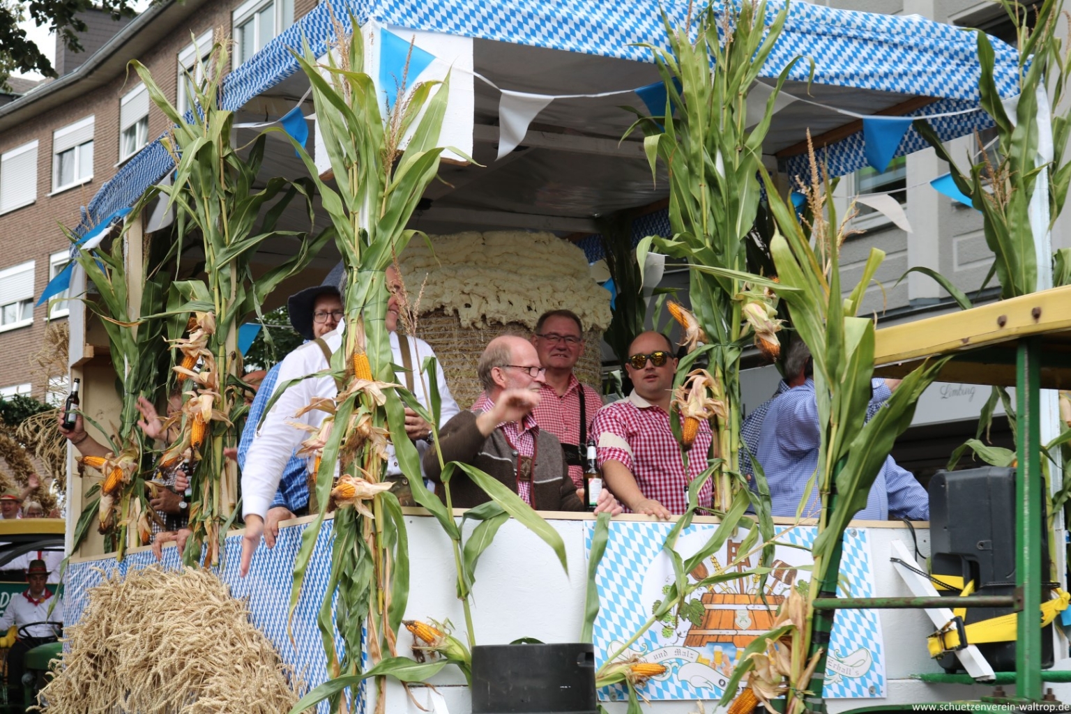 Nach und nach versammelten sich dort immer mehr kreative und liebevoll hergerichteten Festwagen. Durchweg alle Schützenvereine, das Landvolk, die Feuerwehr und viele mehr waren mit eigenen Wagen vertreten, darunter auch mehrere Wagen mit Schützen unseres BSV Waltrop.