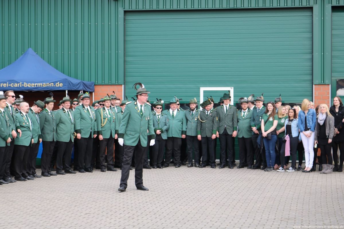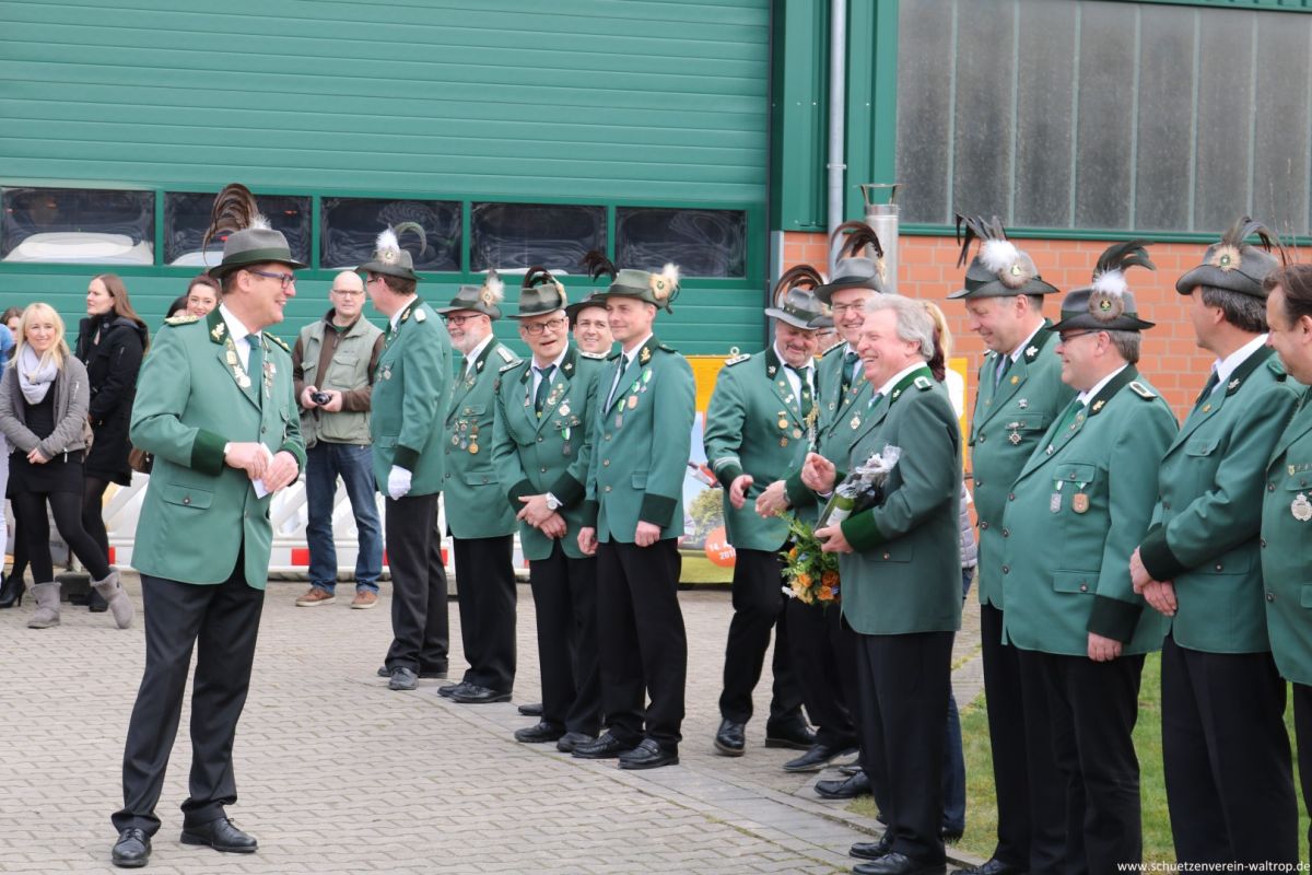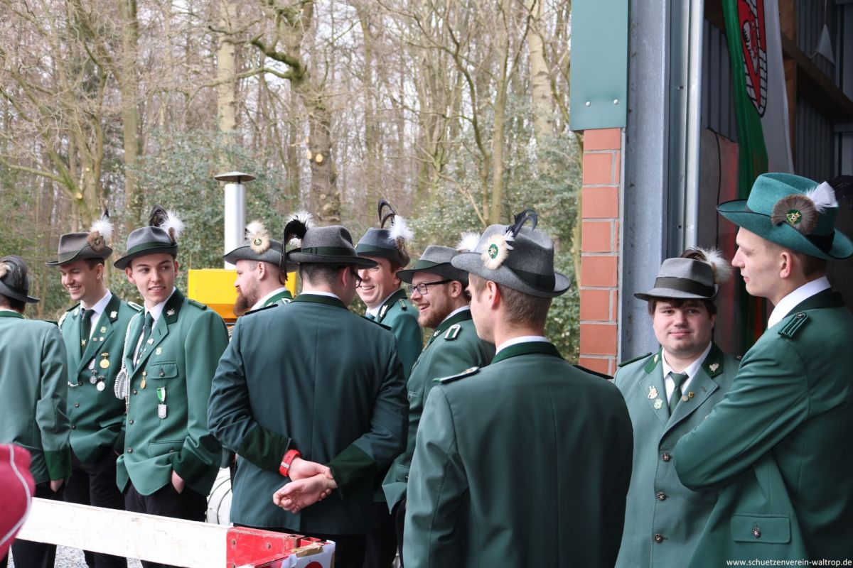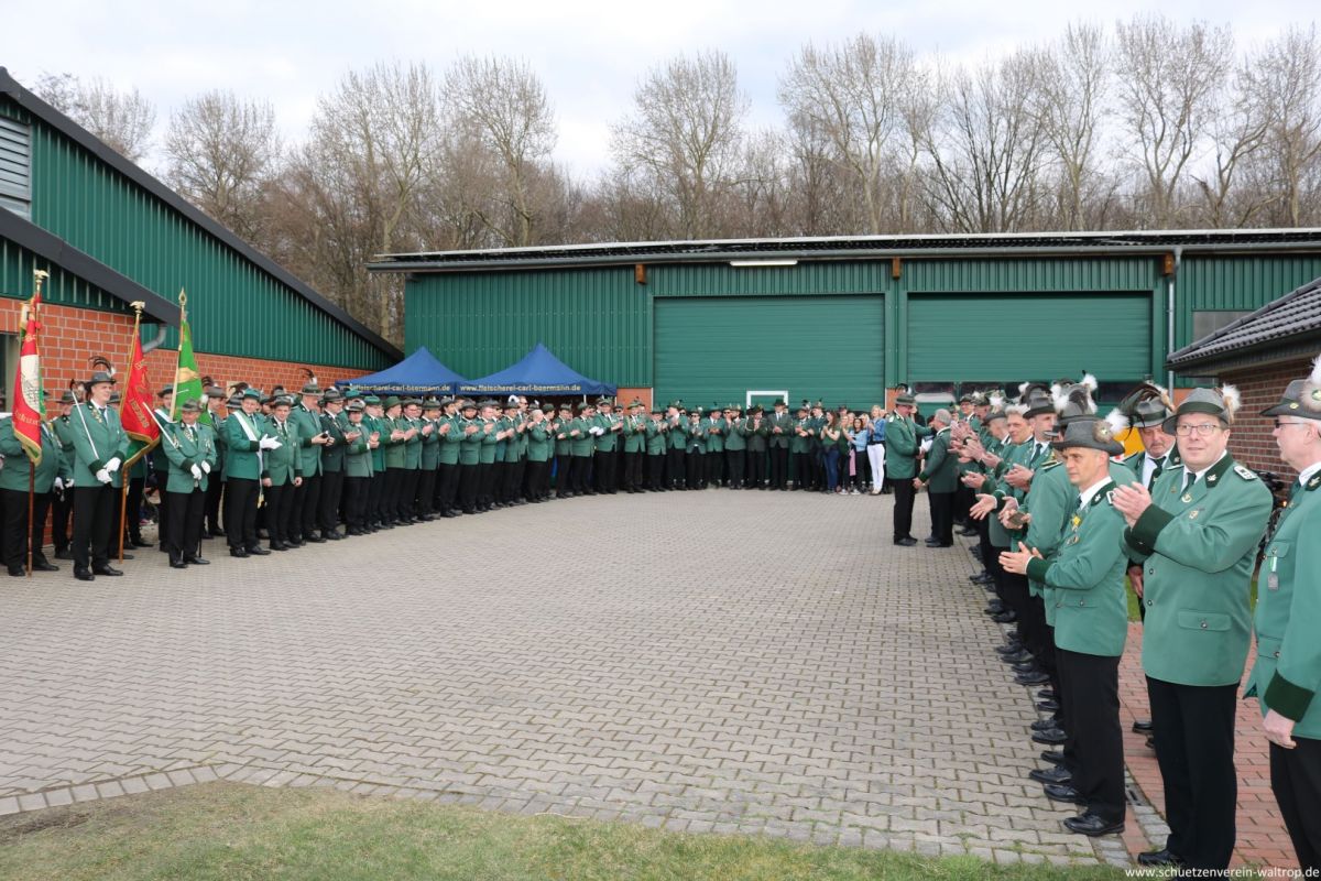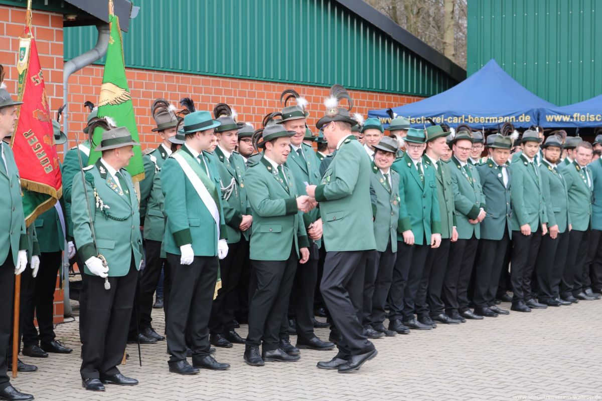 Die Jungschützen wurden beim Einmarsch auf dem Hof Zimmer von vielen anderen Schützen der „älteren Garde“ in Empfang genommen. Vorsitzender Ludger Grothus begrüßte neben den Jüngeren auch einige Gäste, die sich bereits eingefunden hatten und dankte zunächst den Hausherren Martina und Bernd Zimmer, dass sie ihre große Halle für Feier und Vogelschießen zur Verfügung stellten.
