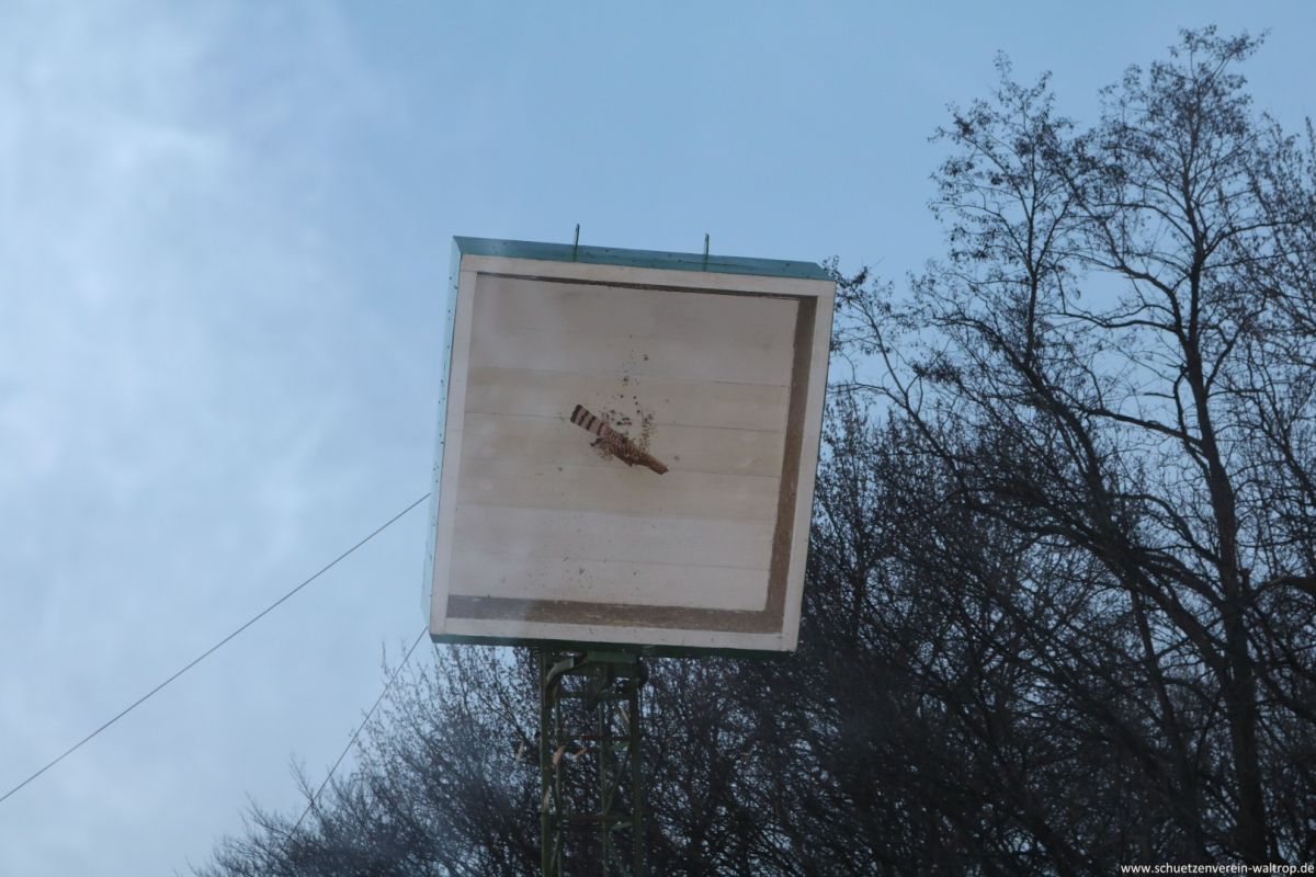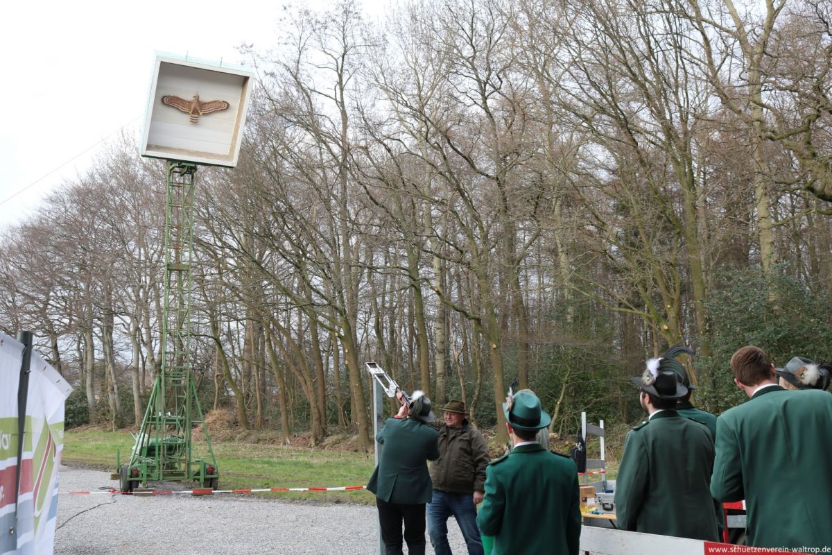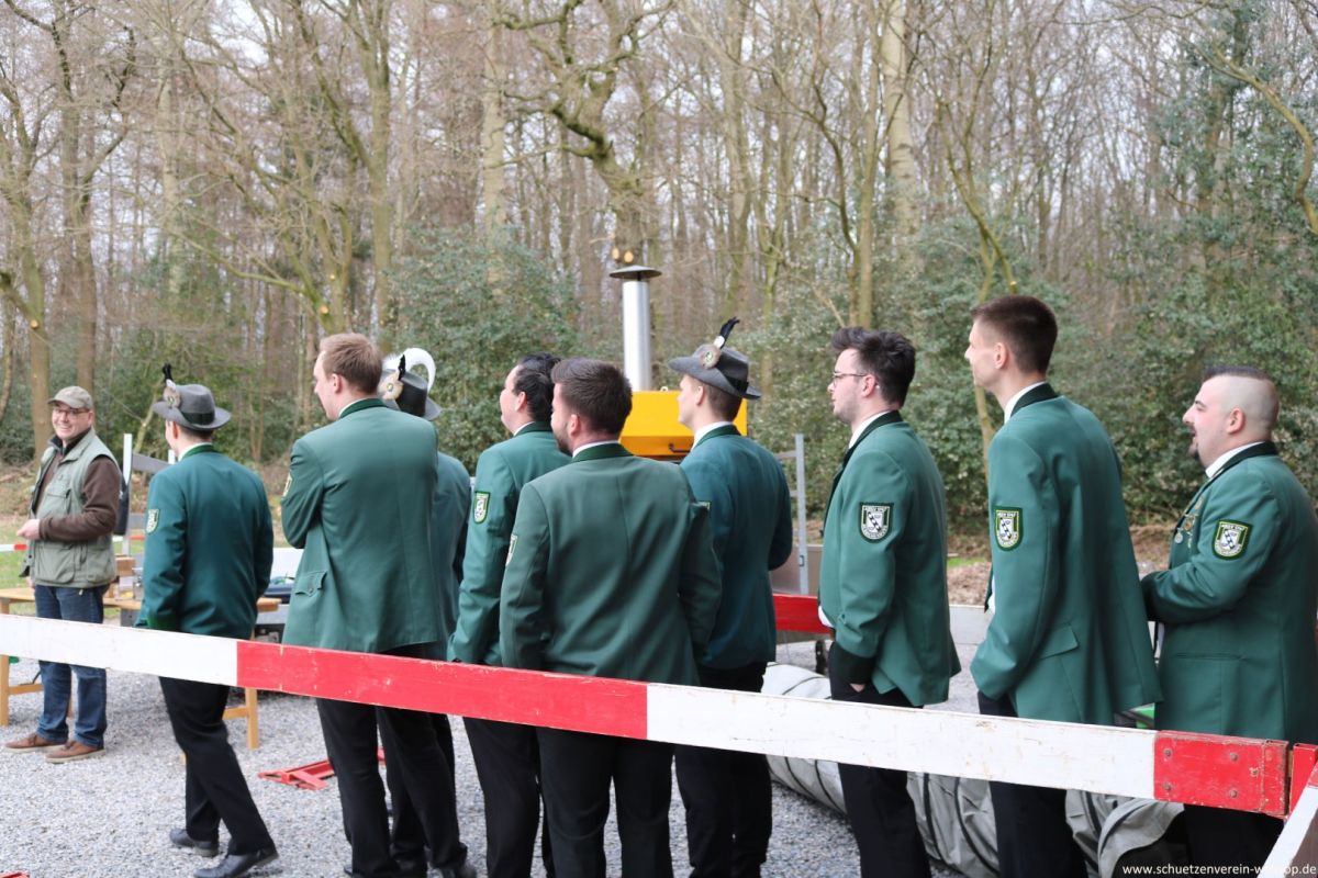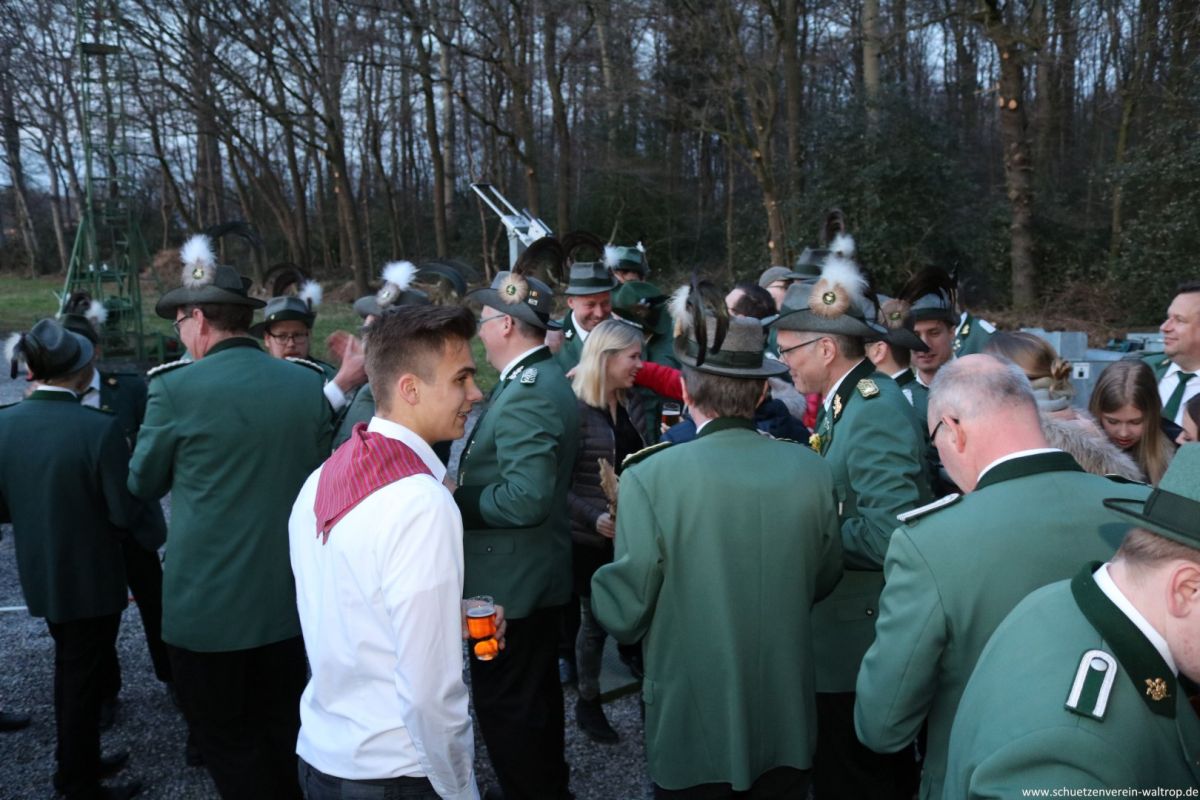 Während in der toll geschmückten Halle die Schützen der verschiedenen Vereine miteinander ins Gespräch kamen, wurde draußen auf den Vogel geschossen. Unter der Aufsicht von Wilm Bauernfeind und Frank Scheidle durften die Jungschützen der Reihenfolge nach auf die verschiedenen Insignien des von Hubert Brüggemann gebauten Vogels schießen.