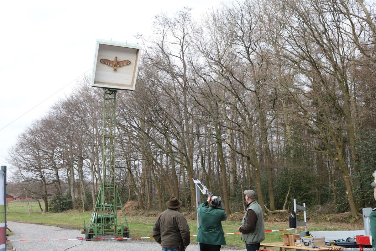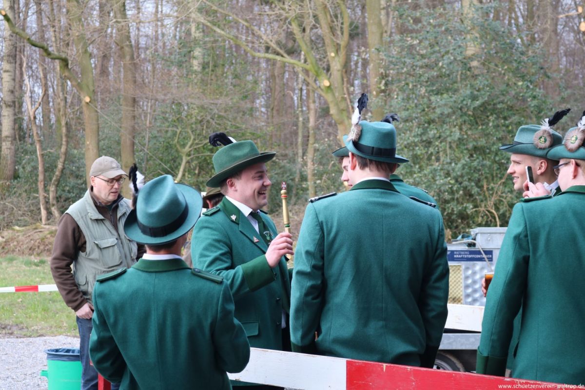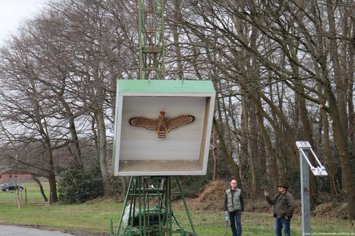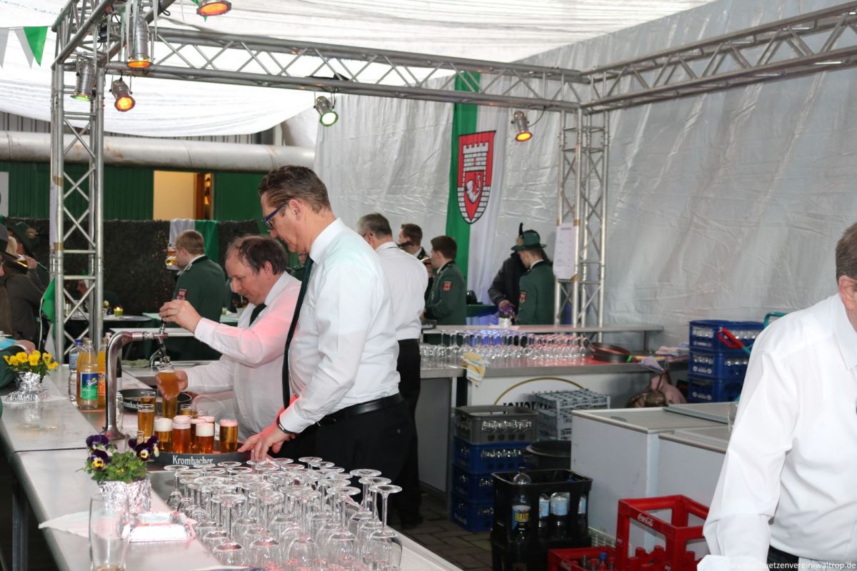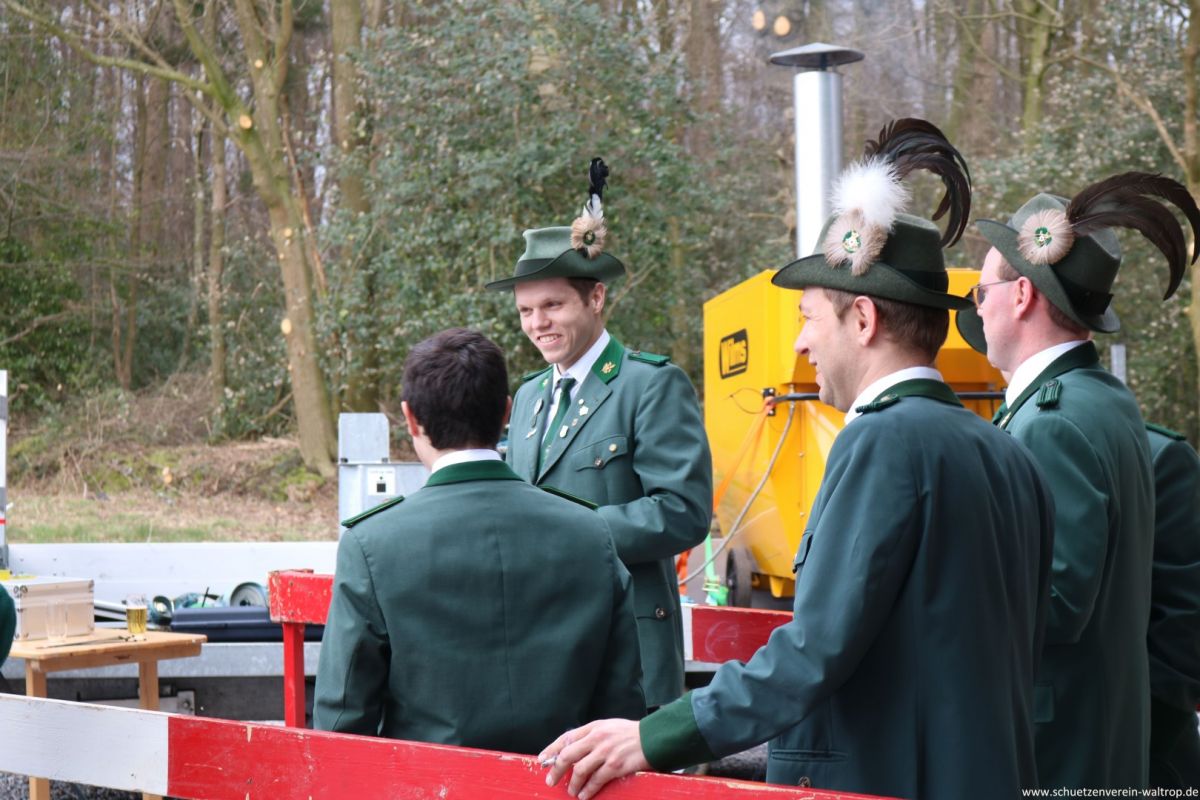 Während in der toll geschmückten Halle die Schützen der verschiedenen Vereine miteinander ins Gespräch kamen, wurde draußen auf den Vogel geschossen. Unter der Aufsicht von Wilm Bauernfeind und Frank Scheidle durften die Jungschützen der Reihenfolge nach auf die verschiedenen Insignien des von Hubert Brüggemann gebauten Vogels schießen.