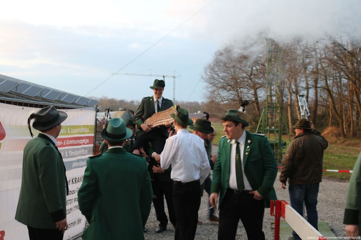Die Krone ging dabei an Marco Rottmann vom BSV Oberwiese, der Apfel an Matthias Schellhase vom BSV Horneburg. Matthias Koutecky vom BSV Elmenhorst sicherte sich das Zepter. Beim linken Flügel waren erneut die Horneburger erfolgreich, hier zielte Daniel Bross am besten und holte den Flügel herunter. Das Gegenstück ging an Phillipp Ludbrock aus der Bürgerschützengilde Oer.