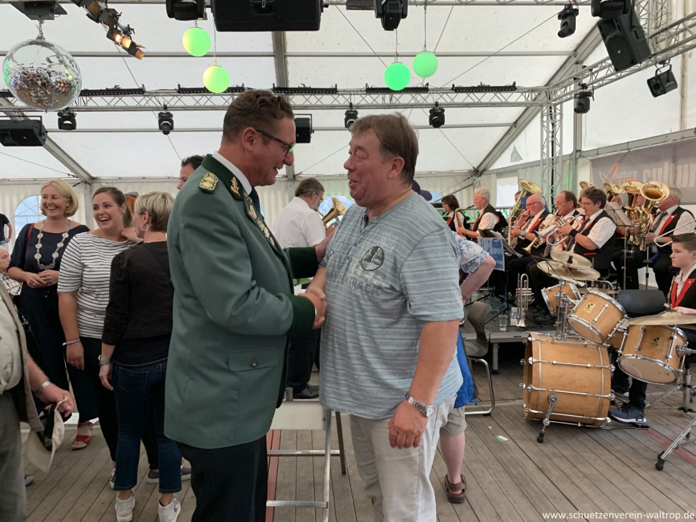 Ein weiterer offizieller Auftritt folgte am Abend. Im Cafézelt wurde im Rahmen der Parkfesteröffnung der Bürger des Jahres 2018, Detlef "Didi" Pourie geehrt. Für sein vielfältiges Engagement wurde Detlef Pourie, der den meisten als "Didi" in seiner Facebook-Gruppe "Du bist Waltroper, wenn..." bekannt ist, geehrt und wurde damit Nachfolger von unserem Vorsitzenden Ludger Grothus, der die Auszeichnung im vergangenen Jahr stellvertretend für unseren BSV Waltrop erhalten hatte.