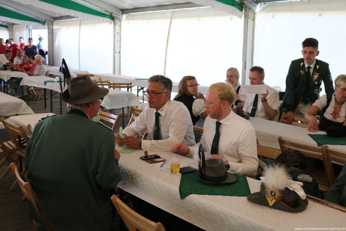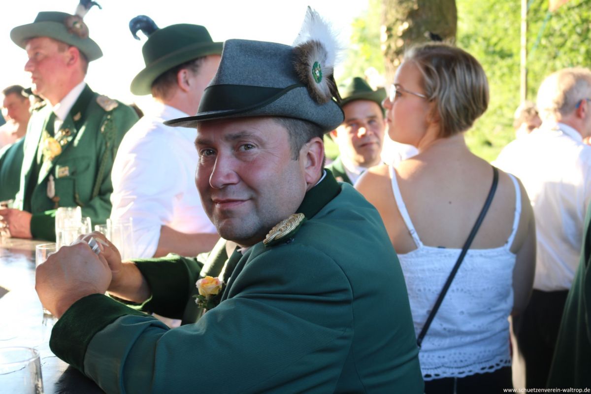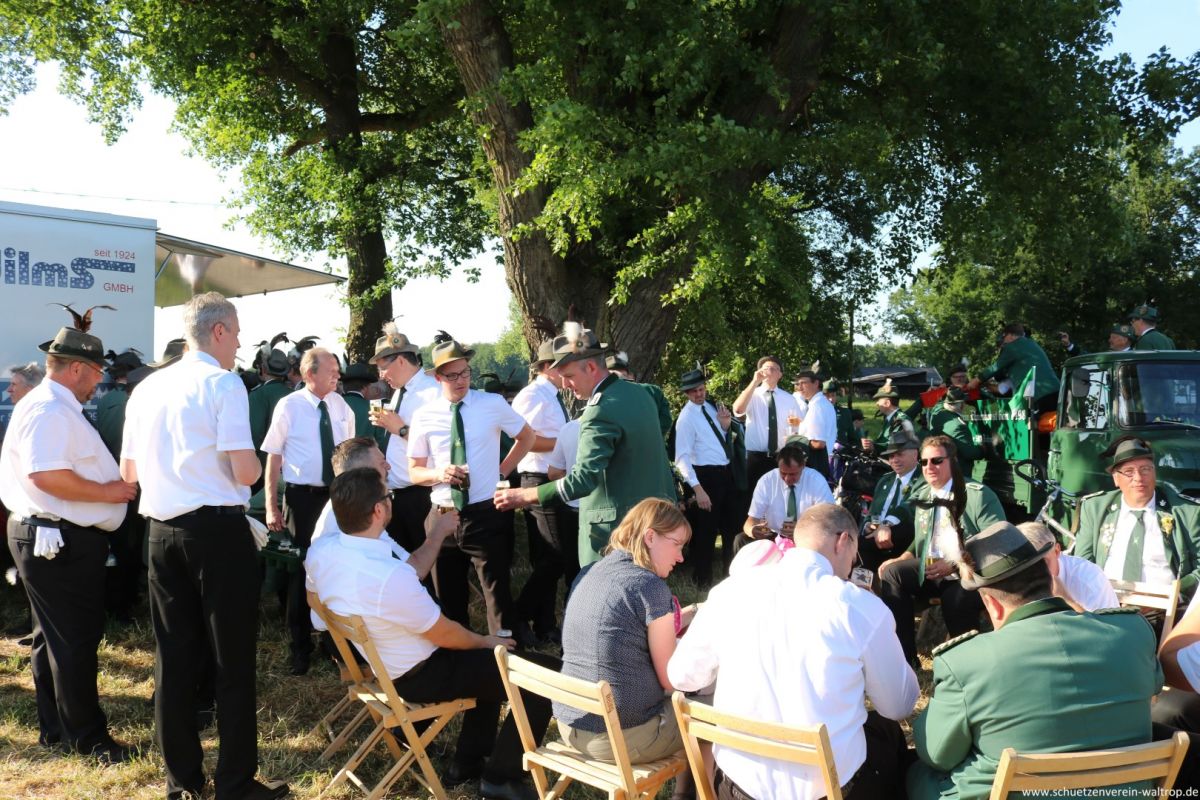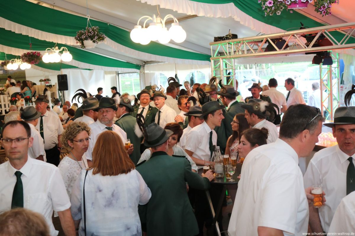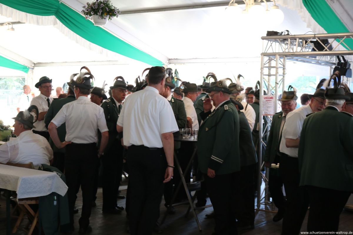 Angekommen am Festzelt waren die meisten froh über den überstandenen Umzug durch die wärmende Sonne. Während die Zweite sich einen gemütlichen Platz an der Theke im Zelt sicherte, bevorzugten die anderen Kompanien zunächst den Standort um den Bierwagen im äußeren Bereich. Begehrte Schattenplätze waren entsprechend schnell belegt, aber auch in der Sonne ließ es sich mit einem kühlen Getränk doch noch gut aushalten.