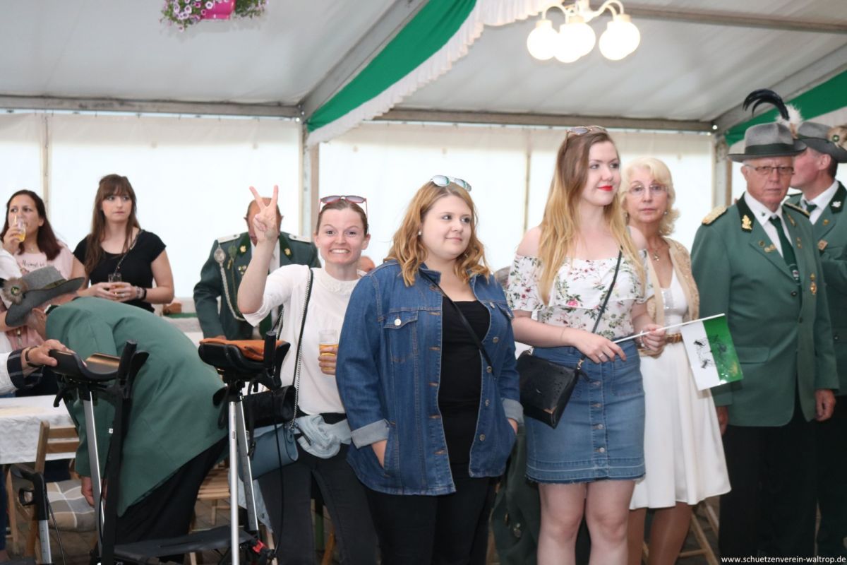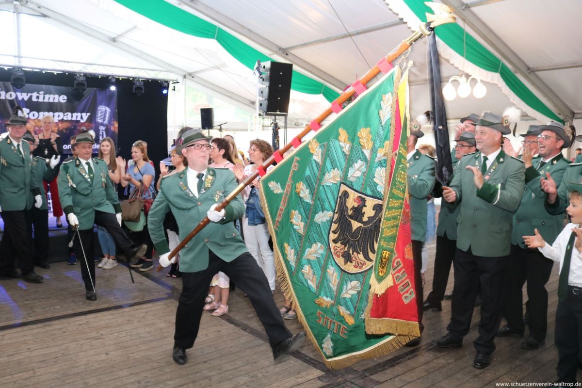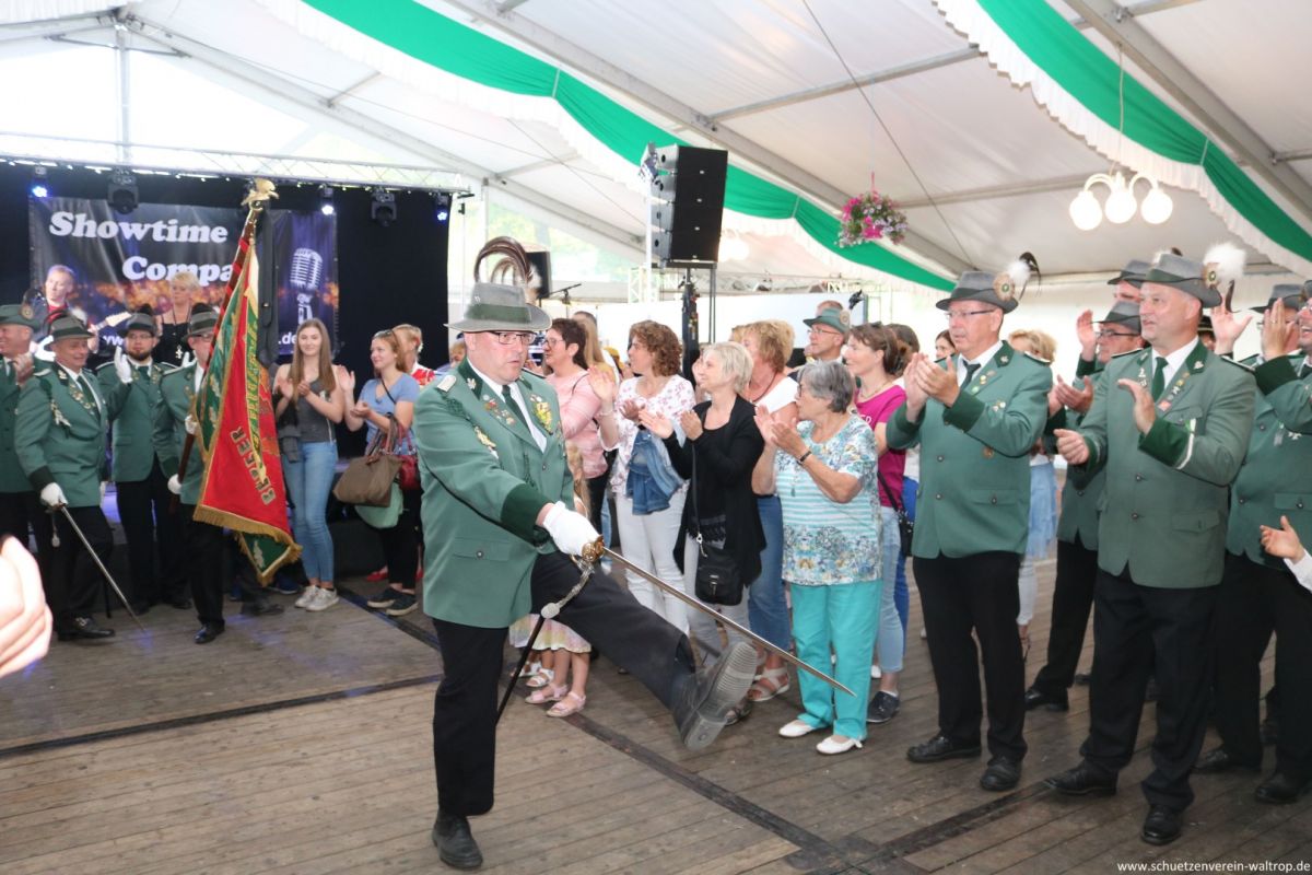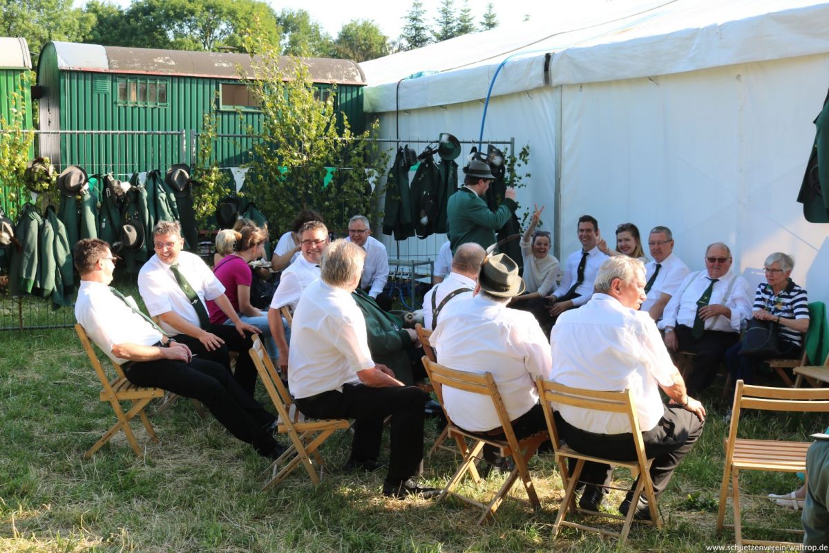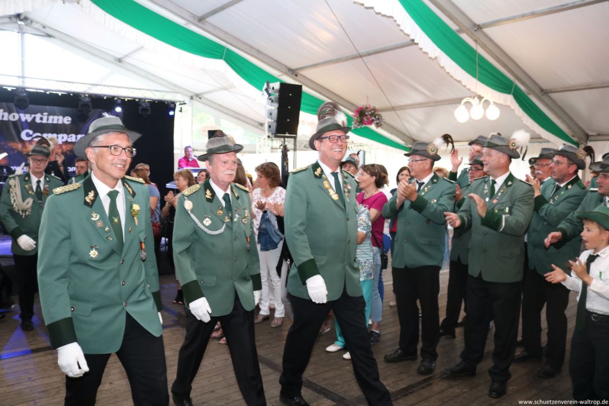 Angekommen am Festzelt waren die meisten froh über den überstandenen Umzug durch die wärmende Sonne. Während die Zweite sich einen gemütlichen Platz an der Theke im Zelt sicherte, bevorzugten die anderen Kompanien zunächst den Standort um den Bierwagen im äußeren Bereich. Begehrte Schattenplätze waren entsprechend schnell belegt, aber auch in der Sonne ließ es sich mit einem kühlen Getränk doch noch gut aushalten.