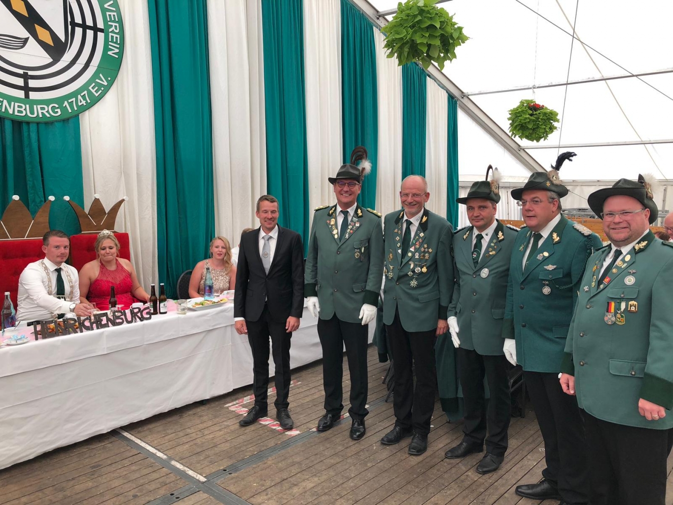 Etwa 100 Schützen traten zum gestrigen Ausmarsch in Henrichenburg an, um unser Königspaar Hubert I. und Anja I. zu unterstützen. Bei angenehmen Temperaturen ging es wieder durch die toll geschmückten Straßen Henrichenburgs, vorbei an der großen Parade bis zum Festzelt.