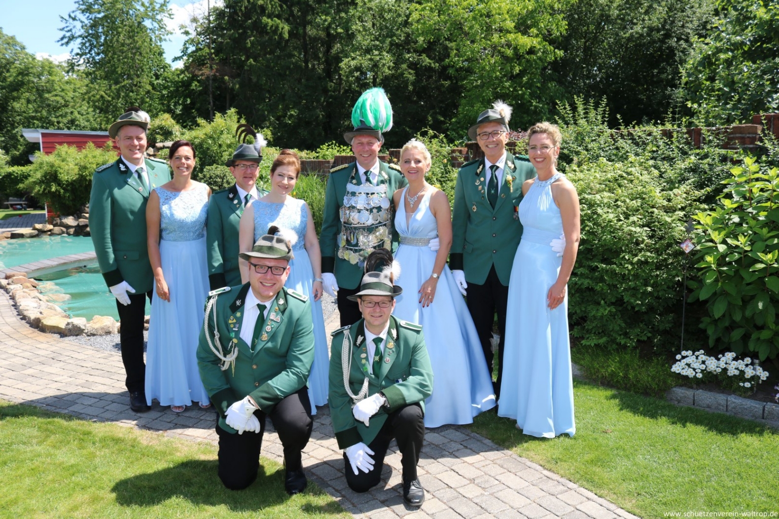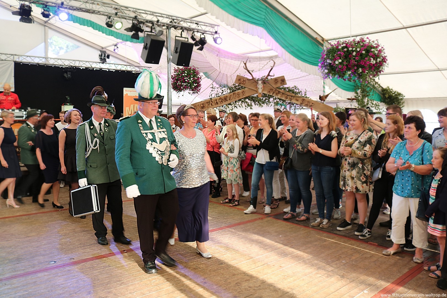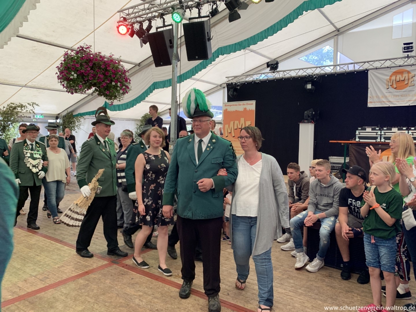 Aufgrund der ungeplanten Verzögerungen beim Vogelschießen blieb dem neuen Königspaar samt Hofstaat zwar nicht allzu viel Zeit, doch schafften es alle pünktlich zum Einmarsch am Abend wieder frisch gestylt am Festzelt zu sein.