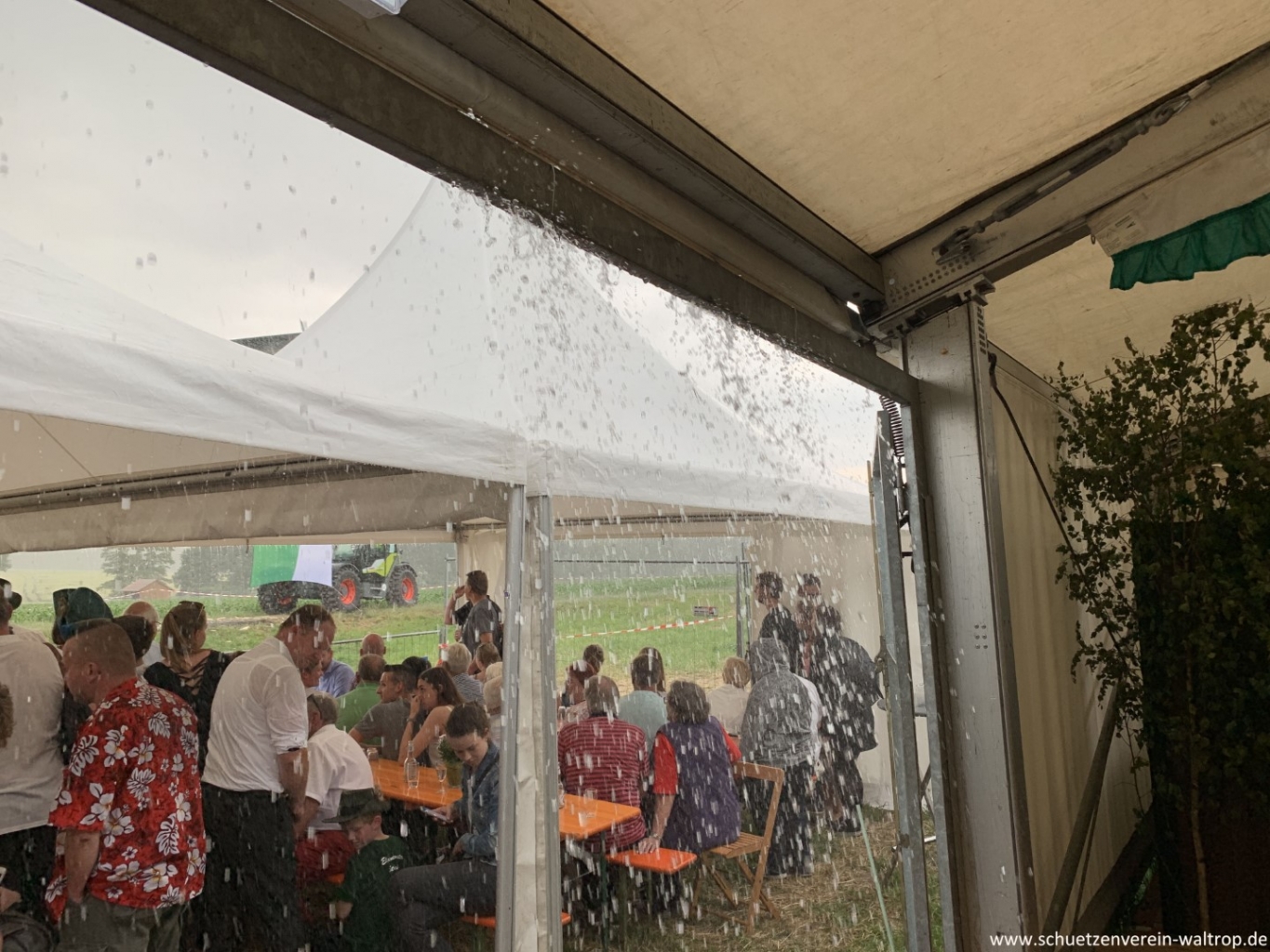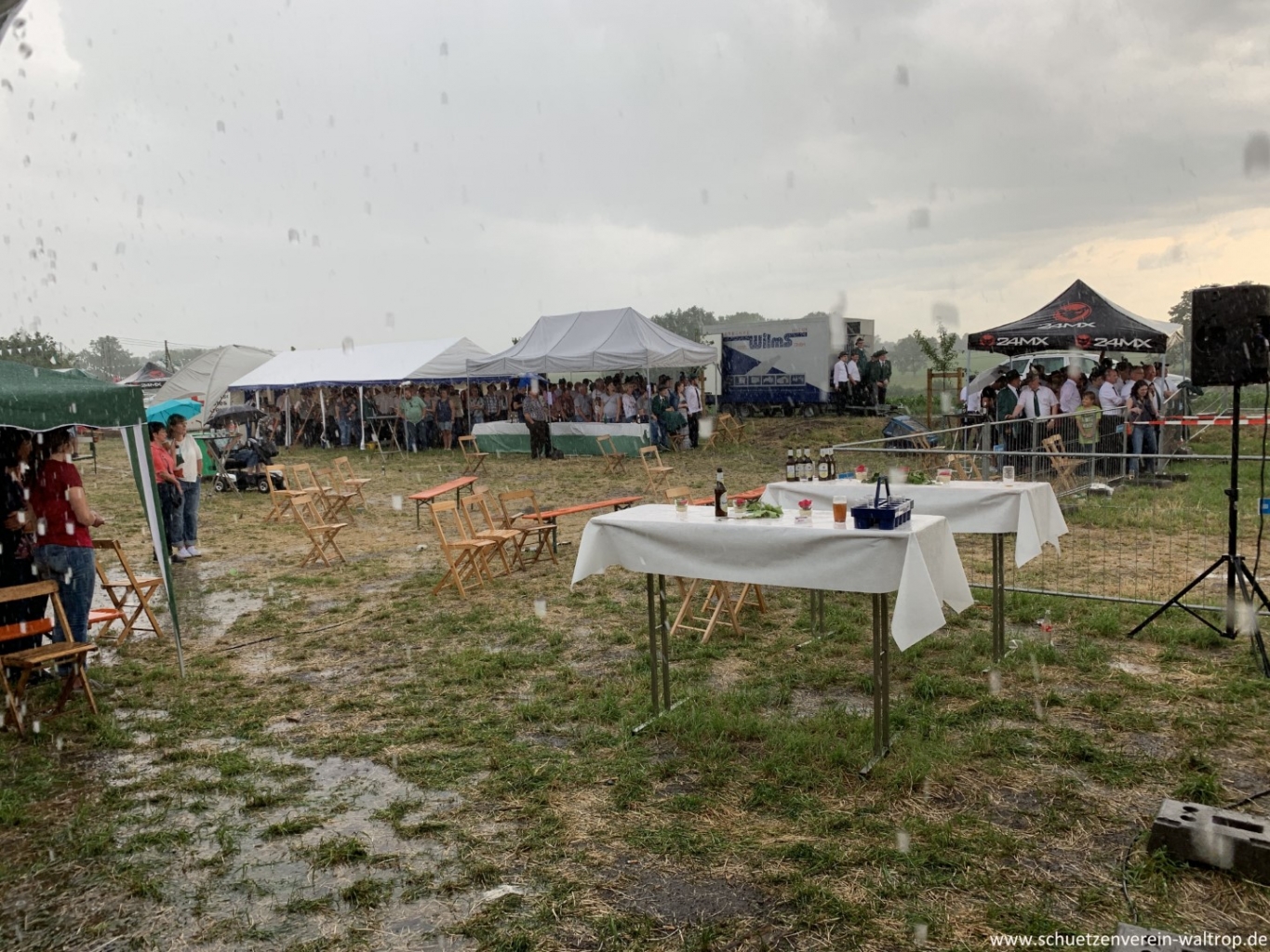 Auch der letzte Teil des Vogelschießens, der Kampf um die Königswürde wurde zu einer langen, aber spannenden Angelegenheit. Die verbliebenen Anwärter versuchten Schuss für Schuss den letzten Teil des Holzes von der Schraube zu schießen. Nicht nur diverse Wetter-Apps, sondern auch der Himmel kündigte mittlerweile unübersehbar ein nahendes Unwetter an. Alle hofften, noch vor dem kommenden Regen einen neuen König bejubeln zu können, doch daraus wurde leider nichts. Der einsetzende Starkregen verschlug Besucher und Schützen fluchtartig unter trockene Unterstände oder ins benachbarte Festzelt. Lediglich die Königsanwärter hielten vorne an der Stange tapfer unter einem Pavillon durch und versuchten einen Nachfolger von König Bernhard IV. Sißmann zu ermitteln.
