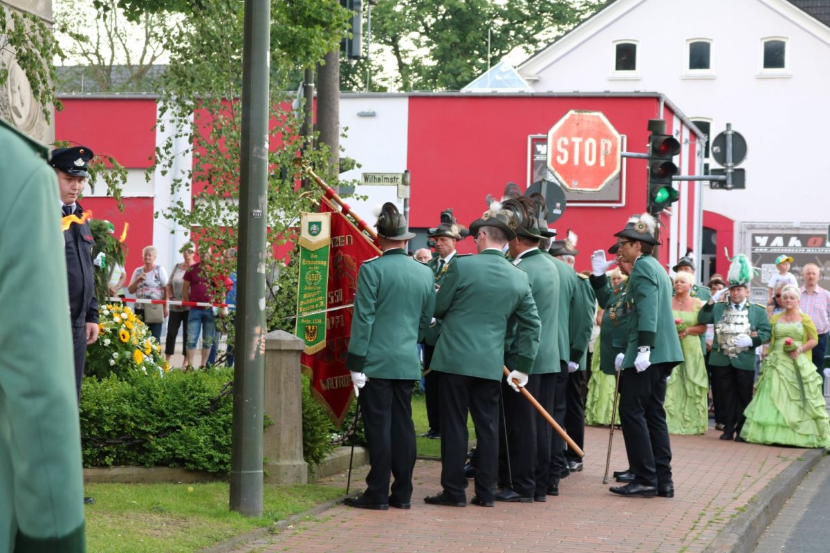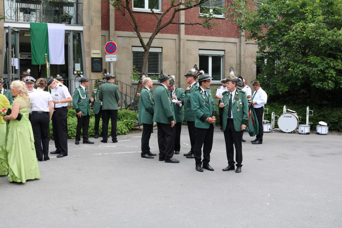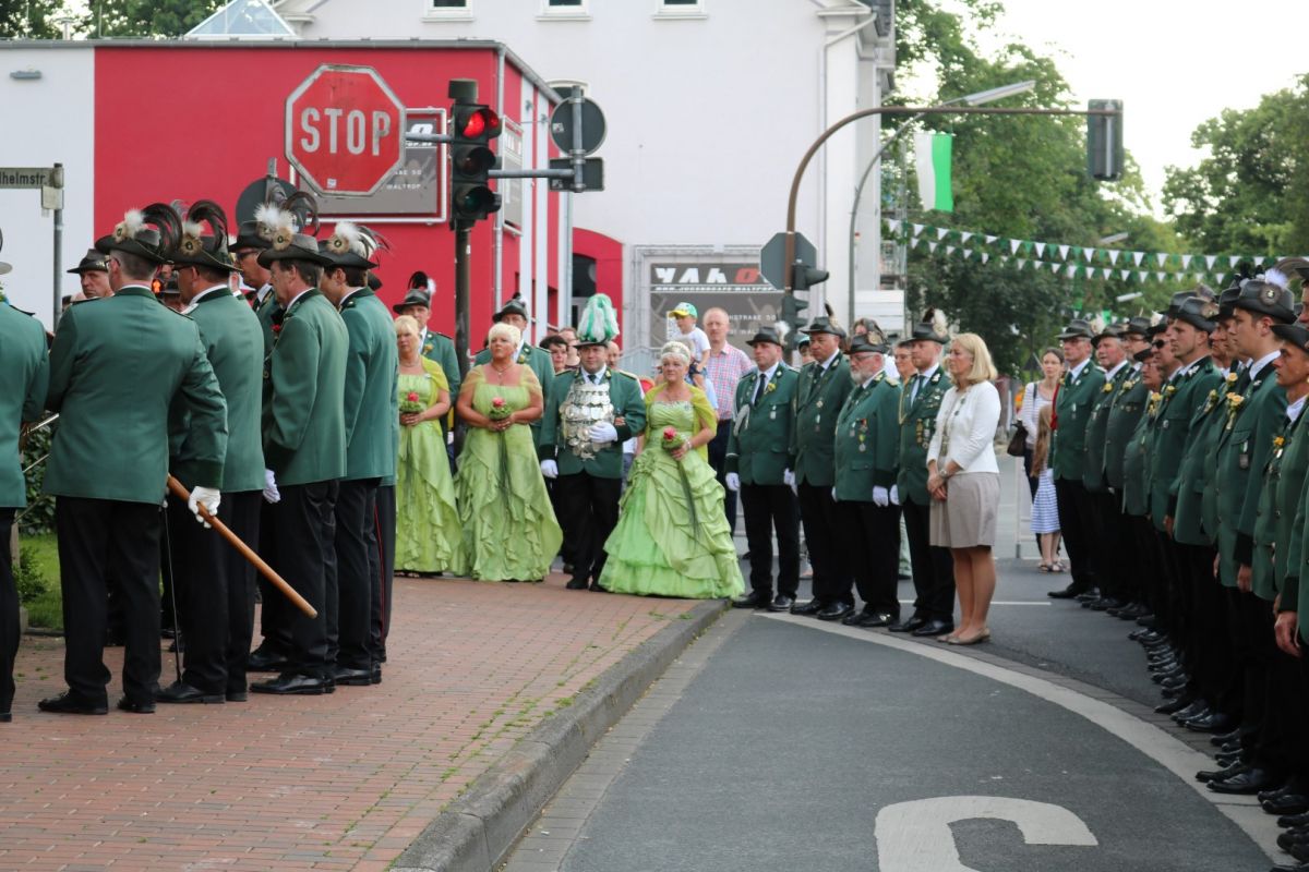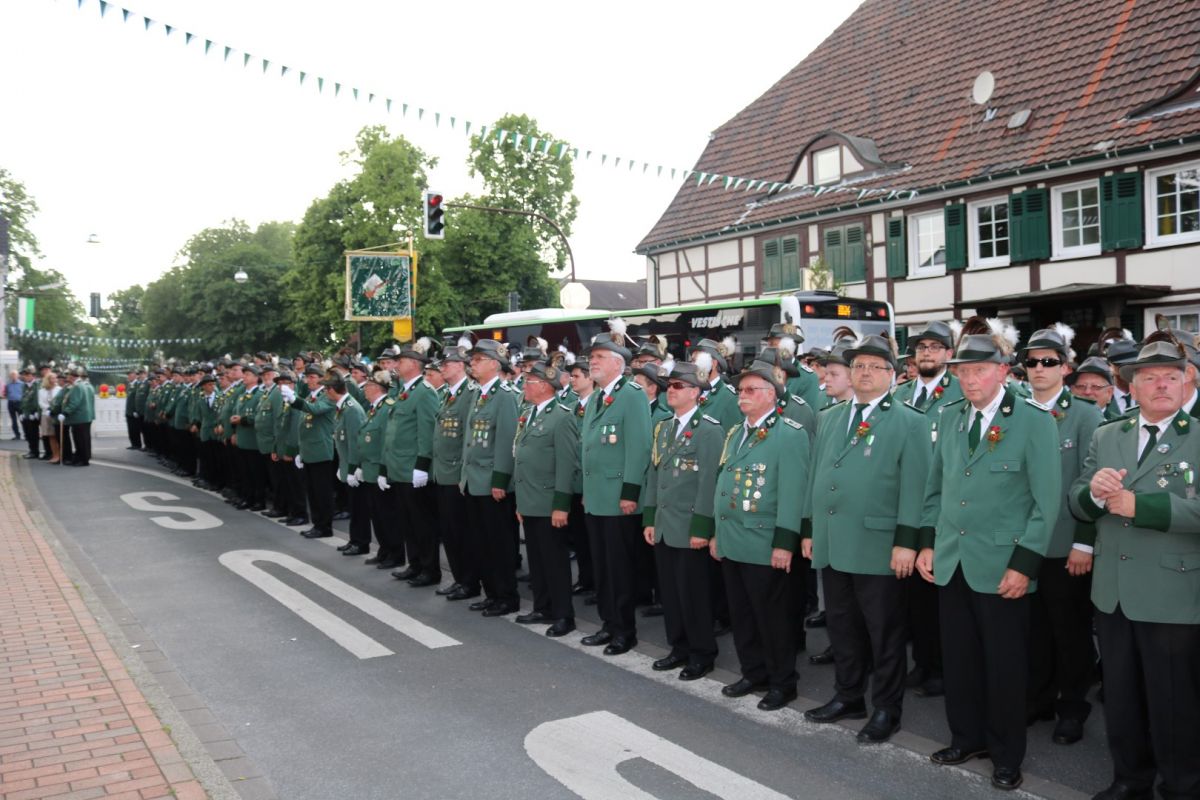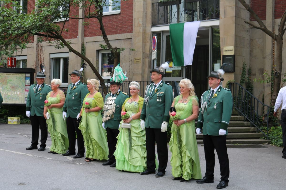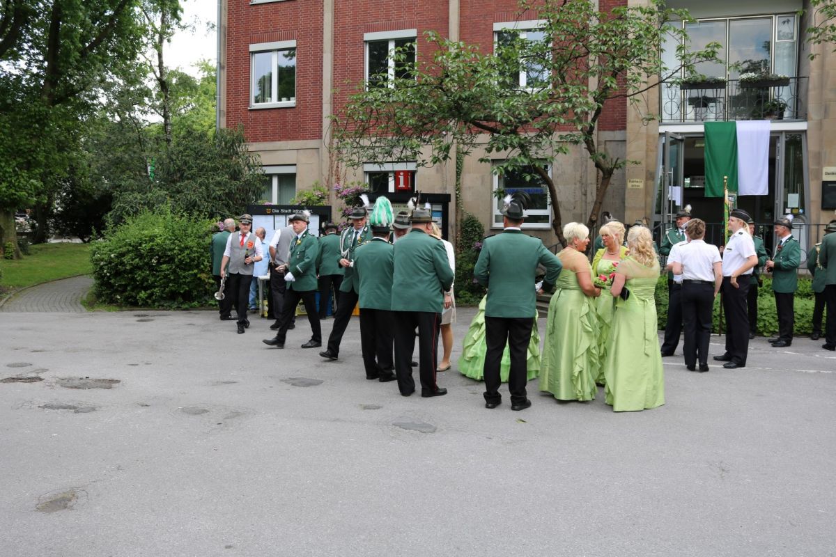 Der offizielle Beginn erfolgte für das Königspaar, den Bataillonsvorstand und die Fahne gegen 16:30 Uhr am Rathaus. Zusammen mit Bürgermeisterin Nicole Moenikes wurden dort sowohl die Heimatklänge Waltrop, als auch die Elmenhorster Blaskapelle empfangen. Nach kurzem Aufenthalt und einer Erfrischung für den bevorstehenden Umzug folgte ein Marsch durch die Stadt, damit die jeweiligen Kompanien sich in korrekter Reihenfolge in den Zug einreihen konnten, um anschließend zum Stutenteich zu marschieren.