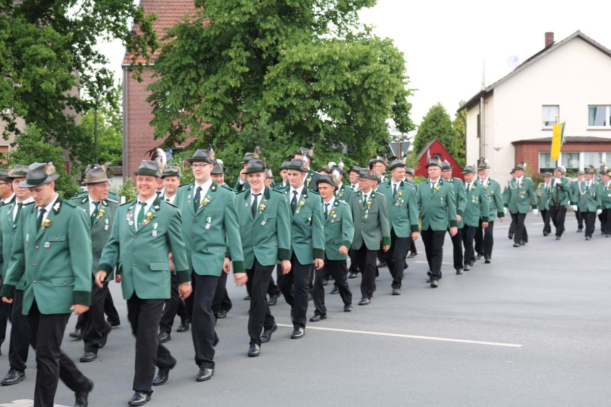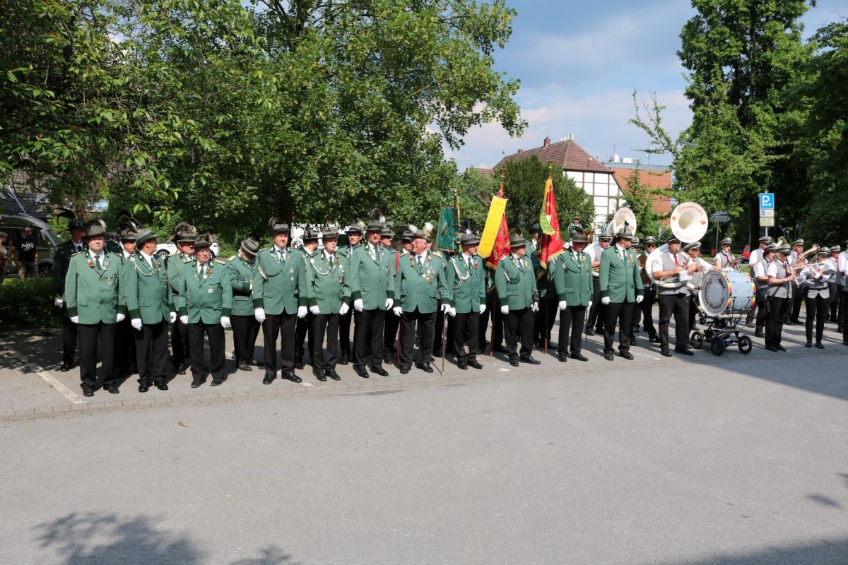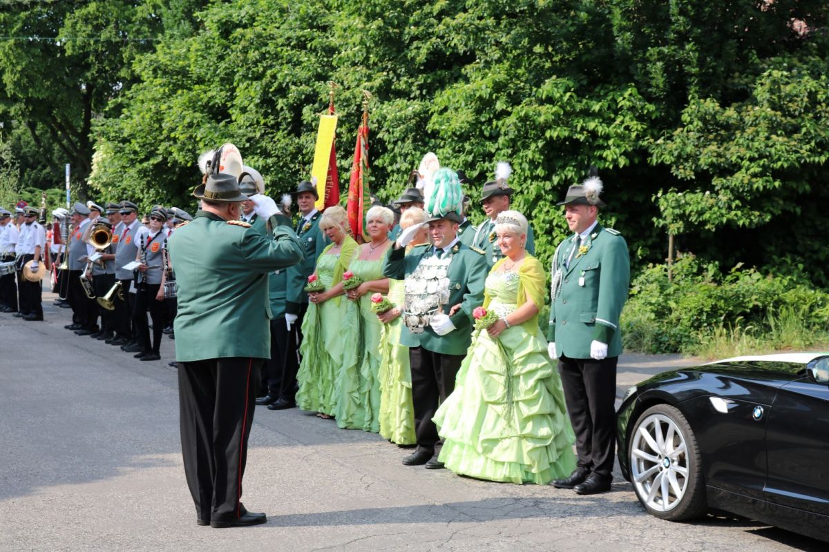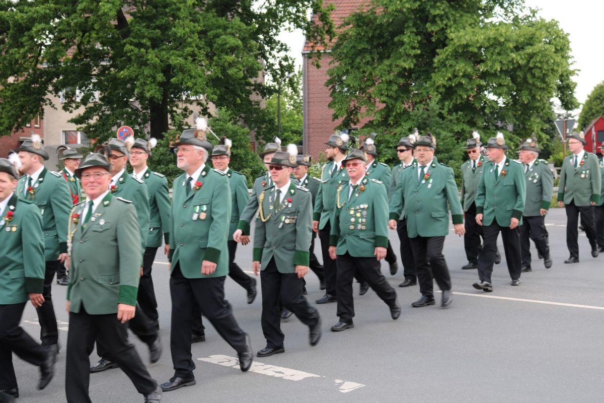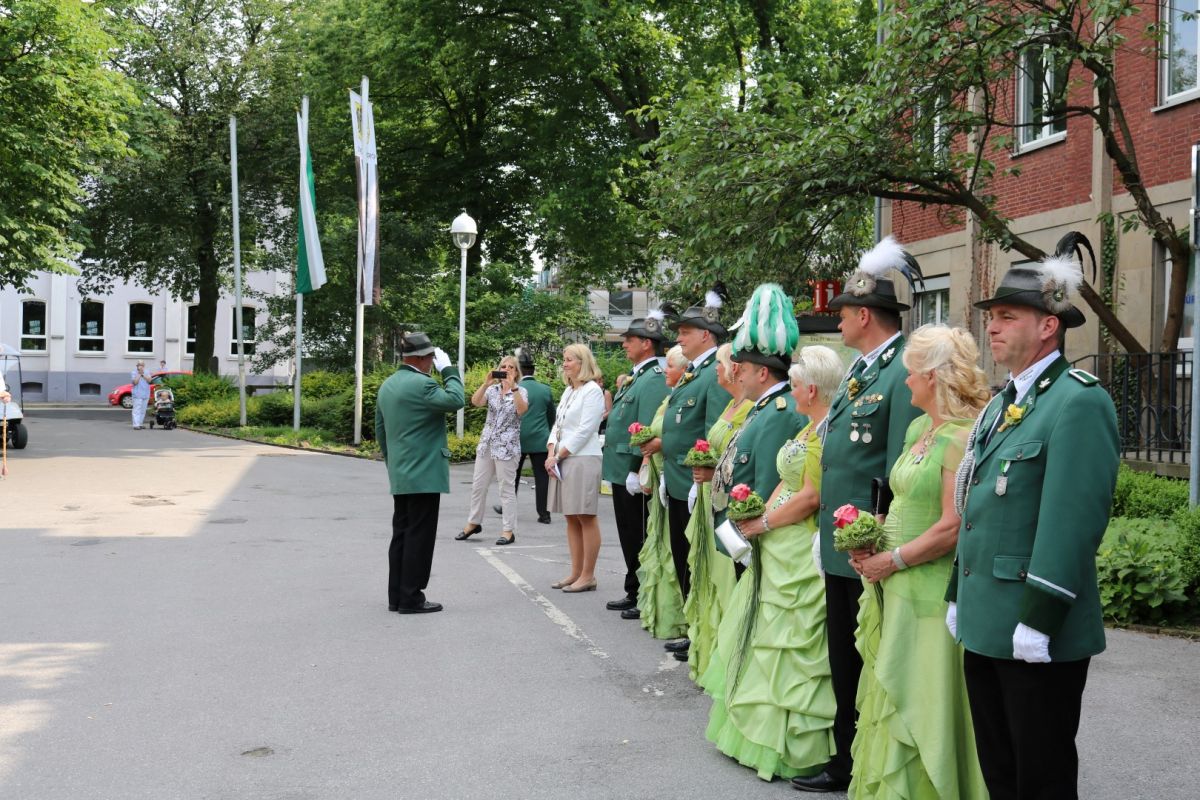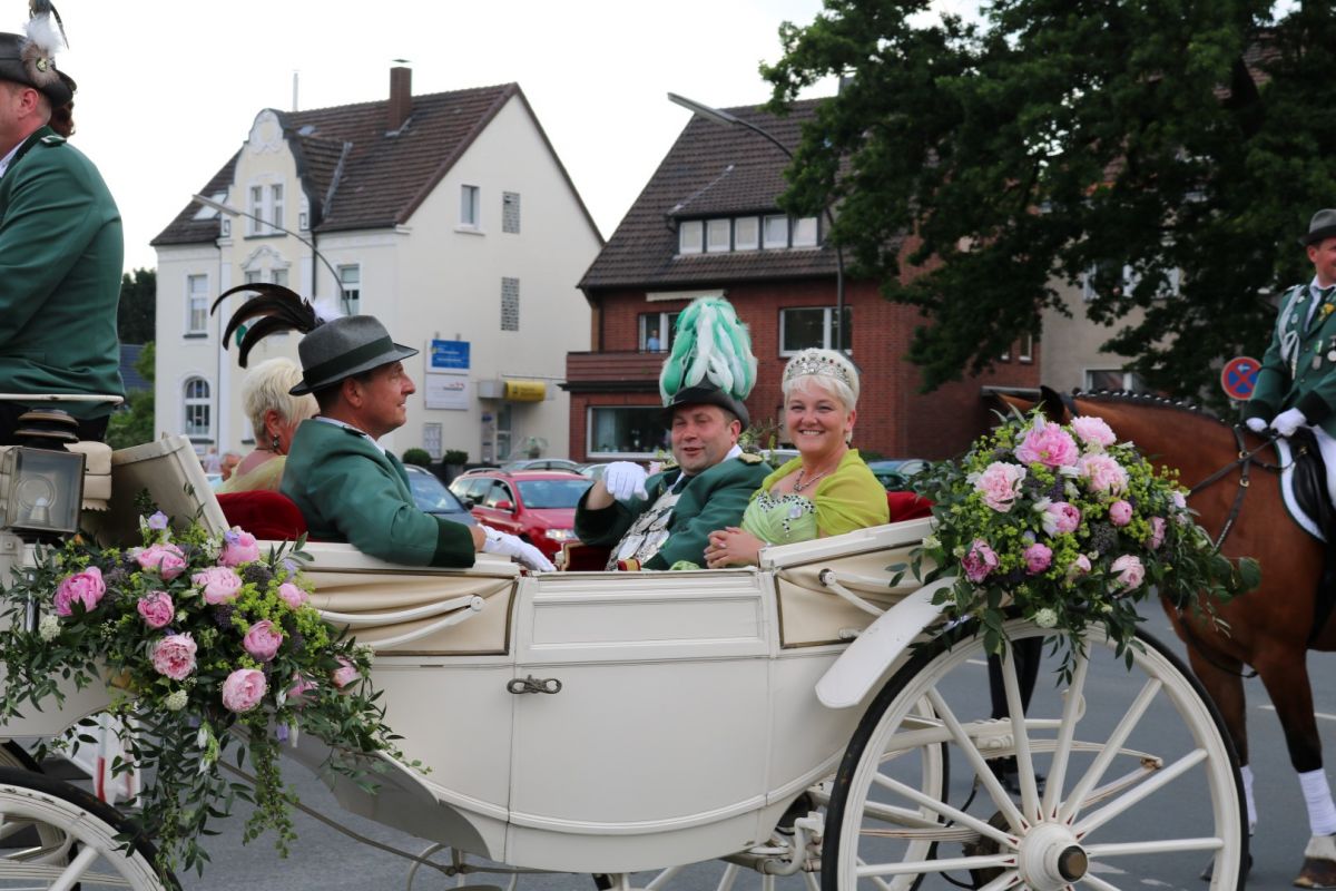 Der offizielle Beginn erfolgte für das Königspaar, den Bataillonsvorstand und die Fahne gegen 16:30 Uhr am Rathaus. Zusammen mit Bürgermeisterin Nicole Moenikes wurden dort sowohl die Heimatklänge Waltrop, als auch die Elmenhorster Blaskapelle empfangen. Nach kurzem Aufenthalt und einer Erfrischung für den bevorstehenden Umzug folgte ein Marsch durch die Stadt, damit die jeweiligen Kompanien sich in korrekter Reihenfolge in den Zug einreihen konnten, um anschließend zum Stutenteich zu marschieren.