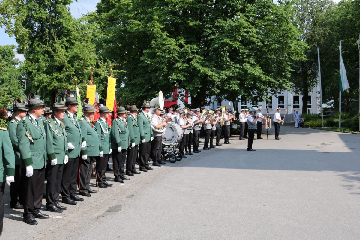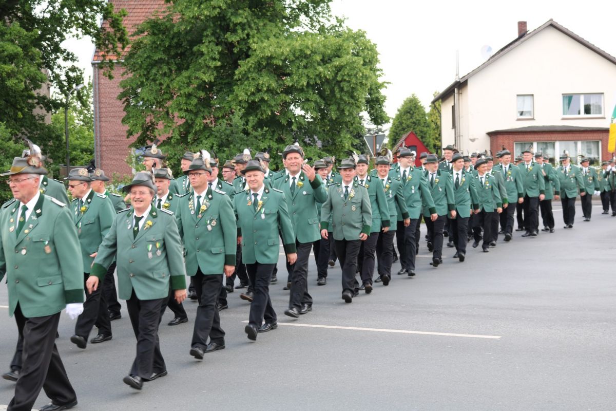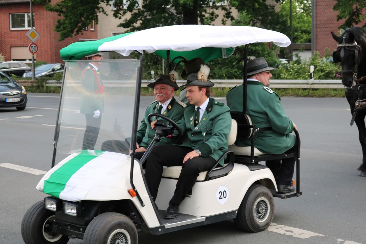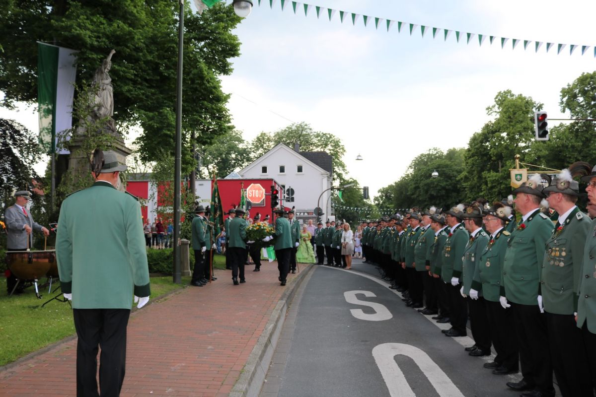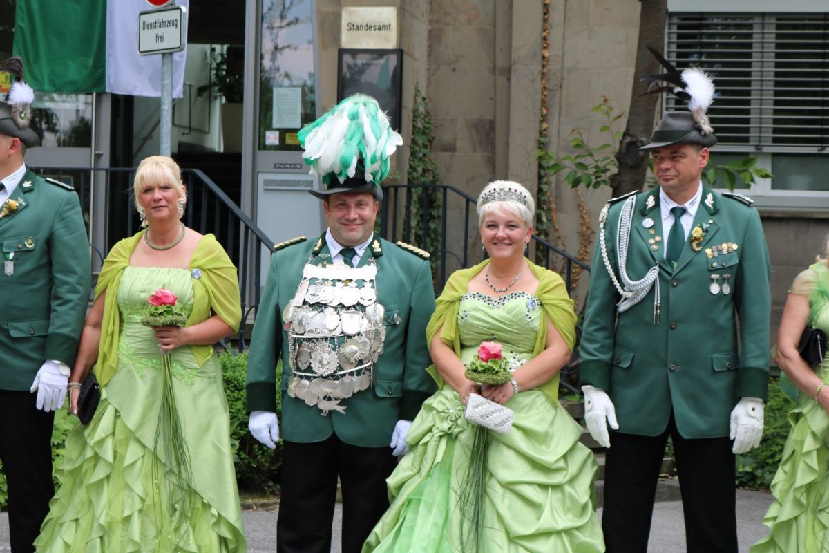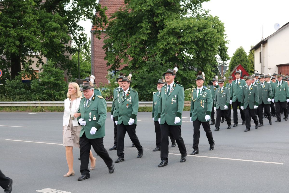 Der offizielle Beginn erfolgte für das Königspaar, den Bataillonsvorstand und die Fahne gegen 16:30 Uhr am Rathaus. Zusammen mit Bürgermeisterin Nicole Moenikes wurden dort sowohl die Heimatklänge Waltrop, als auch die Elmenhorster Blaskapelle empfangen. Nach kurzem Aufenthalt und einer Erfrischung für den bevorstehenden Umzug folgte ein Marsch durch die Stadt, damit die jeweiligen Kompanien sich in korrekter Reihenfolge in den Zug einreihen konnten, um anschließend zum Stutenteich zu marschieren.