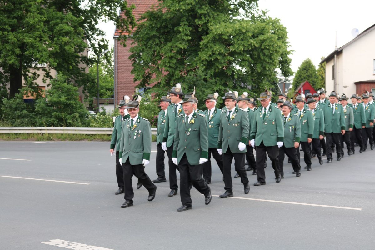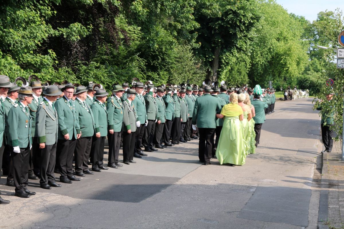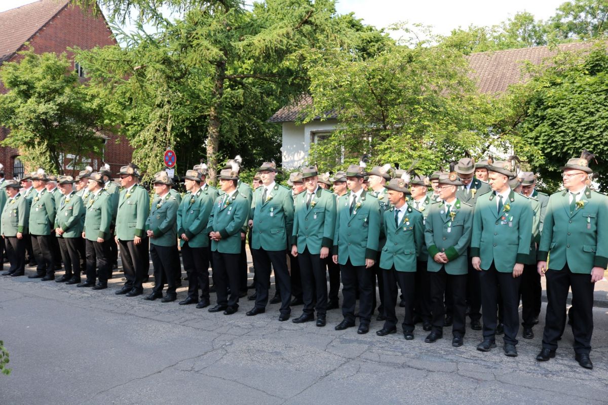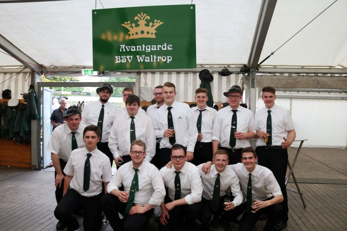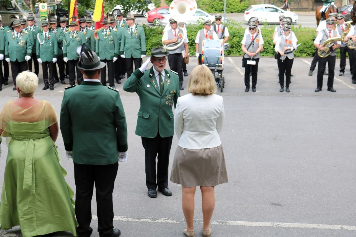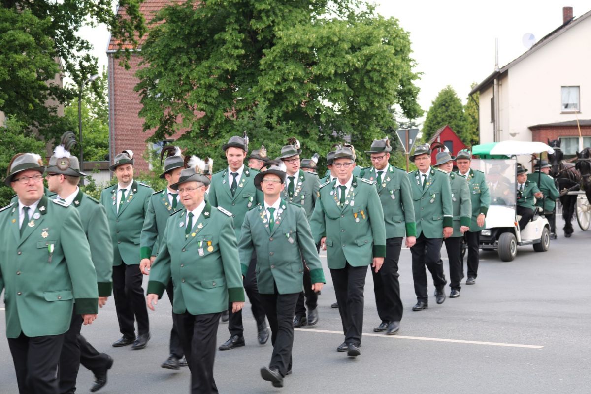 Der offizielle Beginn erfolgte für das Königspaar, den Bataillonsvorstand und die Fahne gegen 16:30 Uhr am Rathaus. Zusammen mit Bürgermeisterin Nicole Moenikes wurden dort sowohl die Heimatklänge Waltrop, als auch die Elmenhorster Blaskapelle empfangen. Nach kurzem Aufenthalt und einer Erfrischung für den bevorstehenden Umzug folgte ein Marsch durch die Stadt, damit die jeweiligen Kompanien sich in korrekter Reihenfolge in den Zug einreihen konnten, um anschließend zum Stutenteich zu marschieren.