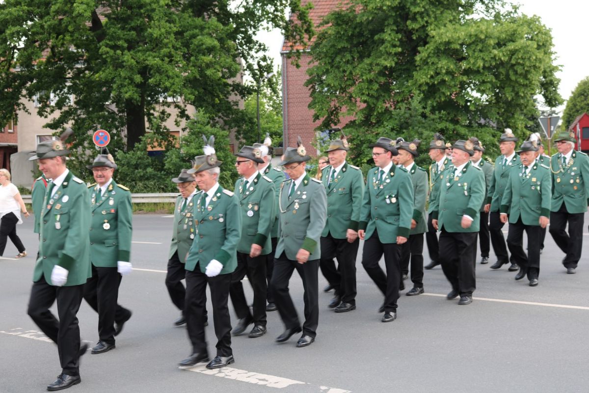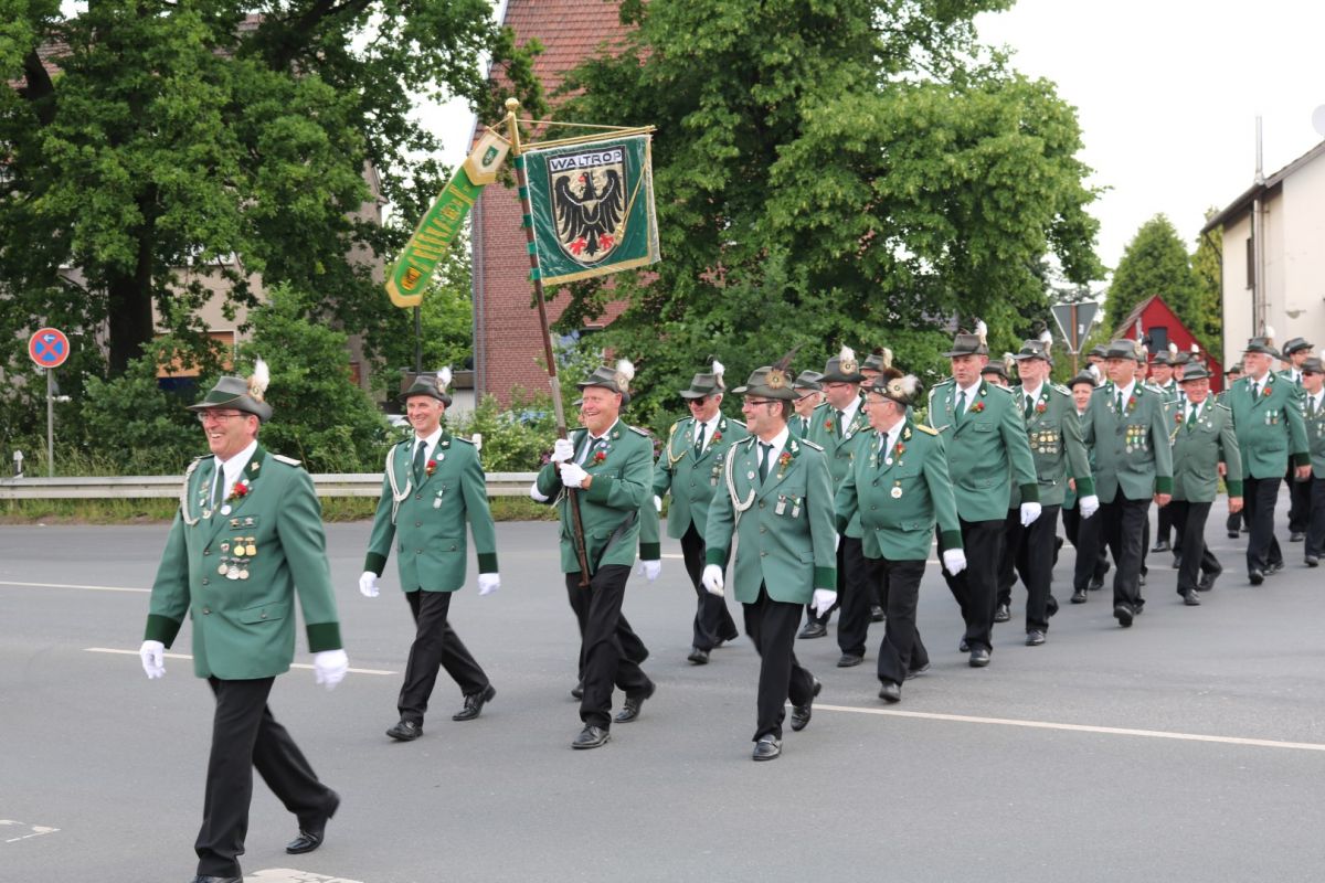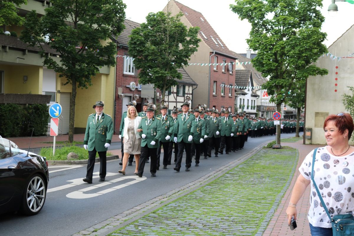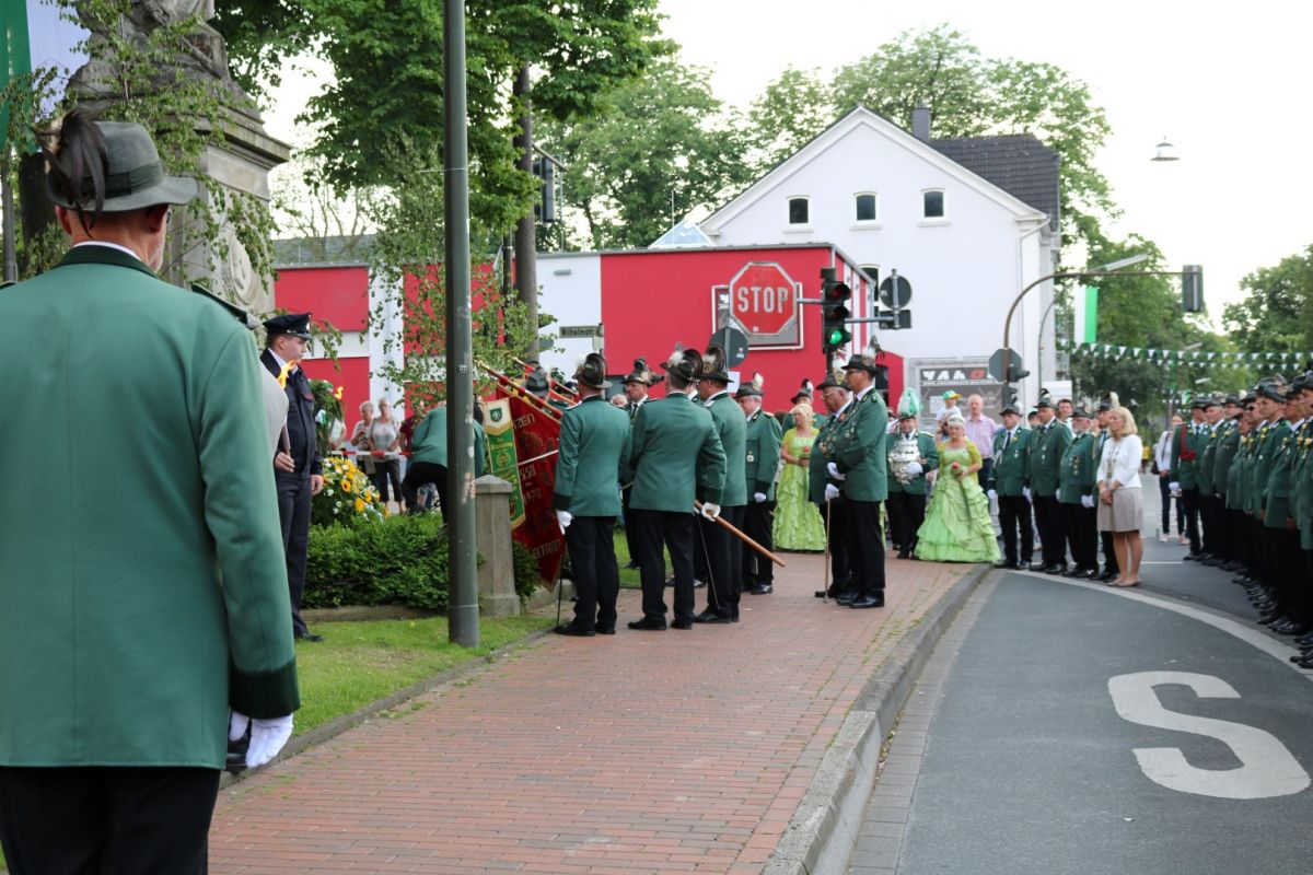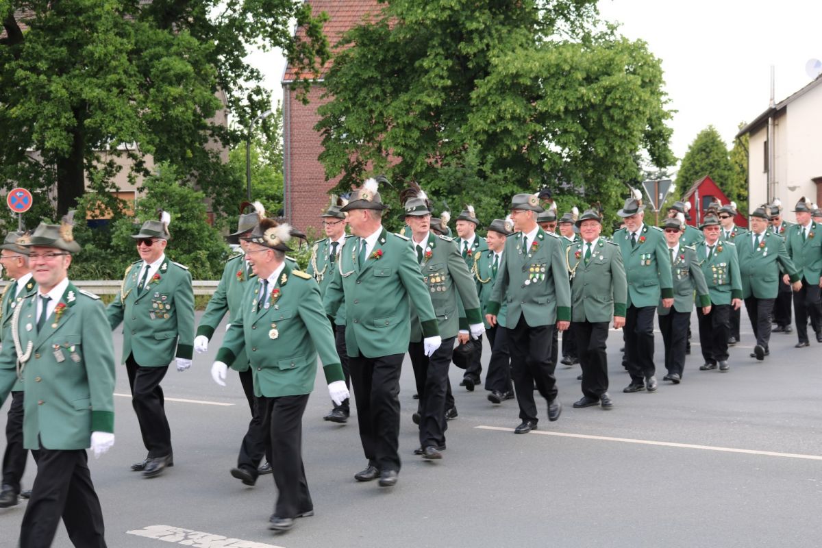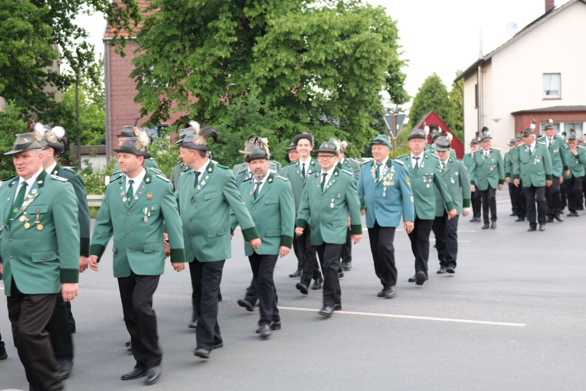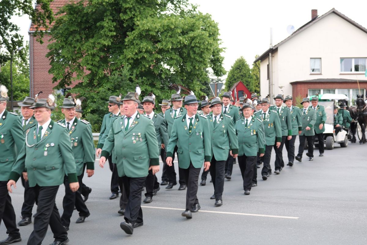Der offizielle Beginn erfolgte für das Königspaar, den Bataillonsvorstand und die Fahne gegen 16:30 Uhr am Rathaus. Zusammen mit Bürgermeisterin Nicole Moenikes wurden dort sowohl die Heimatklänge Waltrop, als auch die Elmenhorster Blaskapelle empfangen. Nach kurzem Aufenthalt und einer Erfrischung für den bevorstehenden Umzug folgte ein Marsch durch die Stadt, damit die jeweiligen Kompanien sich in korrekter Reihenfolge in den Zug einreihen konnten, um anschließend zum Stutenteich zu marschieren.