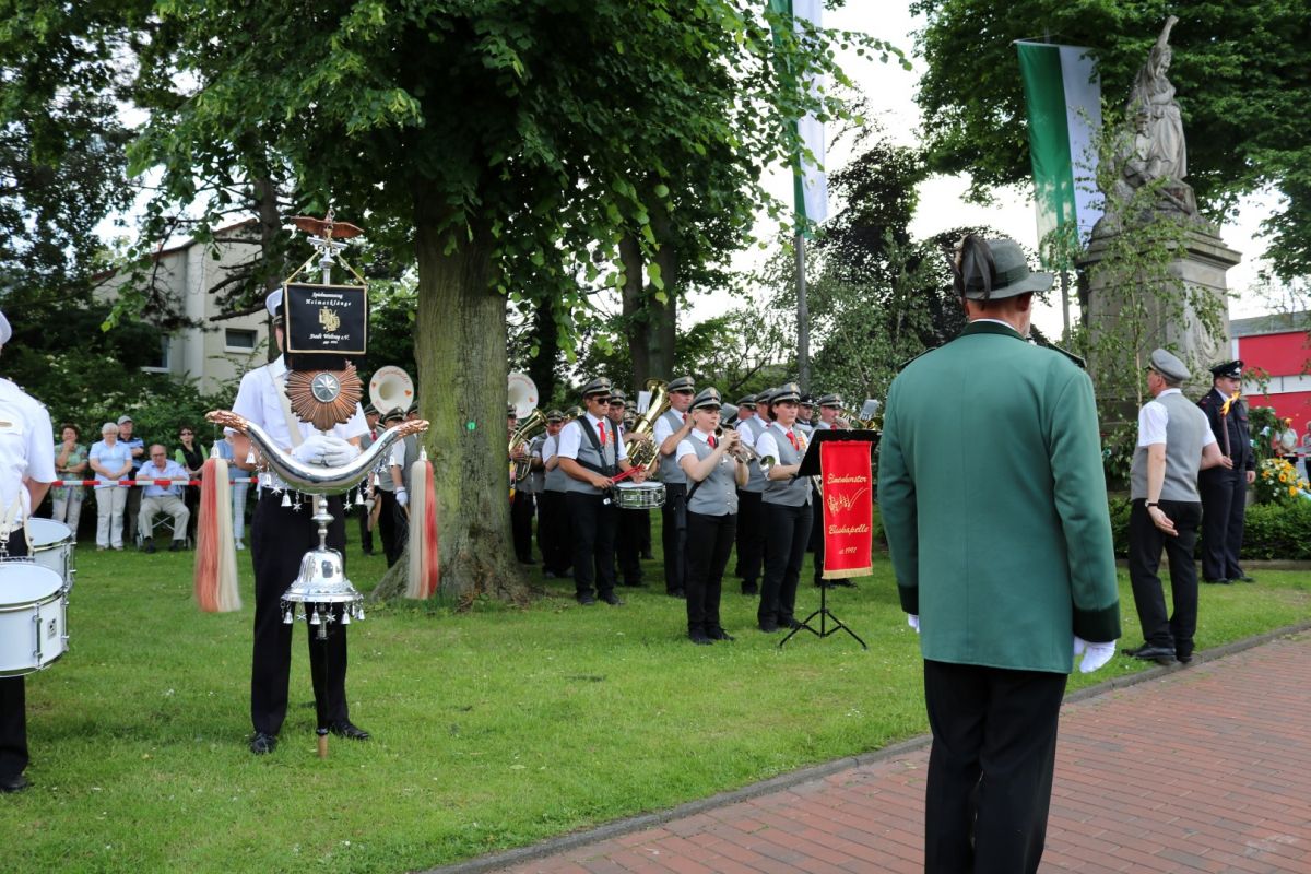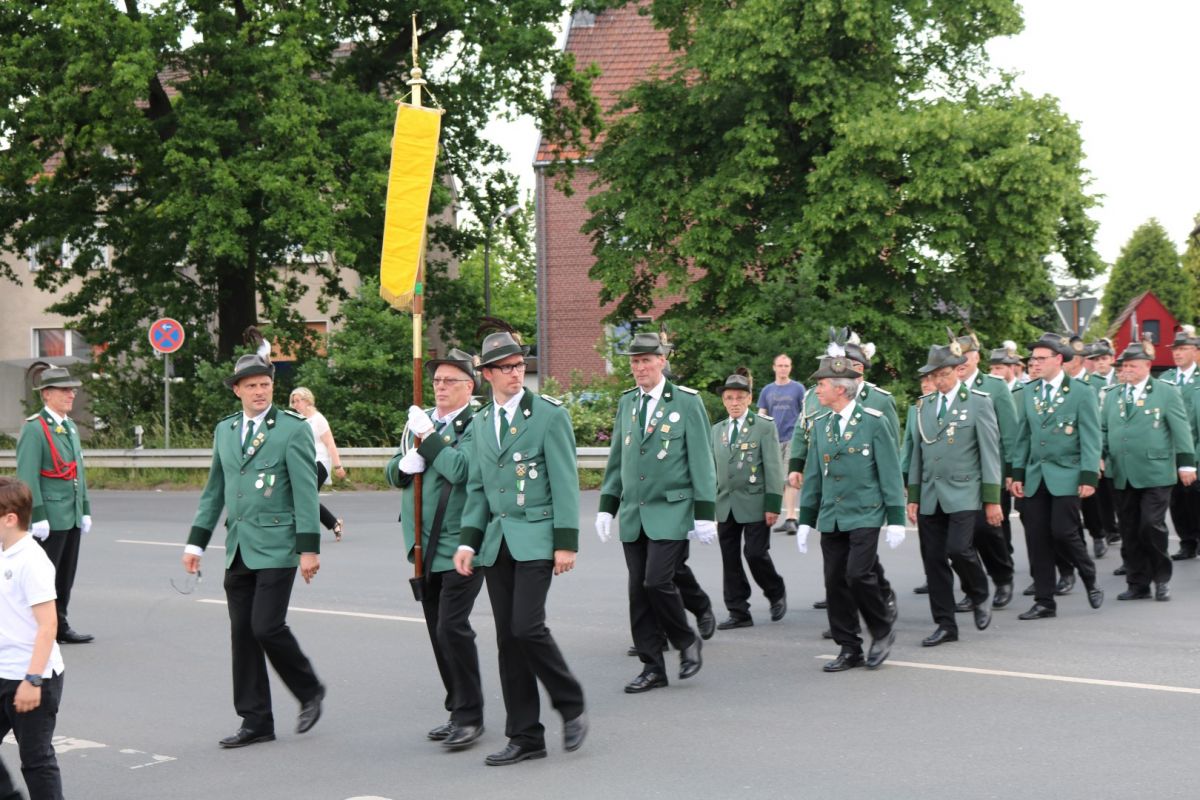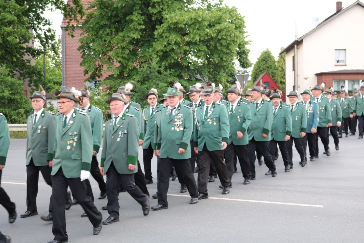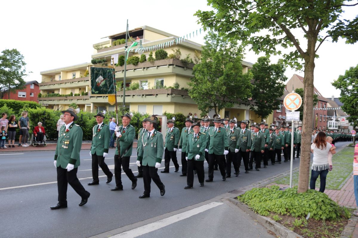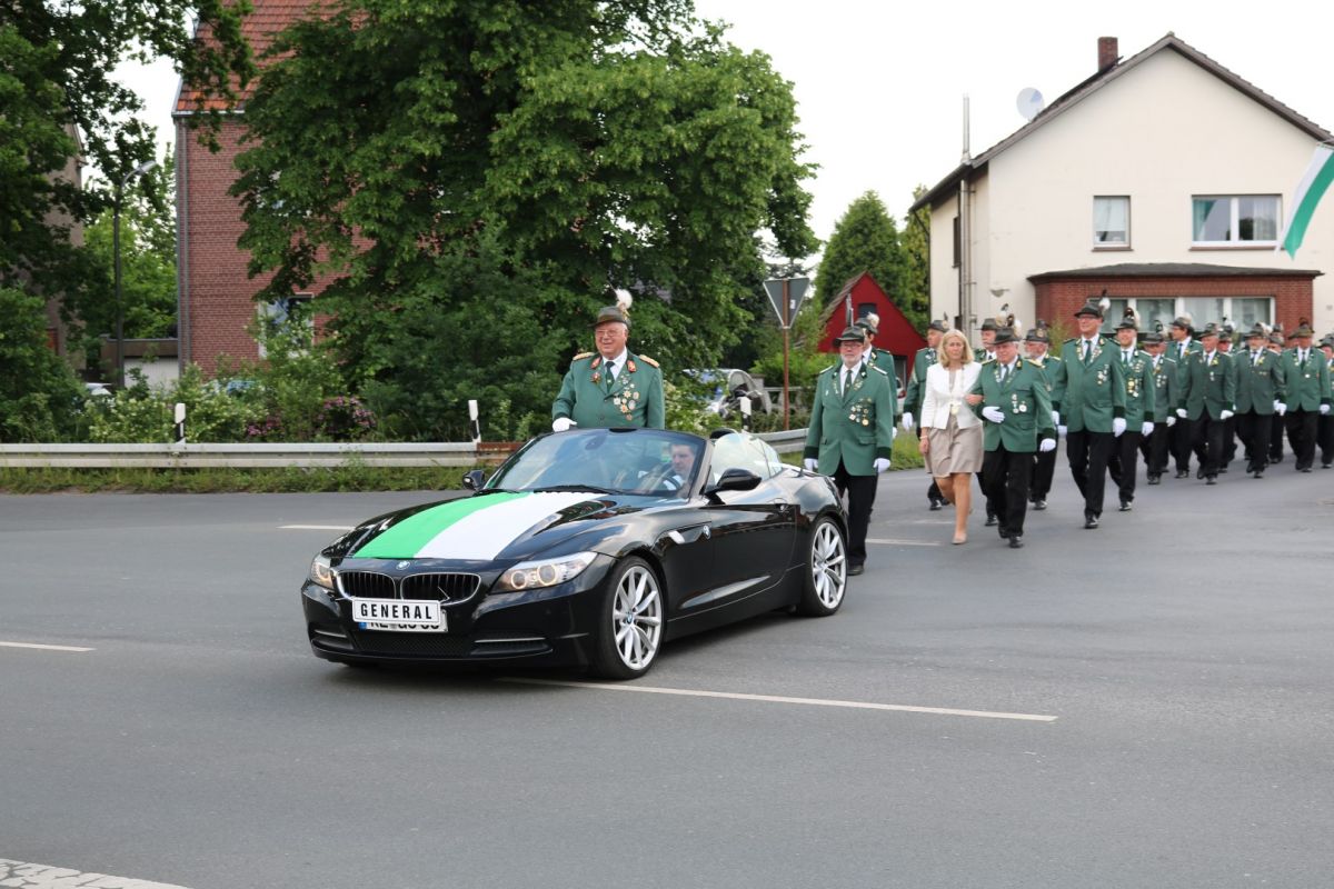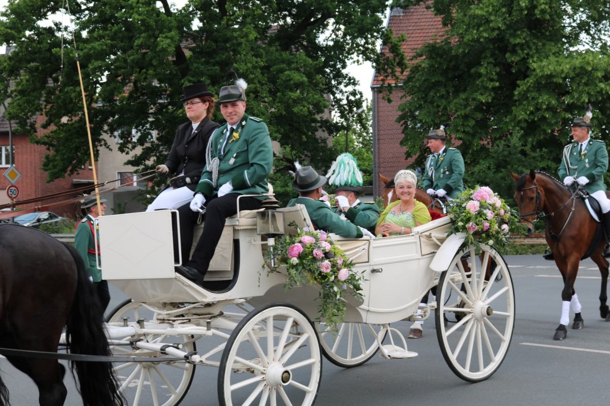 Der offizielle Beginn erfolgte für das Königspaar, den Bataillonsvorstand und die Fahne gegen 16:30 Uhr am Rathaus. Zusammen mit Bürgermeisterin Nicole Moenikes wurden dort sowohl die Heimatklänge Waltrop, als auch die Elmenhorster Blaskapelle empfangen. Nach kurzem Aufenthalt und einer Erfrischung für den bevorstehenden Umzug folgte ein Marsch durch die Stadt, damit die jeweiligen Kompanien sich in korrekter Reihenfolge in den Zug einreihen konnten, um anschließend zum Stutenteich zu marschieren.